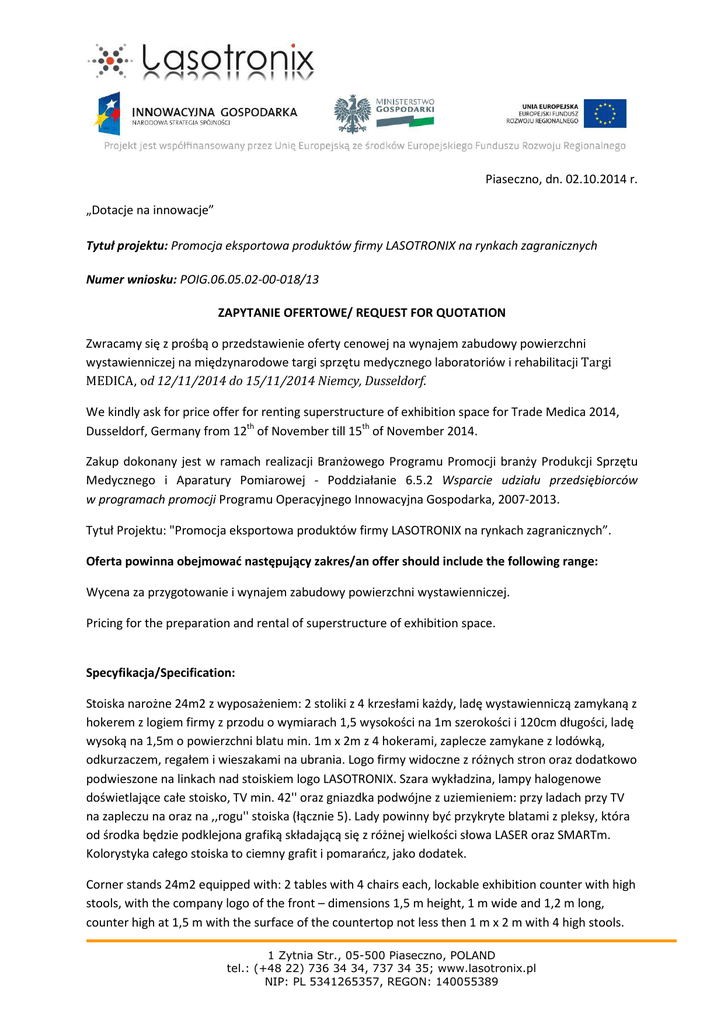 Piaseczno, dn. 02.10.2014 r. „Dotacje na innowacje” Tytuł projektu: Promocja eksportowa produktów firmy LASOTRONIX na rynkach zagranicznych Numer wniosku: POIG.06.05.02-00-018/13 ZAPYTANIE OFERTOWE/ REQUEST FOR QUOTATION Zwracamy się z prośbą o przedstawienie oferty cenowej na wynajem zabudowy powierzchni wystawienniczej na międzynarodowe targi sprzętu medycznego laboratoriów i rehabilitacji Targi MEDICA, od 12/11/2014 do 15/11/2014 Niemcy, Dusseldorf. We kindly ask for price offer for renting superstructure of exhibition space for Trade Medica 2014, Dusseldorf, Germany from 12th of November till 15th of November 2014. Zakup dokonany jest w ramach realizacji Branżowego Programu Promocji branży Produkcji Sprzętu Medycznego i Aparatury Pomiarowej - Poddziałanie 6.5.2 Wsparcie udziału przedsiębiorców w programach promocji Programu Operacyjnego Innowacyjna Gospodarka, 2007-2013. Tytuł Projektu: "Promocja eksportowa produktów firmy LASOTRONIX na rynkach zagranicznych”. Oferta powinna obejmować następujący zakres/an offer should include the following range: Wycena za przygotowanie i wynajem zabudowy powierzchni wystawienniczej. Pricing for the preparation and rental of superstructure of exhibition space. Specyfikacja/Specification: Stoiska narożne 24m2 z wyposażeniem: 2 stoliki z 4 krzesłami każdy, ladę wystawienniczą zamykaną z hokerem z logiem firmy z przodu o wymiarach 1,5 wysokości na 1m szerokości i 120cm długości, ladę wysoką na 1,5m o powierzchni blatu min. 1m x 2m z 4 hokerami, zaplecze zamykane z lodówką, odkurzaczem, regałem i wieszakami na ubrania. Logo firmy widoczne z różnych stron oraz dodatkowo podwieszone na linkach nad stoiskiem logo LASOTRONIX. Szara wykładzina, lampy halogenowe doświetlające całe stoisko, TV min. 42'' oraz gniazdka podwójne z uziemieniem: przy ladach przy TV na zapleczu na oraz na ,,rogu'' stoiska (łącznie 5). Lady powinny być przykryte blatami z pleksy, która od środka będzie podklejona grafiką składającą się z różnej wielkości słowa LASER oraz SMARTm. Kolorystyka całego stoiska to ciemny grafit i pomarańcz, jako dodatek. Corner stands 24m2 equipped with: 2 tables with 4 chairs each, lockable exhibition counter with high stools, with the company logo of the front – dimensions 1,5 m height, 1 m wide and 1,2 m long, counter high at 1,5 m with the surface of the countertop not less then 1 m x 2 m with 4 high stools. 1 Zytnia Str., 05-500 Piaseczno, POLAND tel.: (+48 22) 736 34 34, 737 34 35; www.lasotronix.pl NIP: PL 5341265357, REGON: 140055389 Facility: closed with a refrigerator, a vacuum cleaner, shelf and clothes hangers. Company logo – LASOTRONIX - visable from different angles and also suspended on ropes above the stand. Gray carpet, halogen lamps illuminates the entire stand. TV not less than 42” and double socket with earthing – next to the each counter, next to TV, on backstage and on the “corner” of the stand (5 in total). Counters should be covered with Plexiglas, behind it there will be a graphics made up of various sizes of words: laser and SMARTm. The colors of the whole stand is dark graphite and orange as a supplement. Złożona oferta powinna zawierać/an offer should consist: - nazwę i adres oferenta/name and address of the tenderer. - datę sporządzenia/date of issue - cenę całkowitą netto i brutto/total price net and gross, - termin ważności oferty/validity of the offer, - warunki i termin płatności/payment terms, Oferta powinna być sporządzona na papierze firmowym oferenta lub opatrzona pieczątką firmową, posiadać datę sporządzenia oraz powinna być podpisana przez oferenta. Oferta powinna być przesłana za pośrednictwem poczty elektronicznej na adres: [email protected], faksem na numer: +48 22 736 34 34, przesłana za pośrednictwem poczty na adres: LASOTRONIX ul. Żytnia 1, 05-500 Piaseczno lub dostarczona do siedziby zamawiającego pod adres: ul. Żytnia 1, 05-500 Piaseczno . An offer should be written on letterhead stamped and signed by tenderer and hale validity dates. It should be sent to: [email protected], by fax +48 22 736 34 34, sent by post to: LASOTRONIX ul. Żytnia 1, 05-500 Piaseczno lub or be delivered to office: ul. Żytnia 1, 05-500 Piaseczno. Zapytanie ofertowe zamieszczono w siedzibie zamawiającego mieszczącej się przy ul. Żytnia 1, 05-500 Piaseczno oraz na stronie internetowej www.lasotronix.pl. This request is hanged out in headquarters in 05-500 Piaseczno, Żytnia 1 street and published on website www.lasotronix.pl Oferta powinna być ważna i wiązać oferentów do momentów wyboru najkorzystniejszej oferty. The offer should be valid and bind bidders till choose of the most advantageous tender.. Termin składania ofert upływa/Deadline for submission of the offer expires on: 08.10.2014 roku do godz. 14:00. 1 Zytnia Str., 05-500 Piaseczno, POLAND tel.: (+48 22) 736 34 34, 737 34 35; www.lasotronix.pl NIP: PL 5341265357, REGON: 140055389 Wybór najkorzystniejszej oferty nastąpi w oparciu o następujące kryteria/ offer will be selected based on the: Lp. 1 2 3 4 Nazwa/name Cena/price Projekt i wykonanie/design and realization Dotychczasowa współpraca/current cooperation Doświadczenie w realizacji podobnych projektów/experience with similar projects Razem/Total Waga - Ilość punktów/points 50 25 15 10 100 Wybór oferty dokumentowany zostanie protokołem, do którego załączone zostaną zebrane oferty/selection of the offer will be documented by the protocole with collected offers. Zamawiający wybierze najkorzystniejszą ofertę, która uzyska najwyższą ilość punktów w oparciu o ustalone kryteria i podpisze umowę z wybranym wykonawcą/Purchaser will select the best offer that obtains the highest number of points based on the established criteria and sign a contrach with selected contractor. Z poważaniem 1 Zytnia Str., 05-500 Piaseczno, POLAND tel.: (+48 22) 736 34 34, 737 34 35; www.lasotronix.pl NIP: PL 5