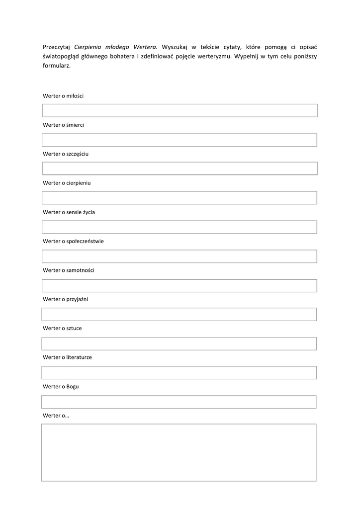 Przeczytaj Cierpienia młodego Wertera. Wyszukaj w tekście cytaty, które pomogą ci opisać światopogląd głównego bohatera i zdefiniować pojęcie werteryzmu. Wypełnij w tym celu poniższy formularz. Werter o miłości Werter o śmierci Werter o szczęściu Werter o cierpieniu Werter o sensie życia Werter o społeczeństwie Werter o samotności Werter o przyjaźni Werter o sztuce Werter o literaturze Werter o Bogu Werter o…