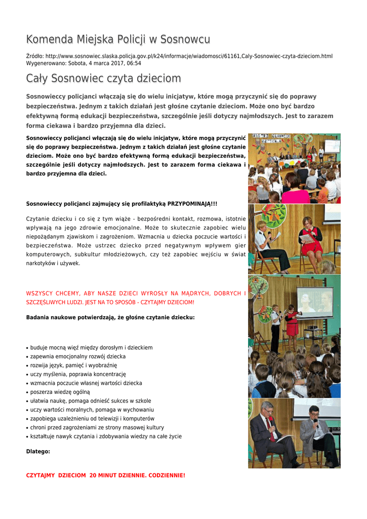 Komenda Miejska Policji w Sosnowcu Źródło: http://www.sosnowiec.slaska.policja.gov.pl/k24/informacje/wiadomosci/61161,Caly-Sosnowiec-czyta-dzieciom.html Wygenerowano: Sobota, 4 marca 2017, 06:54 Cały Sosnowiec czyta dzieciom Sosnowieccy policjanci włączają się do wielu inicjatyw, które mogą przyczynić się do poprawy bezpieczeństwa. Jednym z takich działań jest głośne czytanie dzieciom. Może ono być bardzo efektywną formą edukacji bezpieczeństwa, szczególnie jeśli dotyczy najmłodszych. Jest to zarazem forma ciekawa i bardzo przyjemna dla dzieci. Sosnowieccy policjanci włączają się do wielu inicjatyw, które mogą przyczynić się do poprawy bezpieczeństwa. Jednym z takich działań jest głośne czytanie dzieciom. Może ono być bardzo efektywną formą edukacji bezpieczeństwa, szczególnie jeśli dotyczy najmłodszych. Jest to zarazem forma ciekawa i bardzo przyjemna dla dzieci. Sosnowieccy policjanci zajmujący się profilaktyką PRZYPOMINAJĄ!!! Czytanie dziecku i co się z tym wiąże - bezpośredni kontakt, rozmowa, istotnie wpływają na jego zdrowie emocjonalne. Może to skutecznie zapobiec wielu niepożądanym zjawiskom i zagrożeniom. Wzmacnia u dziecka poczucie wartości i bezpieczeństwa. Może ustrzec dziecko przed negatywnym wpływem gier komputerowych, subkultur młodzieżowych, czy też zapobiec wejściu w świat narkotyków i używek. WSZYSCY CHCEMY, ABY NASZE DZIECI WYROSŁY NA MĄDRYCH, DOBRYCH I SZCZĘŚLIWYCH LUDZI. JEST NA TO SPOSÓB - CZYTAJMY DZIECIOM! Badania naukowe potwierdzają, że głośne czytanie dziecku: ● buduje mocną więź między dorosłym i dzieckiem ● zapewnia emocjonalny rozwój dziecka ● rozwija język, pamięć i wyobraźnię ● uczy myślenia, poprawia koncentrację ● wzmacnia poczucie własnej wartości dziecka ● poszerza wiedzę ogólną ● ułatwia naukę, pomaga odnieść sukces w szkole ● uczy wartości moralnych, pomaga w wychowaniu ● zapobiega uzależnieniu od telewizji i komputerów ● chroni przed zagrożeniami ze strony masowej kultury ● kształtuje nawyk czytania i zdobywania wiedzy na całe życie Dlatego: CZYTAJMY DZIECIOM 20 MINUT DZIENNIE. CODZIENNIE! - Czytanie na głos niemowlęciu stymuluje rozwój jego mózgu. - Czytanie kilkulatkowi rozbudza w nim ciekawość świata i pomaga mu zrozumieć siebie i innych. - Wspólne głośne czytanie z nastolatkiem pomoże mu pokonać wiele problemów wieku dorastania. Impreza finałowa „Mistrz głośnego czytania”, która odbyła się już po raz piąty w Szkole Podstawowej nr 10 w Sosnowcu, przebiegła pod hasłem „Narodowego Czytania Aleksandra Fredry”. Sam konkurs „Mistrz głośnego czytania” odbył się w dniach 21 i 22 października br. W wyniku zaciętej rywalizacji wyłoniono wówczas zwycięzców w trzech kategoriach wiekowych. Wczoraj wręczono dzieciom nagrody i wyróżnienia. Uroczystość uświetnili wyjątkowi goście, którzy włączyli się aktywnie do kampanii „Cała polska czyta dzieciom”. Oprócz rzecznika sosnowieckiej Policji dzieciom czytali także: Prezydent Sosnowca, Dyrektorzy Teatru Zagłębia i Miejskiej Biblioteki Publicznej, Komendant sosnowieckiego Hufca ZHP, koordynator wojewódzki Fundacji ABCXXI "Cała Polska czyta dzieciom" i dziennikarka „Wiadomości Zagłębia”. Zainstaluj wtyczkę Flash, aby zobaczyć odtwarzacz. pobierz film - 5.37 MB Ocena: 0/5 (0) Tweetnij