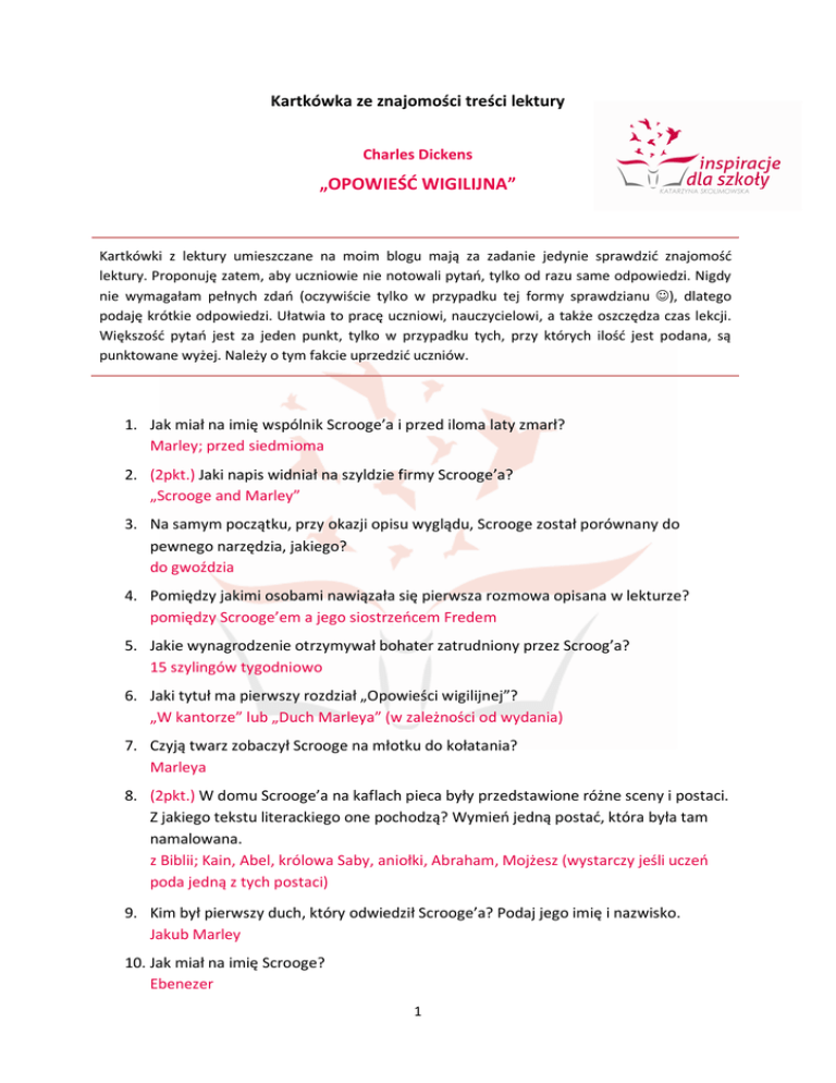Kartkówka ze znajomości treści lektury Charles Dickens „OPOWIEŚĆ WIGILIJNA” Kartkówki z lektury umieszczane na moim blogu mają za zadanie jedynie sprawdzić znajomość lektury. Proponuję zatem, aby uczniowie nie notowali pytań, tylko od razu same odpowiedzi. Nigdy nie wymagałam pełnych zdań (oczywiście tylko w przypadku tej formy sprawdzianu ), dlatego podaję krótkie odpowiedzi. Ułatwia to pracę uczniowi, nauczycielowi, a także oszczędza czas lekcji. Większość pytań jest za jeden punkt, tylko w przypadku tych, przy których ilość jest podana, są punktowane wyżej. Należy o tym fakcie uprzedzić uczniów. 1. Jak miał na imię wspólnik Scrooge’a i przed iloma laty zmarł? Marley; przed siedmioma 2. (2pkt.) Jaki napis widniał na szyldzie firmy Scrooge’a? „Scrooge and Marley” 3. Na samym początku, przy okazji opisu wyglądu, Scrooge został porównany do pewnego narzędzia, jakiego? do gwoździa 4. Pomiędzy jakimi osobami nawiązała się pierwsza rozmowa opisana w lekturze? pomiędzy Scrooge’em a jego siostrzeńcem Fredem 5. Jakie wynagrodzenie otrzymywał bohater zatrudniony przez Scroog’a? 15 szylingów tygodniowo 6. Jaki tytuł ma pierwszy rozdział „Opowieści wigilijnej”? „W kantorze” lub „Duch Marleya” (w zależności od wydania) 7. Czyją twarz zobaczył Scrooge na młotku do kołatania? Marleya 8. (2pkt.) W domu Scrooge’a na kaflach pieca były przedstawione różne sceny i postaci. Z jakiego tekstu literackiego one pochodzą? Wymień jedną postać, która była tam namalowana. z Biblii; Kain, Abel, królowa Saby, aniołki, Abraham, Mojżesz (wystarczy jeśli uczeń poda jedną z tych postaci) 9. Kim był pierwszy duch, który odwiedził Scrooge’a? Podaj jego imię i nazwisko. Jakub Marley 10. Jak miał na imię Scrooge? Ebenezer 1 11. O jakiej nadziei dla Scrooge’a wspomina Marley? Przed czym go uprzedza? o tym, że nawiedzą go jeszcze trzy duchy 12. Kim był pierwszy duch według zapowiedzi Marleya? duch wszystkich ubiegłych wigilii Bożego Narodzenia 13. W jakiej książce był zaczytany mały Scrooge? w „Robinsonie Kruzoe” 14. Kim dla Scrooge’a była Funny? siostrą 15. Kim był drugi duch według zapowiedzi Marleya? duch obecnej wigilii Bożego Narodzenia 16. Jaką szczególną właściwość miały krople spadające z pochodni drugiego ducha? dawały pokój, zgodę, szczęście, zadowolenie 17. Gdzie w pierwszej kolejności duch przyszłości zabrał Scrooge’a? na giełdę w Londynie 18. (2pkt.) W jakim miejscu skończyła się przechadzka Scrooge’a i ducha przyszłości i co tam zobaczyli? na cmentarzu, grób Scrooge’a 19. Jakiego zakupu dokonał Scrooge zaraz po swojej przemianie? kupił wielkiego indyka 20. (2pkt.) Jakie słowa Chrystusa zostały przywołane na końcu opowieści? „Miłujcie się nawzajem” lub „Niech was wszystkich Bóg błogosławi (w zależności od przekładu; 2p. przyznaje się, gdy uczeń napisze cytat, 1p. gdy przywoła jego sens) 2