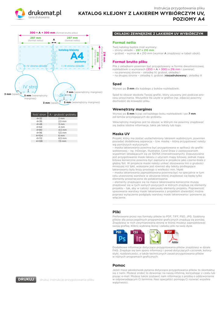 Exero od te feu feugiamet ad do odiamconsent augait la feugiam Instrukcja przygotowania pliku ero od te feu feugiamet ad do commod eu facilissed tin et lumKATALOG KLEJONY Z LAKIEREM WYBIÓRCZYM UV, drukomat.pl iamconsent augait la feugiam tanie drukowanie san henibh eum at dolut venit noPOZIOMY A4 mmod eu facilissed tin et lumstrud tat nulput prat, quamet lore n henibh eum at dolut venit note doloreet, vel dolesto dolenis ud tat nulput prat, lorebrutto pliku) 300 + Aquamet + 300 mm (format OKŁADKI ZEWNĘRZNE Z LAKIEREM UV WYBIÓRCZYM dit praessequate doloreet, vel 297 dolesto dolenis mm 297 mm A (format netto) (format netto) Format netto praessequate poziomy I i III strona okładki 5 mm (wewnętrzny margines) Format brutto pliku Plik z okładkami powinien być przygotowany w formie dwustronicowej rozkładówki o wymiarach (300 + A + 300) x 216 mm i zawierać: – na pierwszej stronie – okładkę IV, grzbiet, okładkę I – na drugiej stronie – okładkę II, grzbiet (niezadrukowany), okładkę III Wynosi po 3 mm dla każdego z boków rozkładówki. okładki 3 mm (spad) Twój katalog będzie miał wymiary: – strony okładki – 297 x 210 mm. – grzbiet – wymiar A x 210 mm (wymiar A znajdziesz w tabeli obok). Spad IV strona okładki 3 mm (spad) 216 mm II i IV strona okładki A4 210 mm katalog klejony drukomat.pl tanie drukowanie (format netto) Grzbiet, na okładce wewnętrznej niezadrukowany Exero od te feu feugiamet ad do odiamconsent augait la feugiam commod eu facilissed tin et lumsan henibh eum at dolut venit nostrud tat nulput prat, quamet lore te doloreet, vel dolesto dolenis dit praessequate (format brutto pliku) Exero od te feu feugiamet ad do odiamconsent augait la feugiam commod eu facilissed tin et lumsan henibh eum at dolut venit nostrud tat nulput prat, quamet lore te doloreet, vel dolesto dolenis dit praessequate 7 mm (wewnętrzny margines) 5 mm (wewnętrzny margines) Spad to obszar dookoła Twojej grafiki, który usuwany jest podczas procesu przycinania. Wszystkie tła użyte w grafice (np. zdjęcia) powinny dochodzić do krawędzi pliku. Wewnętrzny margines Ilość stron A - grubość grzbietu 4+32 4+36 4+48 4+64 4+80 4+96 4+104 4+112 4+128 2 mm 2,5 mm 3 mm 4 mm 4,5 mm 5,5 mm 6 mm 6,5 mm 7,5 mm Wynosi po 5 mm licząc od każdego boku rozkładówki i po 7 mm od łamów przylegających do grzbietu. Wewnętrzny margines jest to obszar, w którym nie powinny znajdować się żadne istotne informacje, takie jak teksty lub logo. Maska UV Projekt, który ma zostać uszlachetniony lakierem wybiórczym, powinien posiadać dodatkową separację – tzw. maskę – którą przygotować należy wg poniższych wytycznych: – maska lakierowania powinna być przygotowana w aplikacji do grafiki wektorowej – np. InDesign, Illustrator, Corel Draw z zastosowaniem wypełnień składających się ze 100%K (nierastrowanych). Dopuszczalne jest przygotowanie maski lakieru z użyciem mapy bitowej, jednak mapa bitowa koniecznie powinna być zapisana w projekcie jako czarno-biała z głębią 1bit. W projekcie maski należy unikać stosowania linii o grubości mniejszej niż 1pkt, wskazane jest również aby teksty podlegające lakierowaniu były kroju prostego o wielkości min. 14pkt – maska lakierowania zaprojektowana powinna być na specjalnie w tym celu utworzonej warstwie w obszarze której znajdować się będą tylko elementy przeznaczone do polakierowania – elementy znajdujące się na masce lakierowania koniecznie muszą znajdować się w tych samych pozycjach w których znajdują się elementy projektu – tak, aby w całości zakrywały elementy projektu. Poprawność spasowania warstwy maski lakierowania z projektem stwierdzić można poprzez wyłączenie podglądu warstwy maski lakierowania i ponowne jej włączenie. Pliki Preferowane przez nas formaty plików to PDF, TIFF, PSD, JPG. Szablony plików dla poszczególnych programów graficznych znajdują się poniżej. Znajdziesz w nich zwymiarowaną stronę w której możesz zaprojektować swoją grafikę. Kliknij wybraną ikonę i załaduj plik na swój dysk. Dodatkowe informacje dotyczące przygotowania plików znajdziesz w dziale FAQ. Znajduje się tam sporo informacji i porad dotyczących czcionek, kolorystyki, rozdzielczości, a także technicznych zasad przygotowania plików w różnych programach graficznych. Pomoc DRUKUJ drukuj instrukcję przygotowania pliku Jeżeli masz jakiekolwiek pytania dotyczące przygotowania plików to skontaktuj się z nami. Możesz zrobić to dzwoniąc na naszą infolinię, korzystając z czatu lub pisząc e-mail. Możesz także zostawić nam informację z prośbą o oddzwonienie w odpowiadającym Ci terminie. Nasi specjaliści pomogą Ci rozwiać wszelkie wątpliwości. Instrukcja przygotowania pliku KATALOG KLEJONY Z LAKIEREM WYBIÓRCZYM UV, ugiamet ad do drukomat.pl tanie drukowanie ait la feugiam POZIOMY A4 od da temaiguef uef et do orexE sed tin et lummaiguef al tiagua tnesnocmaido dolut venit no-mul te nit dessSTRONY ilicaf uWEWNĘTRZNE e dommoc at, quamet lore -on tinev tulod ta mue hbineh nas 303 mm (format brutto pliku) 303 mm (format brutto pliku) olesto dolenis erol temauq ,taFormat rp tupnetto lun tat durts 297 mm Exero od te feu Exero feugiamet od te297 feu adfeugiamet do mm ad do odiamconsent augait la feugiam augait la feugiam A odiamconsent commod eu facilissed commod (format tin eu facilissed et lum-netto) tin et lumsan henibh eum sanat henibh dolut venit eum at nodolut venit nostrud tat nulput strud prat, tatquamet nulput prat, lore quamet lore te doloreet, te vel doloreet, dolesto dolenis vel dolesto dolenis dit praessequate dit praessequate Grzbiet, na okładce wewnętrznej niezadrukowany 216 mm 210 mm strona wewnętrzna prawa (format netto) strona wewnętrzna lewa (format brutto pliku) Strony sinelod otselod levwewnętrzne ,teerokatalogu lod ebędą t miały wymiar 297 x 210 mm. etauqessearp tid drukomat.pl tanie drukowanie (format netto) strona 10 mm wewnętrzna (