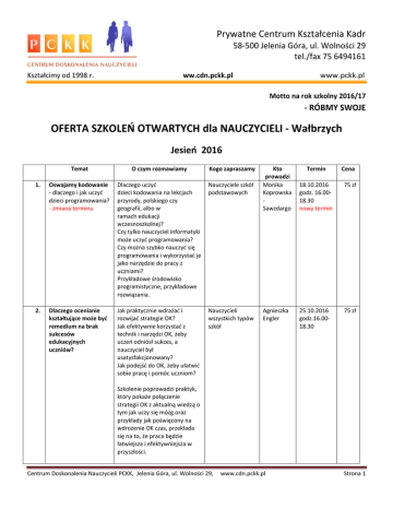 Prywatne Centrum Kształcenia Kadr 58-500 Jelenia Góra, ul. Wolności 29 tel./fax 75 6494161 Kształcimy od 1998 r. ww.cdn.pckk.pl www.pckk.pl Motto na rok szkolny 2016/17 - RÓBMY SWOJE OFERTA SZKOLEŃ OTWARTYCH dla NAUCZYCIELI - Wałbrzych Jesień 2016 Temat O czym rozmawiamy Kogo zapraszamy 1. Oswajamy kodowanie - dlaczego i jak uczyć dzieci programowania? - zmiana terminu Dlaczego uczyć dzieci kodowania na lekcjach przyrody, polskiego czy geografii, albo w ramach edukacji wczesnoszkolnej? Czy tylko nauczyciel informatyki może uczyć programowania? Czy można szybko nauczyć się programowania i wykorzystać je jako narzędzie do pracy z uczniami? Przykładowe środowisko programistyczne, przykładowe rozwiązania. Nauczyciele szkół podstawowych 2. Dlaczego ocenianie kształtujące może być remedium na brak sukcesów edukacyjnych uczniów? Jak praktycznie wdrażać i rozwijać strategie OK? Jak efektywnie korzystać z technik i narzędzi OK, żeby uczeń odniósł sukces, a nauczyciel był usatysfakcjonowany? Jak podejść do OK, żeby ułatwić sobie pracę i pomóc uczniom? Nauczycieli wszystkich typów szkół Kto prowadzi Monika Koprowska Sawzdargo Agnieszka Engler Termin Cena 18.10.2016 godz. 16.0018.30 nowy termin 75 zł 25.10.2016 godz.16.0018.30 75 zł Szkolenie poprowadzi praktyk, który pokaże połączenie strategii OK z aktualną wiedzą o tym jak uczy się mózg oraz przykłady jak poświęcony na wdrożenie OK czas, przekłada się na to, że praca będzie łatwiejsza i efektywniejsza w przyszłości. Centrum Doskonalenia Nauczycieli PCKK, Jelenia Góra, ul. Wolności 29, www.cdn.pckk.pl Strona 1 3. Praca z dzieckiem z Zespołem Aspergera i Autyzmem w szkole masowej i przedszkolu Cele szkolenia: nabycie przez Uczestników szkolenia aktualnej wiedzy na temat autyzmu i zespołu Aspergera u dzieci, zrozumienie trudnych zachowań uczniów, poznanie techniki pracy z nimi, a także praktyczne wskazówki, nabycie umiejętności posługiwania się specjalnymi metodami i formami pracy podczas prowadzenia zajęć z dziećmi z ZA i Autyzmem otworzenie się na nowe prądy edukacyjne, dostosowane do ich potrzeb Pedagogów, psychologów, nauczycieli edukacji wczesnoszkolnej, nauczycieli przedmiotowców, wychowawców i tych wszystkich którzy pracują lub mają zamiar pracować z dziećmi z zespołem Aspergera i Autyzmem. Ewelina Pieprzak 8.11.2016 godz. 16.0018.30 75 zł 4. Elementy muzykoterapii w pracy z dziećmi nadpobudliwymi ruchowo Charakterystyka dzieci nadpobudliwych psychoruchowo Założenia, cele, metody i formy muzykoterapii Ćwiczenia i zabawy terapeutyczne i integracyjne Zapoznanie z zabawami wycinającymi Ćwiczenia inhibicyjno-incytacyjne Praktyczne ćwiczenia wg Mobilnej Rekreacji Muzycznej Ćwiczenia relaksacyjne Nauczycieli przedszkoli i edukacji wczesnoszkolnej Bożena Piotrowska 15.11.2016 godz.16.0019.00 80 zł 5. Przemoc w sieci Nauczycieli wszystkich typów szkół, pedagogów Bogusława UłanowiczPęcherczyk 22.11.2016 godz. 16.0018.30 75 zł 6. Jak skutecznie i efektywnie pracować z dzieckiem z nadpobudliwością psychoruchową, czyli sposoby na dziecko z ADHD w szkole i przedszkolu - zmiana terminu Kto może być narażony na cyberprzemoc? Rodzaje przemocy w sieci, Konsekwencje psychiczne i somatyczne przemocy, Techniki prowadzenia rozmowy z ofiarą przemocy, Kompetencje nauczyciela a rola i odpowiedzialność rodzica Odróżnianie objawów ADHD od zachowań niepożądanych. Poznanie zasad skutecznej komunikacji w pracy z dzieckiem z nadpobudliwością. Rozwinięcie umiejętności wspierania dziecka. Nabycie umiejętności prowadzenia lekcji zgodnie z możliwościami uczniów z zaburzeniami zachowań. Nauczycieli i pedagogów szkół podstawowych oraz wychowawców i nauczycieli przedszkoli Ewelina Pieprzak 29.11.2016 godz.16.0018.30 nowy termin 75 zł Centrum Doskonalenia Nauczycieli PCKK, Jelenia Góra, ul. Wolności 29, www.cdn.pckk.pl Strona 2 KAŻDY Z TEMATÓW POWYŻEJ MOŻE BYĆ TEŻ ZREALIZOWANY W SZKOLE Zgłoszenia prosimy przesyłać e-mailem: [email protected]; faxem: 75 6494161 (formularze dostępne na www.cdn.pckk.pl). Przy zgłoszeniach indywidualnych (nie finansowanych przez pracodawcę) obowiązuje przedpłata min. 50% ceny szkolenia, w terminie do 3 dni roboczych przed datą szkolenia. W przypadku gdy szkolenie nie dojdzie do skutku (np. z powodu zbyt małej ilości chętnych), przedpłata zostanie zwrócona niezwłocznie. Konto bankowe: ING, PCKK, nr 60 1050 1751 1000 0090 9175 0126. W przypadku skierowania przez Placówkę – na adres płatnika zostanie przesłana faktura (płatność przelewem). Dodatkowych informacji udziela Jolanta Ratyńska tel. 500 278849 lub Małgorzata Pokosz tel. 500 278839 Szkolenia odbywają się w ExploraPark, Wałbrzych, ul. Moniuszki 66 DODATKOWE PROPOZYCJE DLA SZKÓŁ: SZKOLENIA RAD PEDAGOGICZNYCH – „szyte na miarę” Diagnoza aktualnych potrzeb rozwojowych RP Ustalenie zakresu szkolenia Szkolenie (najczęściej warsztat pozwalający przepracować sytuacje problemowe) Określenie kierunków dalszego działania RP Dzięki ekspertom o różnorodnych specjalizacjach jesteśmy w stanie odpowiedzieć na większość sytuacji problemowych, z jakimi styka się Rada Pedagogiczna. Ponadto proponujemy inne tematy możliwe do zrealizowania w szkołach: Kurs dla kierowników wycieczek szkolnych – 12 godzin (terminy do ustalenia) Dyscyplina w klasie – co mogę zrobić, aby lepiej pracować z grupą? Motywy trudnych zachowań uczniów oraz komunikaty korygujące zachowania uczniów, techniki komunikowania się z uczniami. Ocenianie kształtujące Jak wdrażać strategie OK? – podejście praktyczne Korzystanie z funduszy UE. Projekty edukacyjne w ramach programu ERASMUS+. Jakie działania może realizować szkoła/przedszkole w ramach programu Erasmus+? Jak znaleźć partnerów do projektu? Jak uzyskać dofinansowanie projektu? Innowacje w placówce oświatowej Innowacje w świetle prawa oświatowego, w od