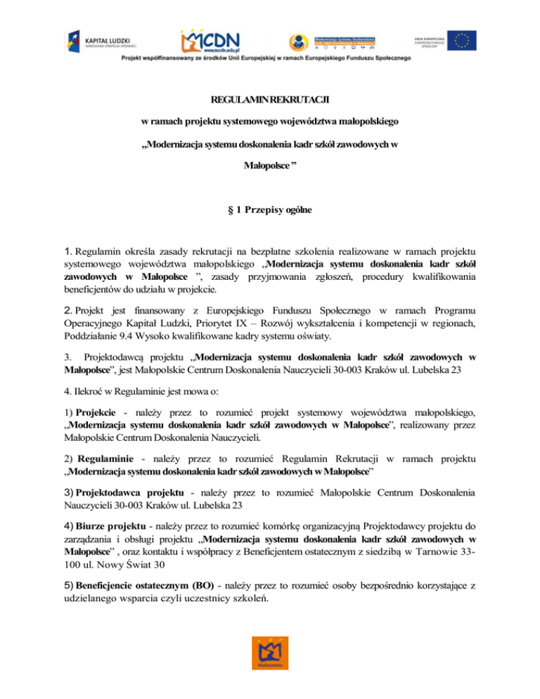 REGULAMINREKRUTACJI w ramach projektu systemowego województwa małopolskiego „Modernizacja systemu doskonalenia kadr szkół zawodowych w Małopolsce ” § 1 Przepisy ogólne 1. Regulamin określa zasady rekrutacji na bezpłatne szkolenia realizowane w ramach projektu systemowego województwa małopolskiego „Modernizacja systemu doskonalenia kadr szkół zawodowych w Małopolsce ”, zasady przyjmowania zgłoszeń, procedury kwalifikowania beneficjentów do udziału w projekcie. 2. Projekt jest finansowany z Europejskiego Funduszu Społecznego w ramach Programu Operacyjnego Kapitał Ludzki, Priorytet IX – Rozwój wykształcenia i kompetencji w regionach, Poddziałanie 9.4 Wysoko kwalifikowane kadry systemu oświaty. 3. Projektodawcą projektu „Modernizacja systemu doskonalenia kadr szkół zawodowych w Małopolsce”, jest Małopolskie Centrum Doskonalenia Nauczycieli 30-003 Kraków ul. Lubelska 23 4. Ilekroć w Regulaminie jest mowa o: 1) Projekcie - należy przez to rozumieć projekt systemowy województwa małopolskiego, „Modernizacja systemu doskonalenia kadr szkół zawodowych w Małopolsce”, realizowany przez Małopolskie Centrum Doskonalenia Nauczycieli. 2) Regulaminie - należy przez to rozumieć Regulamin Rekrutacji w ramach projektu „Modernizacja systemu doskonalenia kadr szkół zawodowych w Małopolsce” 3) Projektodawca projektu - należy przez to rozumieć Małopolskie Centrum Doskonalenia Nauczycieli 30-003 Kraków ul. Lubelska 23 4) Biurze projektu - należy przez to rozumieć komórkę organizacyjną Projektodawcy projektu do zarządzania i obsługi projektu „Modernizacja systemu doskonalenia kadr szkół zawodowych w Małopolsce” , oraz kontaktu i współpracy z Beneficjentem ostatecznym z siedzibą w Tarnowie 33100 ul. Nowy Świat 30 5) Beneficjencie ostatecznym (BO) - należy przez to rozumieć osoby bezpośrednio korzystające z udzielanego wsparcia czyli uczestnicy szkoleń. § 2 Proces rekrutacji 1. BO projektu są: ü Dyrektorzy szkół zawodowych w województwie małopolskim ü Nauczyciele przedmiotów ogólnokształcących szkół zawodowych (przedmioty: matematyczno – przyrodnicze, ICT, j. obce – j. angielski i j. niemiecki) ü Nauczyciele przedmiotów zawodowych ü Pracownicy administracyjni systemu oświaty zaangażowani w realizacje projektu systemowego z dz. 9.2 PO KL Proces rekrutacji będzie się odbywał sekwencyjnie dla każdej z grup BO: ü Dyrektorzy szkół zawodowych, zastępcy dyrektora lub wytypowani nauczyciele (posiadający rekomendację lub oddelegowanie lub pełnomocnictwo dyrektora) w województwie małopolskim - o przyjęciu decydować będzie miejsce pracy (województwo małopolskie). Pierwszeństwo będą posiadali dyrektorzy szkół, których szkoły są BO komplementarnego projektu systemowego województwa małopolskiego z działania 9.2 PO KL. Dyrektorzy szkół, które nie są BO działania 9.2 POKL zostaną zakwalifikowani po zadeklarowaniu wdrażania programów modułowych w swoich szkołach. Początek rekrutacji 20 sierpień 2010 r; zakończenie 31 grudnia 2010 r. Ilość miejsc - 200 ü Pracownicy administracyjni systemu oświaty – o przyjęciu decydować będzie przynależność do zespołu koordynacyjnego z działania 9.2 POKL w powiecie. Na szkolenie zakwalifikowana zostanie jedna osoba z zespołu na podstawie osobistego zgłoszenia. Termin rekrutacji od 20.08 do 06.09.2010 r. Ilość miejsc - 23 ü Nauczyciele tzw. liderzy zmiany – o przyjęciu decydować będzie osobiste zgłoszenie oraz pozytywna opinia dyrektora. Rekrutacja przeprowadzona zostanie w terminie od 20 sierpnia do 31 grudnia 2010 r. Ilość miejsc – 200. ü Nauczyciele przedmiotów ogólnokształcących – o przyjęciu decydować będzie wykształcenie zgodne z nauczanym przedmiotem oraz pozytywna opinia dyrektora szkoły. Termin rekrutacji- 1.09.2010 – 01.03.2011 r. Ilość miejsc – 200. W przypadku nauczyli języków obcych (szkolenie w zakresie języka branżowego) o przyjęciu decydować będzie rekomendacja dyrektora oraz termin zgłoszenia. Termin rekrutacji – od 01.09 do 25.11.2010 r. Ilość miejsc - 48 ü Nauczyciele przedmiotów zawodowych – o przyjęciu decydować będzie: pozytywna opinia dyrektora szkoły (20pkt), wykształcenie zgodne z nauczanym przedmiotem (40pkt), zatrudnienie na terenie wiejskim (40pkt). Termin rekrutacji od 01.10.2010 r do 31.12.2013 r. Ilość miejsc – 2000. Nauczyciele, którzy będą chcieli uczestniczyć w szkoleniu na egzaminatora w systemie ECVET – o przyjęciu decydować będzie: pozytywna opinia dyrektora szkoły (10pkt), wykształcenie zgodne z nauczanym przedmiotem (20pkt), zatrudnienie na terenie wiejskim (20pkt), udokumentowany czynny udział w pracach komisji egzaminacyjnej w przeciągu ostatnich 2 lat (50pkt). Termin rekrutacji od 01.01.2011 do 30.06.2011. Ilość miejsc – 300. W każdym przypadku, w razie większej ilość zgłoszeń, decydować będzie termin zgłoszenia (dostarczenia do Biura Merytorycznego – 33-100 Tarnów ul. Nowy Świat 30). W przypadku nie zakwalifikowania odpowiedniej ilości osób do poszczególnej edycji, rekrutacja zostanie przedłużona do momentu zrealizowania pełnej rekrutacji ( nie później niż do 31.01.2014 r.). W przypadku rekrutacji osób do udziału w seminariach zawodowych oraz praktykach zostanie opracowany odrębny regulamin 2. Osoby chętne do wzięcia udziału w szkoleniach realizowanych w ramach projektu zgłaszają chęć uczestnictwa w projekcie poprzez wypełnienie w całości ankiety zgłoszeniowej (wzór w załączniku 1 niniejszego regulaminu) dostępnej na stronie internetowej projektu www.mcdn.edu.pl , bezpośrednio w Biurze Projektu lub drogą elektroniczną. 3. Wypełnioną ankietę wraz z wymaganymi załącznikami należy dostarczyć do Biura Projektu osobiście lub: drogą elektroniczną na adres: [email protected] lub [email protected] pocztą na adres: 33-100 Tarnów ul. Nowy Świat 30 z dopiskiem Biuro Proje