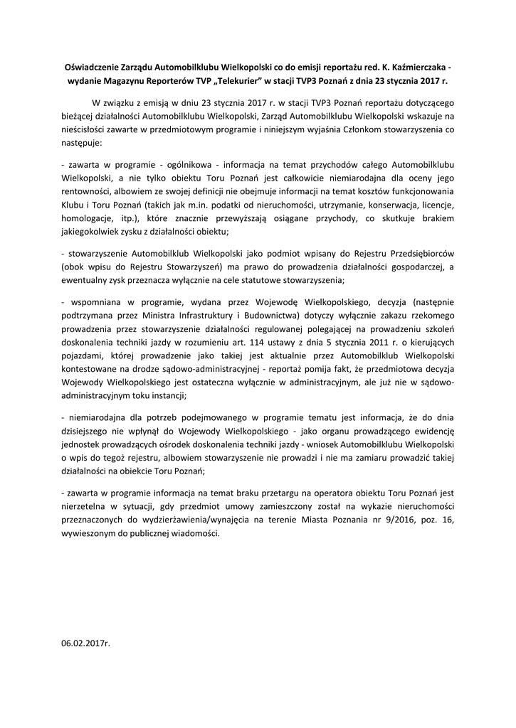 Oświadczenie Zarządu Automobilklubu Wielkopolski co do emisji reportażu red. K. Kaźmierczaka wydanie Magazynu Reporterów TVP „Telekurier” w stacji TVP3 Poznań z dnia 23 stycznia 2017 r. W związku z emisją w dniu 23 stycznia 2017 r. w stacji TVP3 Poznań reportażu dotyczącego bieżącej działalności Automobilklubu Wielkopolski, Zarząd Automobilklubu Wielkopolski wskazuje na nieścisłości zawarte w przedmiotowym programie i niniejszym wyjaśnia Członkom stowarzyszenia co następuje: - zawarta w programie - ogólnikowa - informacja na temat przychodów całego Automobilklubu Wielkopolski, a nie tylko obiektu Toru Poznań jest całkowicie niemiarodajna dla oceny jego rentowności, albowiem ze swojej definicji nie obejmuje informacji na temat kosztów funkcjonowania Klubu i Toru Poznań (takich jak m.in. podatki od nieruchomości, utrzymanie, konserwacja, licencje, homologacje, itp.), które znacznie przewyższają osiągane przychody, co skutkuje brakiem jakiegokolwiek zysku z działalności obiektu; - stowarzyszenie Automobilklub Wielkopolski jako podmiot wpisany do Rejestru Przedsiębiorców (obok wpisu do Rejestru Stowarzyszeń) ma prawo do prowadzenia działalności gospodarczej, a ewentualny zysk przeznacza wyłącznie na cele statutowe stowarzyszenia; - wspomniana w programie, wydana przez Wojewodę Wielkopolskiego, decyzja (następnie podtrzymana przez Ministra Infrastruktury i Budownictwa) dotyczy wyłącznie zakazu rzekomego prowadzenia przez stowarzyszenie działalności regulowanej polegającej na prowadzeniu szkoleń doskonalenia techniki jazdy w rozumieniu art. 114 ustawy z dnia 5 stycznia 2011 r. o kierujących pojazdami, której prowadzenie jako takiej jest aktualnie przez Automobilklub Wielkopolski kontestowane na drodze sądowo-administracyjnej - reportaż pomija fakt, że przedmiotowa decyzja Wojewody Wielkopolskiego jest ostateczna wyłącznie w administracyjnym, ale już nie w sądowoadministracyjnym toku instancji; - niemiarodajna dla potrzeb podejmowanego w programie tematu jest informacja, że do dnia dzisiejszego nie wpłynął do Wojewody Wielkopolskiego - jako organu prowadzącego ewidencję jednostek prowadzących ośrodek doskonalenia techniki jazdy - wniosek Automobilklubu Wielkopolski o wpis do tegoż rejestru, albowiem stowarzyszenie nie prowadzi i nie ma zamiaru prowadzić takiej działalności na obiekcie Toru Poznań; - zawarta w programie informacja na temat braku przetargu na operatora obiektu Toru Poznań jest nierzetelna w sytuacji, gdy przedmiot umowy zamieszczony został na wykazie nieruchomości przeznaczonych do wydzierżawienia/wynajęcia na terenie Miasta Poznania nr 9/2016, poz. 16, wywieszonym do publicznej wiadomości. 06.02.2017r.