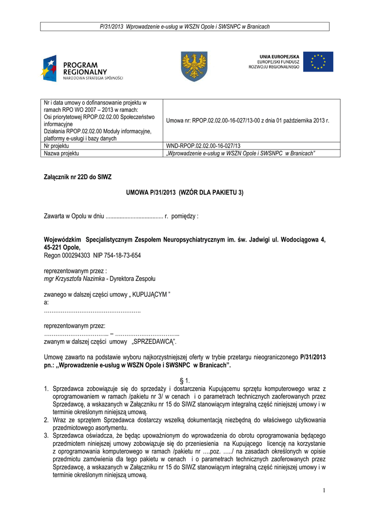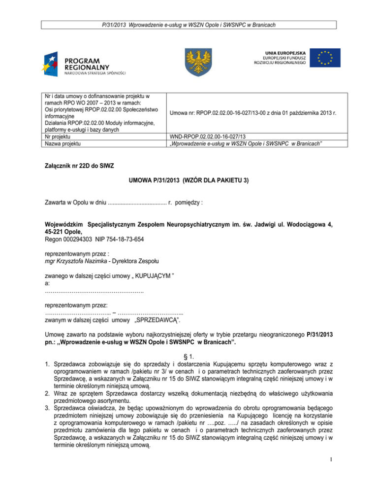 P/31/2013 Wprowadzenie e-usług w WSZN Opole i SWSNPC w Branicach Nr i data umowy o dofinansowanie projektu w ramach RPO WO 2007 – 2013 w ramach: Osi priorytetowej RPOP.02.02.00 Społeczeństwo informacyjne Działania RPOP.02.02.00 Moduły informacyjne, platformy e-usługi i bazy danych Nr projektu Nazwa projektu Umowa nr: RPOP.02.02.00-16-027/13-00 z dnia 01 października 2013 r. WND-RPOP.02.02.00-16-027/13 „Wprowadzenie e-usług w WSZN Opole i SWSNPC w Branicach” Załącznik nr 22D do SIWZ UMOWA P/31/2013 (WZÓR DLA PAKIETU 3) Zawarta w Opolu w dniu ..................................... r. pomiędzy : Wojewódzkim Specjalistycznym Zespołem Neuropsychiatrycznym im. św. Jadwigi ul. Wodociągowa 4, 45-221 Opole, Regon 000294303 NIP 754-18-73-654 reprezentowanym przez : mgr Krzysztofa Nazimka - Dyrektora Zespołu zwanego w dalszej części umowy „ KUPUJĄCYM ” a: ……………………………………………. reprezentowanym przez: …………………………….. – …………………………….. zwanym w dalszej części umowy „SPRZEDAWCĄ”. Umowę zawarto na podstawie wyboru najkorzystniejszej oferty w trybie przetargu nieograniczonego P/31/2013 pn.: ,,Wprowadzenie e-usług w WSZN Opole i SWSNPC w Branicach”. § 1. 1. Sprzedawca zobowiązuje się do sprzedaży i dostarczenia Kupującemu sprzętu komputerowego wraz z oprogramowaniem w ramach /pakietu nr 3/ w cenach i o parametrach technicznych zaoferowanych przez Sprzedawcę, a wskazanych w Załączniku nr 15 do SIWZ stanowiącym integralną część niniejszej umowy i w terminie określonym niniejszą umową. 2. Wraz ze sprzętem Sprzedawca dostarczy wszelką dokumentacją niezbędną do właściwego użytkowania przedmiotowego asortymentu. 3. Sprzedawca oświadcza, że będąc upoważnionym do wprowadzenia do obrotu oprogramowania będącego przedmiotem niniejszej umowy zobowiązuje się do przeniesienia na Kupującego licencję na korzystanie z oprogramowania komputerowego w ramach /pakietu nr ….poz. …../ na zasadach określonych w opisie przedmiotu zamówienia dla tego pakietu w cenach i o parametrach technicznych zaoferowanych przez Sprzedawcę, a wskazanych w Załączniku nr 15 do SIWZ stanowiącym integralną część niniejszej umowy i w terminie określonym niniejszą umową. 1 P/31/2013 Wprowadzenie e-usług w WSZN Opole i SWSNPC w Branicach 4. Licencja, o której mowa w ust. 3 jest licencją niewyłączną udzielaną Kupującemu w ramach pakietu …. poz. ….na czas nieokreślony bez prawa wypowiedzenia i upoważnia Kupującego do używania oprogramowania w prowadzonej przez niego działalności, na już posiadanym, jak i nowo dostarczonym sprzęcie komputerowym do jego siedziby zgodnie z przeznaczeniem oprogramowania. 5. W ramach pakietu 3 dla poz. 7 i 9 Sprzedawca zapewni 36 miesięczną asystę na zasadach wskazanych w Załączniku nr 13 do SIWZ. Załącznik nr 13 do SIWZ stanowi integralną część niniejszej umowy. 6. Wraz z oprogramowaniem Sprzedawca dostarczy wszelką dokumentacją niezbędną do właściwego użytkowania przedmiotowego asortymentu. 7. Sprzedawca oświadcza, że dostarczone w ramach niniejszej umowy oprogramowanie jest wolne od wad prawnych. Strony ustalają, że gdyby okazało się, iż osoba trzecia zgłasza roszczenia pod adresem przedmiotowego oprogramowania, Sprzedawca, po zawiadomieniu przez Kupującego, przystąpi do wyjaśnienia sprawy oraz wystąpi przeciwko takim roszczeniom na własny koszt i ryzyko lub przystąpi do postępowania sądowego toczonego w stosunku do Kupującego oraz zaspokoi wszelkie związane z tym roszczenia, a w razie ich zasądzenia od Kupującego zwróci Kupującemu całość pokrytych roszczeń oraz wszelkie związane z tym wydatki i opłaty, włączając w to koszty procesu i obsługi prawnej oraz koszty ewentualnych odszkodowań. 8. W przypadku zaproponowania rozwiązania równoważnego w zakresie posiadanego przez Kupującego oprogramowania, którego aktualizacja jest wymagana w ramach opisu przedmiotu zamówienia, Sprzedawca zobowiązuje się do: a. wykonania wszystkich niezbędnych prac wdrożeniowych, konfiguracyjnych oraz innych, które będą wymagane przy zmianie oprogramowania. Prace te nie mogą powodować przestojów w pracy Kupującego, muszą być wykonane w uzgodnieniu z personelem informatycznym. Prace będą wykonywane w godzinach popołudniowych lub w weekend; b. przeszkolenia wszystkich pracowników, u których będzie zainstalowane zaproponowane równoważne oprogramowanie. Szkolenie musi być przeprowadzone w certyfikowanym przez producenta równoważnego oprogramowania ośrodku szkoleniowym, przez prowadzącego, który wykonał minimum 3 szkolenia o podobnym zakresie. Ilość szkoleń oraz zakres szkoleń musi umożliwiać Kupującemu swobodną obsługę zaproponowanego oprogramowania. § 2. 1. Cena za wykonanie przedmiotu umowy w ramach /pakietu nr …./ wynosi ……………………………. zł płatne zgodnie z § 4 umowy. 2. Podana cena zawiera: wartość netto towaru, podatek VAT, koszty ubezpieczenia, transportu towaru do siedziby Kupującego ewentualnego wniesienia sprzętu, złożenia i ustawienia w miejscu wskazanym przez Kupującego, a także innych elementów dostarczonych wraz ze sprzętem, a szczegółowo opisanych w opisie przedmiotu zamówienia., wydania przedmiotowego oprogramowania, udzielenia licencji oraz koszty ewentualnego szkolenia z tytułu prac wdrożeniowych i konfiguracyjnych równoważnego oprogramowania . § 3. 1. Sprzedawca zobowiązuje się dostarczyć towar do magazynu Kupującego w godz. od 8:00 do 14:30 w terminie do 21 dni od daty podpisania umowy. 2. Do kontaktów ze Sprzedawcą w sprawie realizacji niniejszej umowy ze strony Kupującego będzie Pan …………………….. będący jednocześnie osobą właściwą do podejmowania działań reklamacyjnych nr tel. ………………………. § 4. 1. Płatność dokonywana będzie w PLN na podstawie faktury VAT wystawione