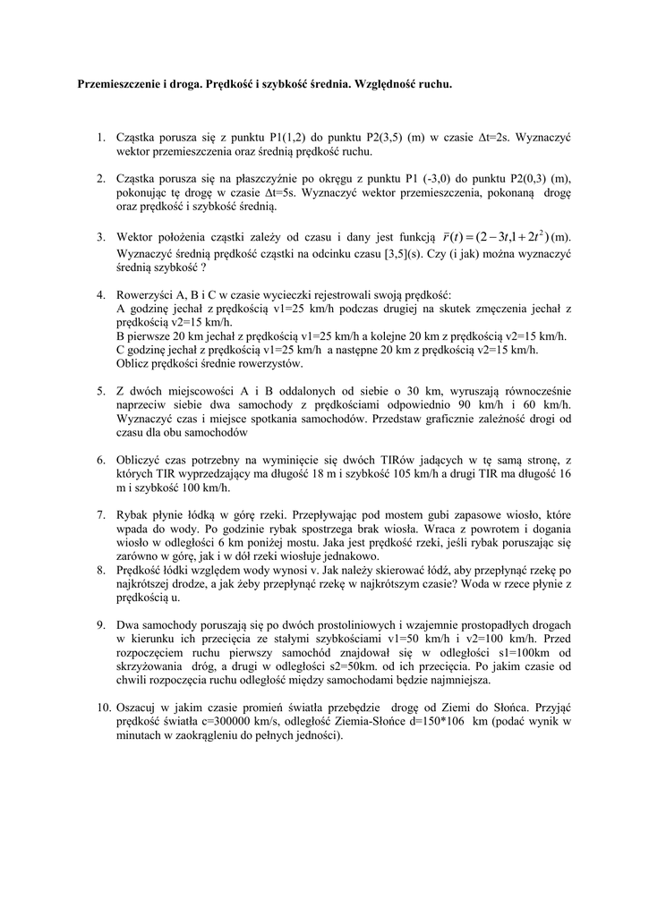 Przemieszczenie i droga. Prędkość i szybkość średnia. Względność ruchu. 1. Cząstka porusza się z punktu P1(1,2) do punktu P2(3,5) (m) w czasie Δt=2s. Wyznaczyć wektor przemieszczenia oraz średnią prędkość ruchu. 2. Cząstka porusza się na płaszczyźnie po okręgu z punktu P1 (-3,0) do punktu P2(0,3) (m), pokonując tę drogę w czasie Δt=5s. Wyznaczyć wektor przemieszczenia, pokonaną drogę oraz prędkość i szybkość średnią. 3. Wektor położenia cząstki zależy od czasu i dany jest funkcją r (t ) (2 3t ,1 2t 2 ) (m). Wyznaczyć średnią prędkość cząstki na odcinku czasu [3,5](s). Czy (i jak) można wyznaczyć średnią szybkość ? 4. Rowerzyści A, B i C w czasie wycieczki rejestrowali swoją prędkość: A godzinę jechał z prędkością v1=25 km/h podczas drugiej na skutek zmęczenia jechał z prędkością v2=15 km/h. B pierwsze 20 km jechał z prędkością v1=25 km/h a kolejne 20 km z prędkością v2=15 km/h. C godzinę jechał z prędkością v1=25 km/h a następne 20 km z prędkością v2=15 km/h. Oblicz prędkości średnie rowerzystów. 5. Z dwóch miejscowości A i B oddalonych od siebie o 30 km, wyruszają równocześnie naprzeciw siebie dwa samochody z prędkościami odpowiednio 90 km/h i 60 km/h. Wyznaczyć czas i miejsce spotkania samochodów. Przedstaw graficznie zależność drogi od czasu dla obu samochodów 6. Obliczyć czas potrzebny na wyminięcie się dwóch TIRów jadących w tę samą stronę, z których TIR wyprzedzający ma długość 18 m i szybkość 105 km/h a drugi TIR ma długość 16 m i szybkość 100 km/h. 7. Rybak płynie łódką w górę rzeki. Przepływając pod mostem gubi zapasowe wiosło, które wpada do wody. Po godzinie rybak spostrzega brak wiosła. Wraca z powrotem i dogania wiosło w odległości 6 km poniżej mostu. Jaka jest prędkość rzeki, jeśli rybak poruszając się zarówno w górę, jak i w dół rzeki wiosłuje jednakowo. 8. Prędkość łódki względem wody wynosi v. Jak należy skierować łódź, aby przepłynąć rzekę po najkrótszej drodze, a jak żeby przepłynąć rzekę w najkrótszym czasie? Woda w rzece płynie z prędkością u. 9. Dwa samochody poruszają się po dwóch prostoliniowych i wzajemnie prostopadłych drogach w kierunku ich przecięcia ze stałymi szybkościami v1=50 km/h i v2=100 km/h. Przed rozpoczęciem ruchu pierwszy samochód znajdował się w odległości s1=100km od skrzyżowania dróg, a drugi w odległości s2=50km. od ich przecięcia. Po jakim czasie od chwili rozpoczęcia ruchu odległość między samochodami będzie najmniejsza. 10. Oszacuj w jakim czasie promień światła przebędzie drogę od Ziemi do Słońca. Przyjąć prędkość światła c=300000 km/s, odległość Ziemia-Słońce d=150*106 km (podać wynik w minutach w zaokrągleniu do pełnych jedności).