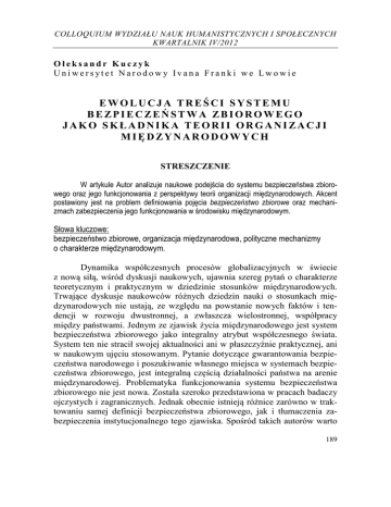COLLOQUIUM WYDZIAŁU NAUK HUMANISTYCZNYCH I SPOŁECZNYCH KWARTALNIK IV/2012 Ołeksandr Kuczyk Uniwersytet Narodowy Ivana Franki we Lwowie EWOLUCJA TREŚCI SYSTEMU BEZPIECZEŃSTWA ZBIOROWEGO JAKO SKŁADNIKA TEORII ORGANIZACJI MIĘDZYNARODOWYCH STRESZCZENIE W artykule Autor analizuje naukowe podejścia do systemu bezpieczeństwa zbiorowego oraz jego funkcjonowania z perspektywy teorii organizacji międzynarodowych. Akcent postawiony jest na problem definiowania pojęcia bezpieczeństwo zbiorowe oraz mechanizmach zabezpieczenia jego funkcjonowania w środowisku międzynarodowym. Słowa kluczowe: bezpieczeństwo zbiorowe, organizacja międzynarodowa, polityczne mechanizmy o charakterze międzynarodowym. Dynamika współczesnych procesów globalizacyjnych w świecie z nową siłą, wśród dyskusji naukowych, ujawnia szereg pytań o charakterze teoretycznym i praktycznym w dziedzinie stosunków międzynarodowych. Trwające dyskusje naukowców różnych dziedzin nauki o stosunkach międzynarodowych nie ustają, ze względu na powstanie nowych faktów i tendencji w rozwoju dwustronnej, a zwłaszcza wielostronnej, współpracy między państwami. Jednym ze zjawisk życia międzynarodowego jest system bezpieczeństwa zbiorowego jako integralny atrybut współczesnego świata. System ten nie stracił swojej aktualności ani w płaszczyźnie praktycznej, ani w naukowym ujęciu stosowanym. Pytanie dotyczące gwarantowania bezpieczeństwa narodowego i poszukiwanie własnego miejsca w systemach bezpieczeństwa zbiorowego, jest integralną częścią działalności państwa na arenie międzynarodowej. Problematyka funkcjonowania systemu bezpieczeństwa zbiorowego nie jest nowa. Została szeroko przedstawiona w pracach badaczy ojczystych i zagranicznych. Jednak obecnie istnieją różnice zarówno w traktowaniu samej definicji bezpieczeństwa zbiorowego, jak i tłumaczenia zabezpieczenia instytucjonalnego tego zjawiska. Spośród takich autorów warto 189 Ołeksandr Kuczyk wymienić prace W. Bruza, W. Butkewicza, A. Małaniuka, Ł. Tymczenka i innych1. Analizując zagadnienie bezpieczeństwa zbiorowego odwołują się oni do międzynarodowo-prawnego tłumaczenia bezpieczeństwa zbiorowego. Mimo ważności rozumienia charakteru prawnego bezpieczeństwa zbiorowego, ważne wydaje się rozszerzenie tłumaczenia tego zjawiska kosztem wprowadzenia do obiegu naukowego nowych podejść. Pewien brak definicji systemu bezpieczeństwa zbiorowego jako wielodyscyplinarnego zjawiska został spowodowany przez niedostateczne zainteresowanie ojczystej nauki politycznej problemami efektywności funkcjonowania struktury instytucjonalnej międzynarodowego systemu bezpieczeństwa i bezpieczeństwa zbiorowego, jako formy działalności związanej z bezpieczeństwem. Celem naszego badania będzie próba analizy różnych podejść do traktowania zjawiska bezpieczeństwa zbiorowego, oraz ujawnienie jego komponentów i określenie głównych tendencji w zastosowaniu bezpieczeństwa zbiorowego, jako systemu środków w stosunkach międzynarodowych. Wzorcowe jest określenie podane w słowniku – informatorze Prawo międzynarodowe: „Bezpieczeństwo zbiorowe to system wspólnych działań państw w celu podtrzymywania międzynarodowego pokoju i bezpieczeństwa wyznaczony przez Kartę Narodów Zjednoczonych i przeprowadzany w ramach tej uniwersalnej organizacji, regionalnych organizacji bezpieczeństwa, organizacji i umów samoobrony zbiorowej. Bezpieczeństwo zbiorowe jest odzwierciedleniem pojęcia niepodzielności pokoju w tym sensie, że we współczesnych stosunkach międzynarodowych bezpieczeństwo jakiegokolwiek kraju jest ściśle związane z bezpieczeństwem wszystkich państw, jakiekolwiek zakłócenie pokoju powoduje niebezpieczeństwo dla ogólnego pokoju”2. Definicja podana w Ukraińskiej encyklopedji dyplomatycznej jeszcze bardziej zwraca uwagę na aspekt międzynarodowo-prawny bezpieczeństwa zbiorowego. Czytamy tutaj: „Bezpieczeństwo zbiorowe to system norm prawa międzynarodowego (podkreślenie O. K.) – wyznaczonych w Karcie 1 W. S. Bruz, OON i wrehuljuwannia miźnarodnyh konfliktiw: nawch. posibnyk, Kyjiw, Lybid’, 1995, s. 111; W. H. Butkewych red., Prawo miźnarodnoji bezpeky. Miźnarodne prawo. Osnowni haluzi: pidruchnyk, Kyjiw, Lybid’, 2004, Hlawa VI, s. 259-288; P. Malanchuk, Wstup do miźnarodnoho prawa ya Ejkherstom, P. Malanchukö per y Anul, Harkiw, Konsum, 2000, s. 592; L. D. Tymchenko, Mjeźdunarodnoje prawo: uchjebnik, Harkiw, Konsum, 1999, s. 528. 2 W. N. Dodonow, Mjeźdunarodnoje prawo: slowar’ – sprawochnik, W. N. Dodonow, W. P. Panow, O. H. Rumjancew, pod obszcz. red. Akad MAI, W. N. Trofimowa, Moskwa: INFRA-M, 1997, s. 94. 190 COLLOQUIUM WNHiS Ewolucja treści systemu bezpieczeństwa zbiorowego jako składnika teorii organizacji… Narodów Zjednoczonych regulujący zbiorowe zastosowanie siły pod egidą ONZ w celu podtrzymywania lub odnowy pokoju i bezpieczeństwa międzynarodowego. Współczesny system bezpieczeństwa zbiorowego opiera się na następujących podstawowych elementach: system powszechnie uznanych zasad i norm prawa międzynarodowego, z których najważniejszy jest zakaz stosowania siły czy groźby użycia siły w stosunkach międzynarodowych; rozwiązywanie sporów międzynarodowych wyłącznie przez metody pokojowe; suwerenna równość państw; szacunek do podstawowych praw człowieka; wzajemna nieinterwencja państw w sprawy wewnętrzne; system środków pokojowego rozwiązywania sporów międzynarodowych; system środków zbiorowych dla zapobiegania oraz usunięcia groźby wojny, naruszenia pokoju i aktów agresji; system zbiorowych środków rozbrojenia; system środków skierowanych na umocnienie zaufania między państwami”3. Główny akcent jest więc położony na środki prawne, a mianowicie na system zasad i środków międzynarodowo-prawnych. Mimo to warto też zwrócić uwagę na system instytucji i organów albo mechanizmów politycznych o charakt