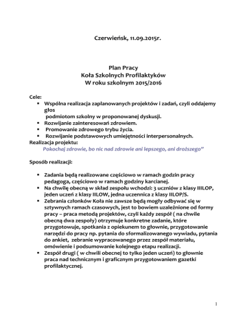 Czerwieńsk, 11.09.2015r. Plan Pracy Koła Szkolnych Profilaktyków W roku szkolnym 2015/2016 Cele: Wspólna realizacja zaplanowanych projektów i zadań, czyli oddajemy głos podmiotom szkolny w proponowanej dyskusji. Rozwijanie zainteresowań zdrowiem. Promowanie zdrowego trybu życia. Rozwijanie podstawowych umiejętności interpersonalnych. Realizacja projektu: Pokochaj zdrowie, bo nic nad zdrowie ani lepszego, ani droższego” Sposób realizacji: Zadania będą realizowane częściowo w ramach godzin pracy pedagoga, częściowo w ramach godziny karcianej. Na chwilę obecną w skład zespołu wchodzi: 3 uczniów z klasy IIILOP, jeden uczeń z klasy IILOW, jedna uczennica z klasy IILOP/S. Zebrania członków Koła nie zawsze będą mogły odbywać się w sztywnych ramach czasowych, jest to bowiem uzależnione od formy pracy – praca metodą projektów, czyli każdy zespół ( na chwile obecną dwa zespoły) otrzymuje konkretne zadanie, które przygotowuje, spotkania z opiekunem to głownie, przygotowanie narzędzi do pracy np. pytania do sformalizowanego wywiadu, pytania do ankiet, zebranie wypracowanego przez zespół materiału, omówienie i podsumowanie kolejnego etapu realizacji. Zespół drugi ( w chwili obecnej to tylko jeden uczeń) to głownie praca nad technicznym i graficznym przygotowaniem gazetki profilaktycznej. 1 LP. Zadanie 1. Otwarcie Sposób realizacji - zebranie ekipy, - zaplanowanie działań, - wydanie 1 numeru gazetki, - dostarczenie informacji w gablotach szkolnych Termin Wrzesień Oczekiwany efekt Zmotywowanie społeczności szkolnej do współpracy, zainteresowanie zaplanowanymi działaniami. 2. Diagnoza - zebranie informacji na temat szkoły, oczekiwań, propozycji. Wrzesień Wyjście w środowisko szkolne, pozyskanie informacji, które posłużą naszej wspólnej pracy nad jakością pracy. 3. Konkurs 4. 5. - przeprowadzenie konkursu klasowego: „ Szkoła moich marzeń”. - rozstrzygnięcie konkursu, - ogłoszenie wyników w 2 numerze gazetki i w gablotach szkolnych, - zorganizowanie klasowego pikniku dla zwycięskiej klasy. Promocja programu; - wydanie 3 numeru „Pokochaj zdrowie, gazetki z informacją o bo nic nad zdrowie ani programie, lepszego, ani - informacje w droższego”. gablotach, - zaproszenie do wspólnej twórczej zabawy profilaktycznej. Święta, Święta, czyli - współpraca z ile kalorii zjadamy i nauczycielem biologii jak je w przerwie ( klasy I będą miały za świątecznej zadanie przygotować przetwarzamy. jadłospis potraw świątecznych, policzyć kalorie oraz zaproponować alternatywny zdrowy jadłospis świąteczny). - współpraca z nauczycielami wf Wrzesień Październik Zmotywowanie poszczególnych klas do wspólnej twórczej zabawy. Zebranie informacji zwrotnych. Rozstrzygnięcie konkursu i nagrodzenie zwycięzców. Przekazanie informacji – gazetka, gabloty szkolne. Listopad Zachęcenie do udziału w zabawie profilaktycznej, Dostarczenie informacji na temat projektowanych zadań. Grudzień Współpraca. Poznanie świątecznych nawyków żywieniowych Polaków. Poznanie metod aktywnego sposobu spędzenia czasu wolnego. 2 6. Gazetka numer 4 7. Mój sposób na głoda - konkurs literacki 8. Dopalacze w centrum uwagi 9. Znam, wiem, potrafię się bronić 10. Konkurs na komiks ( pozostałe klasy będą miały za zadanie zaprojektować aktywny tryb spędzenia czasu przerwy świątecznej w celu spalenia kalorii ( forma propozycji wg pomysłu uczniów i nauczycieli). - opisanie grudniowych działań oraz ich wyników. - gazetka numer 5 – podanie informacji na temat zdrowego stylu życia oraz ogłoszenie konkursu, - współpraca z nauczycielem j. polskiego rozpisanie i przeprowadzenie konkursu na fraszkę pod tytułem; „ Mój sposób na głoda” - zebranie informacji wśród uczniów i pracowników szkoły na temat dopalaczy ( wywiad terenowy). - opublikowanie zebranych informacji w gazetce numer 6 - przeprowadzenie zajęć (we wszystkich klasach) na temat dopalaczy, zagrożenia, jakie niosą dla człowieka, odpowiedzialności prawnej – współpraca z nauczycielem przedmiotów policyjnych. - ogłoszenie konkursu na komiks; Dopalacze, znam, wiem, potrafię powiedzieć NIE” - gazetka nr 7 oraz Styczeń Przekazanie informacji. Luty Zaproszenie do twórczej zabawy Wzbudzenie refleksji na temat zdrowego stylu życia. Marzec Poznanie wiedzy uczniów i pracowników szkoły na temat zagrożenia dopalaczami. Poznanie świadomości zagrożenia. Kwiecień Wiedza na temat zagrożeń, nabycie umiejętności wyboru ( asertywność), poznanie aspektów prawnych. Maj Przełożenie wiedzy na aktywne działanie. Danie młodzieży możliwości wypowiedzenia się na 3 11. I to już koniec informacje w gablotach, - przeprowadzenie konkursu, - włączenie do konkursu RR, w celu pozyskania środków na nagrodę. - podsumowanie Czerwiec rocznej pracy, - przygotowanie sprawozdania, - przygotowanie gazetki numer 8 podsumowującej działania Koła oraz zachęcającej do aktywnego, bezpiecznego letniego wypoczynku. temat dopalaczy. Możliwość uczestnictwa w konkursie, otrzymanie nagrody. - Włączenie do działań szkoły Rady Rodziców. Informacja na temat możliwości aktywnego, bezpiecznego spędzenia czasu wolnego. Podsumowanie pracy Koła, wnioski, rekomendacje. Członkowie Koła Szkolnych Profilaktyków Skład zespołu: Redaktorzy terenowi: Natalia Zapotoczna, Klaudia Banach, Kacper Dzwoniarski, Klaudia Kaźmierska, Ola Stasiak Oprawa techniczna: Konrad Andrzejak Wasilewski Opieka – Marlena Działabij Drupka – pedagog szkolny 4