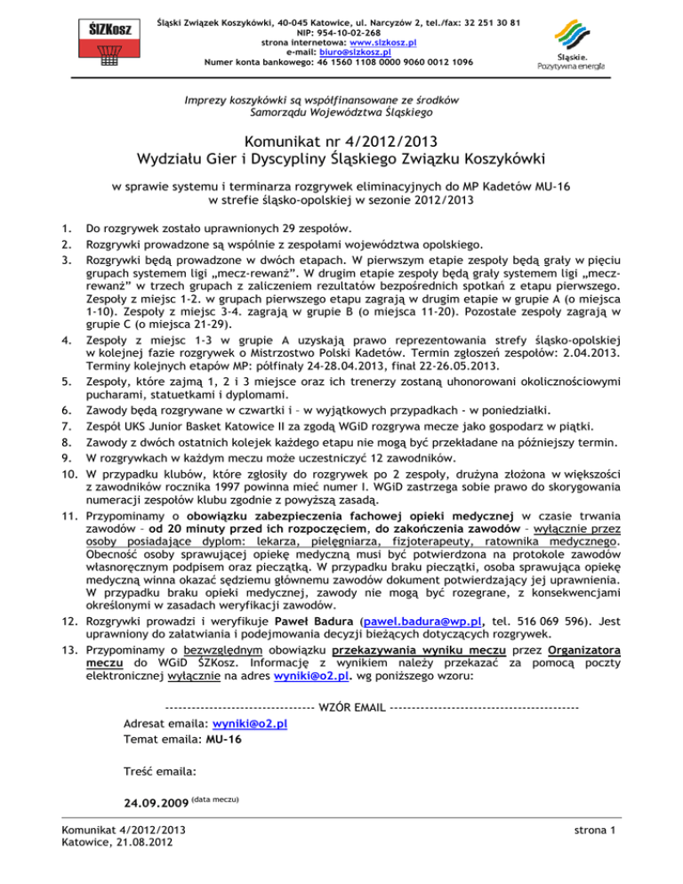 Śląski Związek Koszykówki, 40-045 Katowice, ul. Narcyzów 2, tel./fax: 32 251 30 81 NIP: 954-10-02-268 strona internetowa: www.slzkosz.pl e-mail: [email protected] Numer konta bankowego: 46 1560 1108 0000 9060 0012 1096 Imprezy koszykówki są współfinansowane ze środków Samorządu Województwa Śląskiego Komunikat nr 4/2012/2013 Wydziału Gier i Dyscypliny Śląskiego Związku Koszykówki w sprawie systemu i terminarza rozgrywek eliminacyjnych do MP Kadetów MU-16 w strefie śląsko-opolskiej w sezonie 2012/2013 1. 2. 3. 4. 5. 6. 7. 8. 9. 10. 11. 12. 13. Do rozgrywek zostało uprawnionych 29 zespołów. Rozgrywki prowadzone są wspólnie z zespołami województwa opolskiego. Rozgrywki będą prowadzone w dwóch etapach. W pierwszym etapie zespoły będą grały w pięciu grupach systemem ligi „mecz-rewanż”. W drugim etapie zespoły będą grały systemem ligi „meczrewanż” w trzech grupach z zaliczeniem rezultatów bezpośrednich spotkań z etapu pierwszego. Zespoły z miejsc 1-2. w grupach pierwszego etapu zagrają w drugim etapie w grupie A (o miejsca 1-10). Zespoły z miejsc 3-4. zagrają w grupie B (o miejsca 11-20). Pozostałe zespoły zagrają w grupie C (o miejsca 21-29). Zespoły z miejsc 1-3 w grupie A uzyskają prawo reprezentowania strefy śląsko-opolskiej w kolejnej fazie rozgrywek o Mistrzostwo Polski Kadetów. Termin zgłoszeń zespołów: 2.04.2013. Terminy kolejnych etapów MP: półfinały 24-28.04.2013, finał 22-26.05.2013. Zespoły, które zajmą 1, 2 i 3 miejsce oraz ich trenerzy zostaną uhonorowani okolicznościowymi pucharami, statuetkami i dyplomami. Zawody będą rozgrywane w czwartki i – w wyjątkowych przypadkach - w poniedziałki. Zespół UKS Junior Basket Katowice II za zgodą WGiD rozgrywa mecze jako gospodarz w piątki. Zawody z dwóch ostatnich kolejek każdego etapu nie mogą być przekładane na późniejszy termin. W rozgrywkach w każdym meczu może uczestniczyć 12 zawodników. W przypadku klubów, które zgłosiły do rozgrywek po 2 zespoły, drużyna złożona w większości z zawodników rocznika 1997 powinna mieć numer I. WGiD zastrzega sobie prawo do skorygowania numeracji zespołów klubu zgodnie z powyższą zasadą. Przypominamy o obowiązku zabezpieczenia fachowej opieki medycznej w czasie trwania zawodów – od 20 minuty przed ich rozpoczęciem, do zakończenia zawodów – wyłącznie przez osoby posiadające dyplom: lekarza, pielęgniarza, fizjoterapeuty, ratownika medycznego. Obecność osoby sprawującej opiekę medyczną musi być potwierdzona na protokole zawodów własnoręcznym podpisem oraz pieczątką. W przypadku braku pieczątki, osoba sprawująca opiekę medyczną winna okazać sędziemu głównemu zawodów dokument potwierdzający jej uprawnienia. W przypadku braku opieki medycznej, zawody nie mogą być rozegrane, z konsekwencjami określonymi w zasadach weryfikacji zawodów. Rozgrywki prowadzi i weryfikuje Paweł Badura ([email protected], tel. 516 069 596). Jest uprawniony do załatwiania i podejmowania decyzji bieżących dotyczących rozgrywek. Przypominamy o bezwzględnym obowiązku przekazywania wyniku meczu przez Organizatora meczu do WGiD ŚZKosz. Informację z wynikiem należy przekazać za pomocą poczty elektronicznej wyłącznie na adres [email protected]. wg poniższego wzoru: ---------------------------------- WZÓR EMAIL ------------------------------------------Adresat emaila: [email protected] Temat emaila: MU-16 Treść emaila: 24.09.2009 (data meczu) Komunikat 4/2012/2013 Katowice, 21.08.2012 strona 1 Śląski Związek Koszykówki, 40-045 Katowice, ul. Narcyzów 2, tel./fax: 32 251 30 81 NIP: 954-10-02-268 strona internetowa: www.slzkosz.pl e-mail: [email protected] Numer konta bankowego: 46 1560 1108 0000 9060 0012 1096 Grupa I (grupa w której występują zespoły) MOSiR Cieszyn (Gospodarz wg terminarza) MCKS Czeladź (Gość wg terminarza) Wynik końcowy 69:68 (Wynik meczu/końcowy) K1 15:15 (Wynik pierwszej kwarty) K2 15:15 (Wynik drugiej kwarty) K3 15:15 (Wynik trzeciej kwarty) K4 15:15 (Wynik czwartej kwarty) D1 5:5 (Wynik pierwszej dogrywki- jeśli była konieczna) D2 4:3 (Wynik drugiej dogrywki - jeśli była konieczna) Przesyła: Jan Kowalski (nazwisko osoby przekazującej wynik) ---------------------------------- WZÓR EMAIL ------------------------------------------* Pogrubionym tekstem zaznaczono treść, którą należy zawrzeć w emailu. Przypominamy, że w przypadku niewywiązywania się organizatorów zawodów z tego obowiązku, w stosunku właściwych im klubów WGiD ŚZKosz będzie stosował kary regulaminowe. 14. Podział na grupy I etapu rozgrywek: Grupa II Grupa I 1. 2. 3. 4. 5. 6. KU AZS PC Częstochowa MKS Dąbrowa Górnicza I GTK Fluor Gliwice I MCKiS Jaworzno II MKS MOS Katowice UKS Junior Basket Katowice II 1. 2. 3. 4. 5. 6. Grupa III 1. 2. 3. 4. 5. 6. UKS Dycha Czechowice Dziedzice MCKS Czeladź II MKS Dąbrowa Górnicza II UKS Junior Basket Katowice I MKS Smyk Prudnik MKKS Zagłębie Sosnowiec KS Królewscy Chorzów GTK Fluor Gliwice II MCKiS Jaworzno I UKS SP 27 Katowice KS MOSM Tychy I MKS Zabrze II Grupa IV 1. 2. 3. 4. 5. 6. MCKS Czeladź I UKS MOS Opole KS Pogoń Ruda Śląska MKKS Rybnik II KS MOSM Tychy II MKS Zabrze I Grupa V 1. 2. 3. 4. 5. MOSiR Cieszyn GUKS Sukces Lipowa GUKS Gwarek Pawłowice MKKS Rybnik I KS Hawajskie Koszule Żory 15. Terminarz I etapu rozgrywek: Komunikat 4/2012/2013 Katowice, 21.08.2012 strona 2 Śląski Związek Koszykówki, 40-045 Katowice, ul. Narcyzów 2, tel./fax: 32 251 30 81 NIP: 954-10-02-268 strona internetowa: www.slzkosz.pl e-mail: [email protected] Numer konta bankowego: 46 1560 1108 0000 9060 0012 1096 Grupa I I runda II runda 1 kolejka – 13.09.2012 1. GTK Gliwice I - MCKiS Jaworzno II 2. AZS PC Częstochowa - MKS MOS Katowice 3. MKS Dąbrowa G. I - Junior Bas. Katowice II 6 kolejka – 18.10.2012 16. MCKiS Jaworzno II - GTK Gliwice I 17. MKS MOS Katowice - AZS PC Częstochowa 18. Junior Bas. K-ce II - MKS Dą