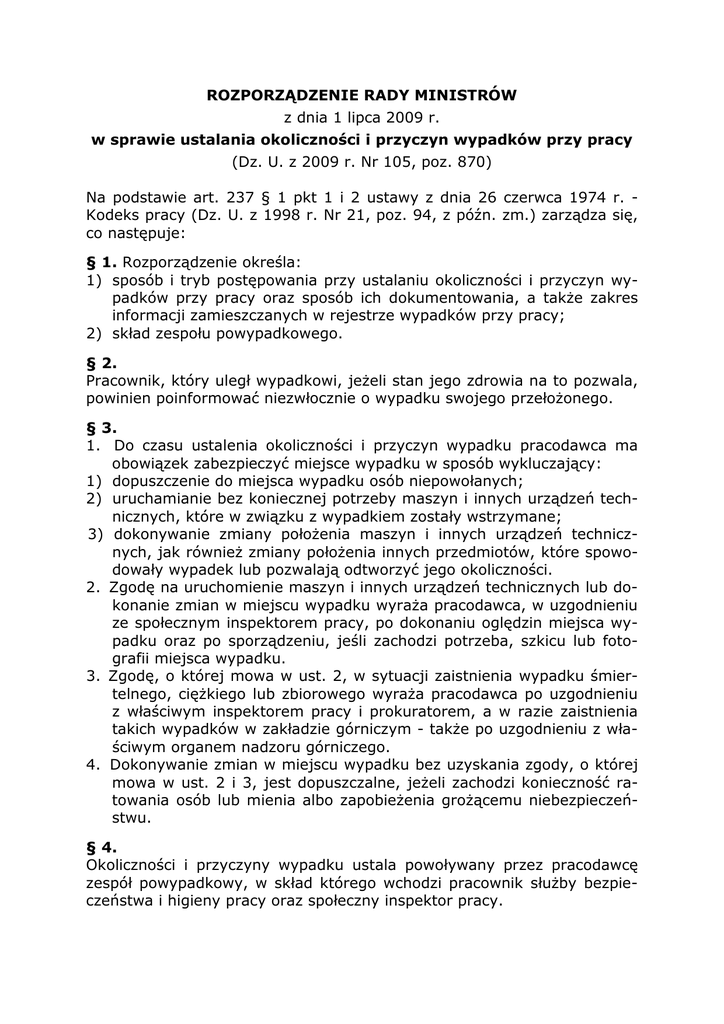 ROZPORZĄDZENIE RADY MINISTRÓW z dnia 1 lipca 2009 r. w sprawie ustalania okoliczności i przyczyn wypadków przy pracy (Dz. U. z 2009 r. Nr 105, poz. 870) Na podstawie art. 237 § 1 pkt 1 i 2 ustawy z dnia 26 czerwca 1974 r. Kodeks pracy (Dz. U. z 1998 r. Nr 21, poz. 94, z późn. zm.) zarządza się, co następuje: § 1. Rozporządzenie określa: 1) sposób i tryb postępowania przy ustalaniu okoliczności i przyczyn wypadków przy pracy oraz sposób ich dokumentowania, a także zakres informacji zamieszczanych w rejestrze wypadków przy pracy; 2) skład zespołu powypadkowego. § 2. Pracownik, który uległ wypadkowi, jeżeli stan jego zdrowia na to pozwala, powinien poinformować niezwłocznie o wypadku swojego przełożonego. § 3. 1. Do czasu ustalenia okoliczności i przyczyn wypadku pracodawca ma obowiązek zabezpieczyć miejsce wypadku w sposób wykluczający: 1) dopuszczenie do miejsca wypadku osób niepowołanych; 2) uruchamianie bez koniecznej potrzeby maszyn i innych urządzeń technicznych, które w związku z wypadkiem zostały wstrzymane; 3) dokonywanie zmiany położenia maszyn i innych urządzeń technicznych, jak również zmiany położenia innych przedmiotów, które spowodowały wypadek lub pozwalają odtworzyć jego okoliczności. 2. Zgodę na uruchomienie maszyn i innych urządzeń technicznych lub dokonanie zmian w miejscu wypadku wyraża pracodawca, w uzgodnieniu ze społecznym inspektorem pracy, po dokonaniu oględzin miejsca wypadku oraz po sporządzeniu, jeśli zachodzi potrzeba, szkicu lub fotografii miejsca wypadku. 3. Zgodę, o której mowa w ust. 2, w sytuacji zaistnienia wypadku śmiertelnego, ciężkiego lub zbiorowego wyraża pracodawca po uzgodnieniu z właściwym inspektorem pracy i prokuratorem, a w razie zaistnienia takich wypadków w zakładzie górniczym - także po uzgodnieniu z właściwym organem nadzoru górniczego. 4. Dokonywanie zmian w miejscu wypadku bez uzyskania zgody, o której mowa w ust. 2 i 3, jest dopuszczalne, jeżeli zachodzi konieczność ratowania osób lub mienia albo zapobieżenia grożącemu niebezpieczeństwu. § 4. Okoliczności i przyczyny wypadku ustala powoływany przez pracodawcę zespół powypadkowy, w skład którego wchodzi pracownik służby bezpieczeństwa i higieny pracy oraz społeczny inspektor pracy. § 5. 1. U pracodawcy, który zgodnie z art. 23711 § 1 ustawy z dnia 26 czerwca 1974 r. - Kodeks pracy nie ma obowiązku tworzenia służby bezpieczeństwa i higieny pracy, w skład zespołu powypadkowego zamiast pracownika służby bezpieczeństwa i higieny pracy wchodzi pracodawca lub pracownik zatrudniony przy innej pracy, któremu pracodawca powierzył wykonywanie zadań służby bezpieczeństwa i higieny pracy, albo specjalista spoza zakładu pracy. 2. U pracodawcy, u którego nie działa społeczna inspekcja pracy, w skład zespołu powypadkowego zamiast społecznego inspektora pracy, jako członek zespołu, wchodzi przedstawiciel pracowników posiadający aktualne zaświadczenie o ukończeniu szkolenia w zakresie bezpieczeństwa i higieny pracy, zgodnie z przepisami dotyczącymi szkolenia w dziedzinie bezpieczeństwa i higieny pracy. § 6. Jeżeli pracodawca nie może dopełnić obowiązku utworzenia zespołu powypadkowego w składzie dwuosobowym, określonym w § 4 i 5, ze względu na małą liczbę zatrudnionych pracowników, okoliczności i przyczyny wypadku ustala zespół powypadkowy, w skład którego wchodzi pracodawca oraz specjalista spoza zakładu pracy. § 7. 1. Niezwłocznie po otrzymaniu wiadomości o wypadku zespół powypadkowy jest obowiązany przystąpić do ustalenia okoliczności i przyczyn wypadku, w szczególności: 1) dokonać oględzin miejsca wypadku, stanu technicznego maszyn i innych urządzeń technicznych, stanu urządzeń ochronnych oraz zbadać warunki wykonywania pracy i inne okoliczności, które mogły mieć wpływ na powstanie wypadku; 2) jeżeli jest to konieczne, sporządzić szkic lub wykonać fotografię miejsca wypadku; 3) wysłuchać wyjaśnień poszkodowanego, jeżeli stan jego zdrowia na to pozwala; 4) zebrać informacje dotyczące wypadku od świadków wypadku; 5) zasięgnąć opinii lekarza, a w razie potrzeby opinii innych specjalistów, w zakresie niezbędnym do oceny rodzaju i skutków wypadku; 6) zebrać inne dowody dotyczące wypadku; 7) dokonać prawnej kwalifikacji wypadku zgodnie z art. 3 ust. 1 i 2 ustawy z dnia 30 października 2002 r. o ubezpieczeniu społecznym z tytułu wypadków przy pracy i chorób zawodowych (Dz. U. Nr 199, poz. 1673, z późn. zm.), zwanej dalej "ustawą"; 8) określić środki profilaktyczne oraz wnioski, w szczególności wynikające z oceny ryzyka zawodowego na stanowisku pracy, na którym wystąpił wypadek. 2. Zespół powypadkowy jest obowiązany wykorzystać materiały zebrane przez organy prowadzące śledztwo lub dochodzenie, jeżeli materiały te zostaną mu udostępnione. 3. Jeżeli wypadek miał rozmiary katastrofy albo spowodował zagrożenie dla bezpieczeństwa publicznego, zespół powypadkowy wykorzystuje ustalenia zespołu specjalistów, powołanego przez właściwego ministra, wojewodę lub organ sprawujący nadzór określony w art. 23714 ustawy z dnia 26 czerwca 1974 r. - Kodeks pracy, do ustalenia przyczyn wypadku oraz wyjaśnienia problemów technicznych i technologicznych. § 8. 1. Ustalenia okoliczności i przyczyn wypadku, który miał miejsce na terenie innego zakładu pracy, dokonuje zespół powypadkowy powołany przez pracodawcę poszkodowanego, w obecności przedstawiciela pracodawcy, na którego terenie miał miejsce wypadek. 2. Pracodawca, na którego terenie miał miejsce wypadek, w którym została poszkodowana osoba niebędąca jego pracownikiem, jest obowiązany w szczególności: 1) zapewnić udzielenie pomocy poszkodowanemu; 2) zabezpieczyć miejsce wypadku w sposób określony w § 3 ust. 1; 3) zawiadomić niezwłocznie o wypadku pracodawcę poszkodowanego; 4) udostępnić miejsce wypadku 