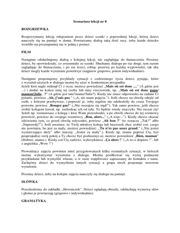 Scenariusz lekcji nr 8 ROZGRZEWKA Rozpoczynamy lekcję odegraniem przez dzieci scenki z poprzedniej lekcji, której dzieci nauczyły się na pamięć w domu. Powtarzamy dialog taką ilość razy, żeby każde dziecko wcieliło się przynajmniej raz w jedną z postaci. FILM Następnie odsłuchujemy dialog z kolejnej lekcji, nie zaglądając do tłumaczenia. Prosimy dzieci, by opowiedziały, co zrozumiały ze scenki. Słuchamy dialogu po raz drugi, tym razem zaglądając do tłumaczenia, i po raz trzeci, robiąc przerwę po każdej wypowiedzi, tak aby dzieci mogły każde wyrażenie powtórzyć (najpierw grupowo, potem indywidualnie). Następnie proponujemy przykłady sytuacji z codziennego życia dzieci, pytając, które z wyrażeń użytych w dialogu można by użyć w konkretnym przypadku. Jeżeli ktoś nagle zniknął Ci z oczu, możesz powiedzieć „Mais où est donc ....” (A gdzie jest ...) i dodać na końcu imię tej osoby lub inny rzeczownik, np. „Mais où est donc papa/ maman/Julie...?” (A gdzie jest tata?mama?Julie?). Kiedy nie znasz odpowiedzi na zadane Ci pytanie, powiesz „Ah, j’sais pas.” („A, nie mam pojęcia.”). Jeśli chcesz na chwilę odejść od osób, z którymi przebywasz, i poprosić je, żeby nigdzie nie odchodziły do czasu Twojego powrotu, powiesz „Bougez pas!” („Nie ruszajcie się stąd!”). Tak samo powiesz, jeśli chcesz zrobić kolegom kawał, np. zachodząc ich od tyłu. To będzie wtedy znaczyło: Nie ruszać się! Jeżeli np. rozmawiasz z kolegą i ktoś Wam przeszkodzi, a po chwili chcesz do tej rozmowy powrócić, powiesz do swojego rozmówcy „Bon, alors...” („A więc...”). Kiedy chcesz okazać zdziwienie tym, co przed chwilą usłyszałeś, powiesz „Ah bon ?” (to oznacza „Tak?” albo „Naprawdę?”). Jeśli uważasz, że Twój młodszy kolega lub braciszek chce zrobić coś, czego nie powinien, bo jest za mały, możesz powiedzieć: „Tu n’es pas assez grand.” („Nie jesteś wystarczająco duży” albo inaczej: „Jesteś za mały”.). Kiedy np. mama poprosi Cię, byś posprzątał(a) swój pokój a Ty chcesz być posłuszny(-a), możesz powiedzieć „Bien, maman” (Dobrze, mamo.). Kiedy coś Cię zadziwi, wykrzykniesz „Ça alors !” („A to ci dopiero !”, lub z angielska „Wow !”) Prowadzący zajęcia powinien mieć przygotowanych kilka rozmaitych sytuacji, w których można wykorzystać wyrażenia z dialogu. Można posiłkować się wyżej podanymi przykładami lub wymyślić własne, a w razie wątpliwości zapraszamy do kontaktu z nami. Zachęćmy dzieci do wymyślenia innych sytuacji a grupa niech proponuje stosowne wyrażenia. Prosimy dzieci, żeby na kolejne zajęcia nauczyły się dialogu na pamięć. SŁÓWKA Przechodzimy do zakładki „Słowniczek”. Dzieci oglądają obrazki, odsłuchują wymowę słów i głośno je powtarzają (grupowo i indywidualnie). GRAMATYKA Przechodzimy do zakładki „Gramatyka”. Po zapoznaniu się z materiałem gramatycznym możemy zaproponować dzieciom ćwiczenie ustne, polegające na tym, że uczniowie po kolei wypowiadają zdanie z przeczeniem według wzoru „Je ne suis pas...” (Nie jestem...), które kończą według własnego uznania, korzystając ze znanych słówek. Dziewczynki mogą np. mówić: Je ne suis pas un garçon - Je ne suis pas une Française. Chłopcy powiedzą: Je ne suis pas une fille – Je ne suis pas un Français – Je ne suis pas un danseur. Inne warianty dla obu płci: Je ne suis pas un professeur – Je ne suis pas un monstre – Je ne suis pas une brute – Je ne suis pas un clown – Je ne suis pas rouge. Można powtórzyć to samo ćwiczenie w drugiej osobie: „Tu n’es pas ...”. Ćwiczenia zawarte w zakładce pod tym samym tytułem dzieci wykonują po ustnym ćwiczeniu lub w domu. WYMOWA Przechodzimy do zakładki „Fonetyka”. Dzieci zapoznają się z materiałem fonetycznym, odsłuchują pliki dźwiękowe i powtarzają nagrane wyrazy. Informujemy, że chętne dzieci mogą poćwiczyć rozróżnianie „o otwartego” od dźwięku [œ] w domu, wykorzystując link do ćwiczeń wskazany na końcu. KULTURA Zapoznajemy się z treścią zakładki „Kultura”. Tekst o Sophie Calle ma na celu przekazanie dzieciom 2 istotnych informacji: • współczesna sztuka może mieć inną formę niż tradycyjny obraz czy rzeźba, może przybierać bardzo różne formy (np. konceptualizm); Pytanie pomocnicze: Czym różni się twórczość Sophie Calle od twórczości innych artystów, którzy są znani dzieciom? • aby zajmować się sztuką, nie trzeba koniecznie być uzdolnionym plastycznie. Nie jest konieczny talent do rysowania, malowania, czy nawet robienia „artystycznych” zdjęć. Liczy się pomysł, wrażliwość, umiejętność dziwienia się, zadawania pytań i szukania na nie odpowiedzi, dociekania, poprzez różne działania czy eksperymenty; Pytanie pomocnicze: Co – zdaniem dzieci – łączy wszystkie twórcze artystycznie osoby, które są przecież tak różne? (wrażliwość, otwartość na świat i ludzi, umiejętność zadawania pytań i chęć poszukiwania na nie odpowiedzi, chęć wyrażania siebie).