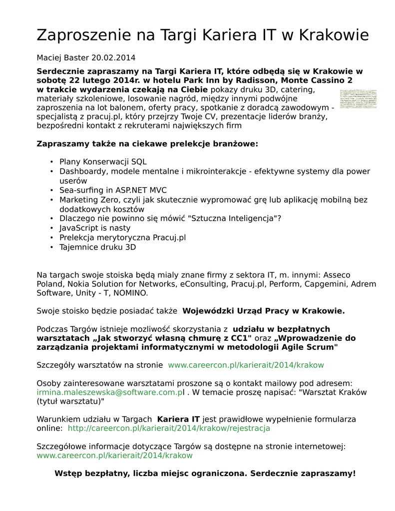 Zaproszenie na Targi Kariera IT w Krakowie Maciej Baster 20.02.2014 Serdecznie zapraszamy na Targi Kariera IT, które odbędą się w Krakowie w sobotę 22 lutego 2014r. w hotelu Park Inn by Radisson, Monte Cassino 2 w trakcie wydarzenia czekają na Ciebie pokazy druku 3D, catering, materiały szkoleniowe, losowanie nagród, między innymi podwójne zaproszenia na lot balonem, oferty pracy, spotkanie z doradcą zawodowym specjalistą z pracuj.pl, który przejrzy Twoje CV, prezentacje liderów branży, bezpośredni kontakt z rekruterami największych firm Zapraszamy także na ciekawe prelekcje branżowe: • Plany Konserwacji SQL • Dashboardy, modele mentalne i mikrointerakcje - efektywne systemy dla power userów • Sea-surfing in ASP.NET MVC • Marketing Zero, czyli jak skutecznie wypromować grę lub aplikację mobilną bez dodatkowych kosztów • Dlaczego nie powinno się mówić "Sztuczna Inteligencja"? • JavaScript is nasty • Prelekcja merytoryczna Pracuj.pl • Tajemnice druku 3D Na targach swoje stoiska będą mialy znane firmy z sektora IT, m. innymi: Asseco Poland, Nokia Solution for Networks, eConsulting, Pracuj.pl, Perform, Capgemini, Adrem Software, Unity - T, NOMINO. Swoje stoisko będzie posiadać także Wojewódzki Urząd Pracy w Krakowie. Podczas Targów istnieje mozliwość skorzystania z udziału w bezpłatnych warsztatach „Jak stworzyć własną chmurę z CC1" oraz „Wprowadzenie do zarządzania projektami informatycznymi w metodologii Agile Scrum" Szczegóły warsztatów na stronie www.careercon.pl/karierait/2014/krakow Osoby zainteresowane warsztatami proszone są o kontakt mailowy pod adresem: [email protected] . W temacie proszę napisać: "Warsztat Kraków (tytuł warsztatu)" Warunkiem udziału w Targach Kariera IT jest prawidłowe wypełnienie formularza online: http://careercon.pl/karierait/2014/krakow/rejestracja Szczegółowe informacje dotyczące Targów są dostępne na stronie internetowej: www.careercon.pl/karierait/2014/krakow Wstęp bezpłatny, liczba miejsc ograniczona. Serdecznie zapraszamy!