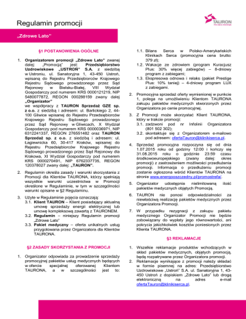 Regulamin promocji „Zdrowe Lato” §1 POSTANOWIENIA OGÓLNE 1. Organizatorem promocji „Zdrowe Lato” zwanej dalej: „Promocją” jest: Przedsiębiorstwo Uzdrowiskowe „USTROŃ” S.A. z siedzibą w Ustroniu, ul. Sanatoryjna 1, 43-450 Ustroń, wpisaną do Rejestru Przedsiębiorców Krajowego Rejestru Sądowego prowadzonego przez Sąd Rejonowy w Bielsku-Białej, VIII Wydział Gospodarczy pod numerem KRS 0000121219, NIP 5480077872, REGON 000288159 zwany dalej „Organizator” we współpracy z TAURON Sprzedaż GZE sp. z o.o. z siedzibą i adresem: ul. Barlickiego 2, 44100 Gliwice wpisanej do Rejestru Przedsiębiorców Krajowego Rejestru Sądowego prowadzonego przez Sąd Rejonowy w Gliwicach, X Wydział Gospodarczy pod numerem KRS 0000036971, NIP 6312241337, REGON 276551482 oraz TAURON Sprzedaż sp. z o.o. z siedzibą i adresem: ul. Łagiewnicka 60, 30-417 Kraków, wpisanej do Rejestru Przedsiębiorców Krajowego Rejestru Sądowego prowadzonego przez Sąd Rejonowy dla Krakowa, XI Wydział Gospodarczy pod numerem KRS 0000270491, NIP 6762337735, REGON 120378027 zwany dalej: „TAURON”. 2. Regulamin określa zasady i warunki skorzystania z Promocji dla Klientów TAURONA, którzy spełniają wszystkie warunki uczestnictwa w Promocji określone w Regulaminie, w tym w szczególności warunki opisane w §2 Regulaminu. 3. Użyte w Regulaminie pojęcia oznaczają: 3.1. Klient TAURON – Klient posiadający aktualną umowę sprzedaży energii elektrycznej lub umowę kompleksową zawartą z TAURONEM. 3.2. Regulamin – niniejszy Regulamin promocji „Zdrowe Lato” 3.3. Pakiet medyczny – oferta unikalnych usług przygotowana przez Organizatora dla Klientów TAURONA. 1.1. Bilans Serca w Polsko-Amerykańskich Klinikach Serca (promocyjna cena brutto: 379 zł); 1.2. Wakacje ze zdrowiem (program Kuracjusz Plus: 30% więcej zabiegów) – 8-dniowy program z zabiegami; 1.3. Ekspresowa odnowa i relaks (pakiet Prestige Plus: 10% taniej) – 4-dniowy program LUX z zabiegami. 2. Promocyjna sprzedaż oferty wymienionej w punkcie 1, polega na umożliwieniu Klientom TAURONA zakupu pakietów medycznych stworzonych przez Organizatora po cenie promocyjnej. 3. Z Promocji może skorzystać Klient TAURONA, który w trakcie promocji: 3.1. zadzwoni pod nr Infolinii Organizatora (801 502 302); 3.2. skontaktuje się z Organizatorem e-mailowo pod adresem: [email protected]. 4. Sprzedaż promocyjna rozpoczyna się od dnia 1.07.2015 roku od godziny 12:00 i kończy się 31.08.2015 roku o godzinie 23:59 czasu środkowoeuropejskiego (zwany dalej: okres promocji) z zastrzeżeniem możliwości przedłużenia promocji. Informacja o przedłużeniu promocji zostanie ogłoszona wśród Klientów TAURONA na stronie www.energooszczedny.pl/promostrefa/. 5. Organizator udostępnia nielimitowaną pakietów medycznych objętych Promocją. ilość 6. TAURON nie ponosi odpowiedzialności za niewłaściwą realizację pakietów medycznych przez Organizatora Promocji. 7. W przypadku rezygnacji z zakupu pakietu medycznego Organizator Promocji nie będzie zobowiązany do wypłaty jego równowartości, ani pokrycia jakichkolwiek kosztów poniesionych przez Klienta TAURONA. §3 REKLAMACJE §2 ZASADY SKORZYSTANIA Z PROMOCJI 1. Organizator odpowiada za prowadzenie sprzedaży promocyjnej pakietów usług medycznych będących w ofercie specjalnej oferowanej Klientom TAURONA, a w szczególności jest to: 1. Wszelkie reklamacje produktów wchodzących w skład pakietów medycznych, objętych promocją, będą rozpatrywane przez Organizatora promocji. 2. Reklamacje wynikające z promocji należy składać w formie pisemnej na adres: Przedsiębiorstwo Uzdrowiskowe „Ustroń” S.A. ul. Sanatoryjna 1, 43450 Ustroń z dopiskiem „Zdrowe Lato” lub drogą elektroniczną na adres e-mail [email protected]. §4 CZAS TRWANIA PROMOCJI 1. Promocja trwa od dnia 1.07.2015 roku od godziny 12:00 i kończy się 31.08.2015 roku o godzinie 23:59 czasu środkowoeuropejskiego §5 POSTANOWIENIA KOŃCOWE 1. W kwestiach nieuregulowanych w Regulaminie stosuje się odpowiednie zapisy kodeksu cywilnego. 2. Zmiana Regulaminu wymaga formy pisemnej pod rygorem nieważności. 3. W przypadku odmiennej regulacji wynikającej z Regulaminu i obowiązującej umowy, pierwszeństwo będą miały postanowienia wynikające z Regulaminu w czasie jego obowiązywania. 4. Regulamin promocji dostępny jest przez cały czas obowiązywania Promocji w siedzibie Organizatorów.