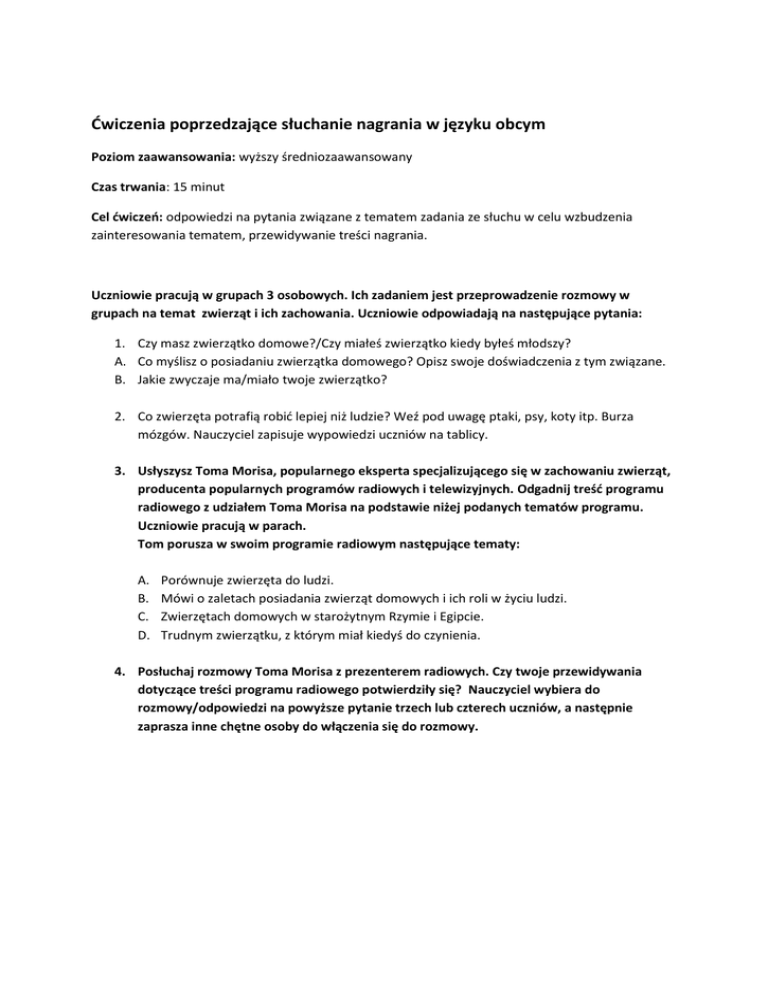 Ćwiczenia poprzedzające słuchanie nagrania w języku obcym Poziom zaawansowania: wyższy średniozaawansowany Czas trwania: 15 minut Cel ćwiczeń: odpowiedzi na pytania związane z tematem zadania ze słuchu w celu wzbudzenia zainteresowania tematem, przewidywanie treści nagrania. Uczniowie pracują w grupach 3 osobowych. Ich zadaniem jest przeprowadzenie rozmowy w grupach na temat zwierząt i ich zachowania. Uczniowie odpowiadają na następujące pytania: 1. Czy masz zwierzątko domowe?/Czy miałeś zwierzątko kiedy byłeś młodszy? A. Co myślisz o posiadaniu zwierzątka domowego? Opisz swoje doświadczenia z tym związane. B. Jakie zwyczaje ma/miało twoje zwierzątko? 2. Co zwierzęta potrafią robić lepiej niż ludzie? Weź pod uwagę ptaki, psy, koty itp. Burza mózgów. Nauczyciel zapisuje wypowiedzi uczniów na tablicy. 3. Usłyszysz Toma Morisa, popularnego eksperta specjalizującego się w zachowaniu zwierząt, producenta popularnych programów radiowych i telewizyjnych. Odgadnij treść programu radiowego z udziałem Toma Morisa na podstawie niżej podanych tematów programu. Uczniowie pracują w parach. Tom porusza w swoim programie radiowym następujące tematy: A. B. C. D. Porównuje zwierzęta do ludzi. Mówi o zaletach posiadania zwierząt domowych i ich roli w życiu ludzi. Zwierzętach domowych w starożytnym Rzymie i Egipcie. Trudnym zwierzątku, z którym miał kiedyś do czynienia. 4. Posłuchaj rozmowy Toma Morisa z prezenterem radiowych. Czy twoje przewidywania dotyczące treści programu radiowego potwierdziły się? Nauczyciel wybiera do rozmowy/odpowiedzi na powyższe pytanie trzech lub czterech uczniów, a następnie zaprasza inne chętne osoby do włączenia się do rozmowy.