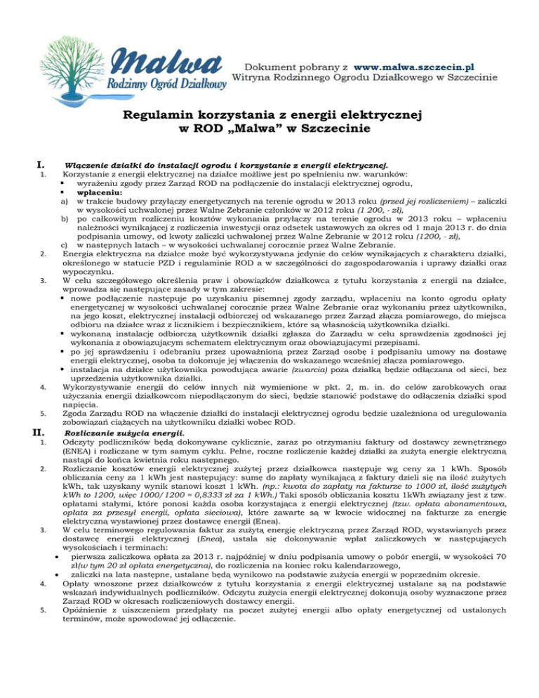 Regulamin korzystania z energii elektrycznej w ROD „Malwa” w Szczecinie I. 1. 2. 3. 4. 5. II. 1. 2. 3. 4. 5. Włączenie działki do instalacji ogrodu i korzystanie z energii elektrycznej. Korzystanie z energii elektrycznej na działce możliwe jest po spełnieniu nw. warunków: wyrażeniu zgody przez Zarząd ROD na podłączenie do instalacji elektrycznej ogrodu, wpłaceniu: a) w trakcie budowy przyłączy energetycznych na terenie ogrodu w 2013 roku (przed jej rozliczeniem) – zaliczki w wysokości uchwalonej przez Walne Zebranie członków w 2012 roku (1 200, - zł), b) po całkowitym rozliczeniu kosztów wykonania przyłączy na terenie ogrodu w 2013 roku – wpłaceniu należności wynikającej z rozliczenia inwestycji oraz odsetek ustawowych za okres od 1 maja 2013 r. do dnia podpisania umowy, od kwoty zaliczki uchwalonej przez Walne Zebranie w 2012 roku (1200, - zł), c) w następnych latach – w wysokości uchwalanej corocznie przez Walne Zebranie. Energia elektryczna na działce może być wykorzystywana jedynie do celów wynikających z charakteru działki, określonego w statucie PZD i regulaminie ROD a w szczególności do zagospodarowania i uprawy działki oraz wypoczynku. W celu szczegółowego określenia praw i obowiązków działkowca z tytułu korzystania z energii na działce, wprowadza się następujące zasady w tym zakresie: nowe podłączenie następuje po uzyskaniu pisemnej zgody zarządu, wpłaceniu na konto ogrodu opłaty energetycznej w wysokości uchwalanej corocznie przez Walne Zebranie oraz wykonaniu przez użytkownika, na jego koszt, elektrycznej instalacji odbiorczej od wskazanego przez Zarząd złącza pomiarowego, do miejsca odbioru na działce wraz z licznikiem i bezpiecznikiem, które są własnością użytkownika działki. wykonaną instalację odbiorczą użytkownik działki zgłasza do Zarządu w celu sprawdzenia zgodności jej wykonania z obowiązującym schematem elektrycznym oraz obowiązującymi przepisami. po jej sprawdzeniu i odebraniu przez upoważnioną przez Zarząd osobę i podpisaniu umowy na dostawę energii elektrycznej, osoba ta dokonuje jej włączenia do wskazanego wcześniej złącza pomiarowego. instalacja na działce użytkownika powodująca awarie (zwarcia) poza działką będzie odłączana od sieci, bez uprzedzenia użytkownika działki. Wykorzystywanie energii do celów innych niż wymienione w pkt. 2, m. in. do celów zarobkowych oraz użyczania energii działkowcom niepodłączonym do sieci, będzie stanowić podstawę do odłączenia działki spod napięcia. Zgoda Zarządu ROD na włączenie działki do instalacji elektrycznej ogrodu będzie uzależniona od uregulowania zobowiązań ciążących na użytkowniku działki wobec ROD. Rozliczanie zużycia energii. Odczyty podliczników będą dokonywane cyklicznie, zaraz po otrzymaniu faktury od dostawcy zewnętrznego (ENEA) i rozliczane w tym samym cyklu. Pełne, roczne rozliczenie każdej działki za zużytą energię elektryczną nastąpi do końca kwietnia roku następnego. Rozliczanie kosztów energii elektrycznej zużytej przez działkowca następuje wg ceny za 1 kWh. Sposób obliczania ceny za 1 kWh jest następujący: sumę do zapłaty wynikającą z faktury dzieli się na ilość zużytych kWh, tak uzyskany wynik stanowi koszt 1 kWh. (np.: kwota do zapłaty na fakturze to 1000 zł, ilość zużytych kWh to 1200, więc 1000/1200 = 0,8333 zł za 1 kWh.) Taki sposób obliczania kosztu 1kWh związany jest z tzw. opłatami stałymi, które ponosi każda osoba korzystająca z energii elektrycznej (tzw. opłata abonamentowa, opłata za przesył energii, opłata sieciowa), które zawarte są w kwocie widocznej na fakturze za energię elektryczną wystawionej przez dostawcę energii (Enea). W celu terminowego regulowania faktur za zużytą energię elektryczną przez Zarząd ROD, wystawianych przez dostawcę energii elektrycznej (Enea), ustala się dokonywanie wpłat zaliczkowych w następujących wysokościach i terminach: pierwsza zaliczkowa opłata za 2013 r. najpóźniej w dniu podpisania umowy o pobór energii, w wysokości 70 zł(w tym 20 zł opłata energetyczna), do rozliczenia na koniec roku kalendarzowego, zaliczki na lata następne, ustalane będą wynikowo na podstawie zużycia energii w poprzednim okresie. Opłaty wnoszone przez działkowców z tytułu korzystania z energii elektrycznej ustalane są na podstawie wskazań indywidualnych podliczników. Odczytu zużycia energii elektrycznej dokonują osoby wyznaczone przez Zarząd ROD w okresach rozliczeniowych dostawcy energii. Opóźnienie z uiszczeniem przedpłaty na poczet zużytej energii albo opłaty energetycznej od ustalonych terminów, może spowodować jej odłączenie. III. 1. 2. 3. 4. IV. 1. 2. 3. 4. 5. V. 1. 2. 3. 4. 5. 6. 7. VI. 1. 2. 3. VII. Opłata energetyczna. Wprowadza się pojęcie opłaty energetycznej. Opłata energetyczna jest corocznie uchwalana przez Walne Zebranie ROD, na uzasadniony wniosek Zarządu ROD. Opłata ta jest przeznaczana na pokrycie strat powstających w trakcie dostarczania energii wewnątrz ogrodu (tzw. ubytków energii elektrycznej) oraz kosztów konserwacji i zarządzania przyłączami doprowadzającymi energię elektryczną do działek. Opłata energetyczna nie może być wyliczona proporcjonalnie od zużycia 1 kWh oraz sumowana z ceną stosowaną za 1 kWh przez dostawcę energii elektrycznej. Wysokość opłaty energetycznej ustalana jest na podstawie danych z roku ubiegłego w szczególności strat wynikających z różnic pomiędzy wskazaniami licznika głównego a sumą wskazań wszystkich podliczników do niego podłączonych. Dane te powinny być podstawą uzasadnienia opłaty, o której mowa w pkt. 2. W pierwszym roku ustala się opłatę energetyczną w wysokości 20 zł (dwadzieścia) dla działek korzystających z energii elektrycznej. Nadzór i konserwacja przyłączy energetycznych. Nadzór i konserwacja przyłączy energetycznych należy do zadań Zarząd