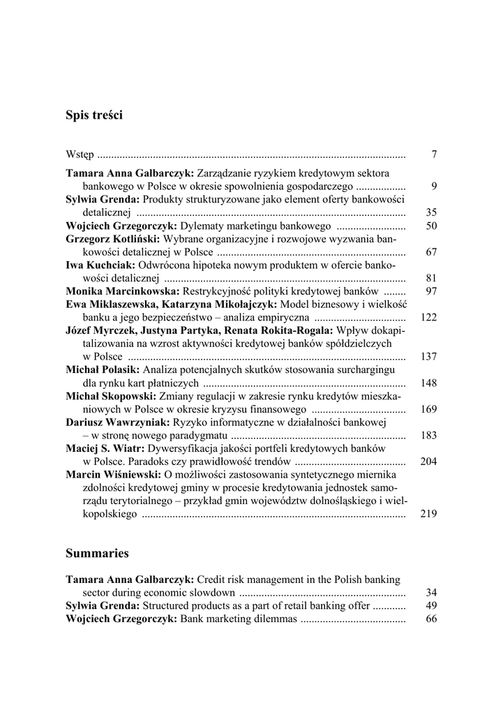 Spis treści Wstęp ............................................................................................................... Tamara Anna Galbarczyk: Zarządzanie ryzykiem kredytowym sektora bankowego w Polsce w okresie spowolnienia gospodarczego .................. Sylwia Grenda: Produkty strukturyzowane jako element oferty bankowości detalicznej ................................................................................................. Wojciech Grzegorczyk: Dylematy marketingu bankowego ......................... Grzegorz Kotliński: Wybrane organizacyjne i rozwojowe wyzwania bankowości detalicznej w Polsce .................................................................... Iwa Kuchciak: Odwrócona hipoteka nowym produktem w ofercie bankowości detalicznej ....................................................................................... Monika Marcinkowska: Restrykcyjność polityki kredytowej banków ........ Ewa Miklaszewska, Katarzyna Mikołajczyk: Model biznesowy i wielkość banku a jego bezpieczeństwo – analiza empiryczna ................................. Józef Myrczek, Justyna Partyka, Renata Rokita-Rogala: Wpływ dokapitalizowania na wzrost aktywności kredytowej banków spółdzielczych w Polsce .................................................................................................... Michał Polasik: Analiza potencjalnych skutków stosowania surchargingu dla rynku kart płatniczych ......................................................................... Michał Skopowski: Zmiany regulacji w zakresie rynku kredytów mieszkaniowych w Polsce w okresie kryzysu finansowego .................................. Dariusz Wawrzyniak: Ryzyko informatyczne w działalności bankowej – w stronę nowego paradygmatu ............................................................... Maciej S. Wiatr: Dywersyfikacja jakości portfeli kredytowych banków w Polsce. Paradoks czy prawidłowość trendów ........................................ Marcin Wiśniewski: O możliwości zastosowania syntetycznego miernika zdolności kredytowej gminy w procesie kredytowania jednostek samorządu terytorialnego – przykład gmin województw dolnośląskiego i wielkopolskiego ............................................................................................... 7 9 35 50 67 81 97 122 137 148 169 183 204 219 Summaries Tamara Anna Galbarczyk: Credit risk management in the Polish banking sector during economic slowdown ............................................................ Sylwia Grenda: Structured products as a part of retail banking offer ............ Wojciech Grzegorczyk: Bank marketing dilemmas ...................................... 34 49 66 6 Spis treści Grzegorz Kotliński: Selected organizational and developmental challenges in the retail banking in Poland ................................................................... Iwa Kuchciak: Reverse mortgage as retail banking new product .................. Monika Marcinkowska: The restrictiveness of bank’s lending policy ......... Ewa Miklaszewska, Katarzyna Mikołajczyk: Bank size and business model and its soundness: empirical analysis ............................................. Józef Myrczek, Justyna Partyka, Renata Rokita-Rogala: An impact of the capitalisation of the cooperative banks on increasing their lending activity ....................................................................................................... Michał Polasik: Analysis of potential effects of surcharging on the payment cards market .............................................................................................. Michał Skopowski: Regulatory changes related to mortgage loans during the financial crisis in Poland ..................................................................... Dariusz Wawrzyniak: Information security risk in banking – towards new paradigm .................................................................................................... Maciej S. Wiatr: Credit portfolio quality diversification in Polish banking. Paradox or trend ........................................................................................ Marcin Wiśniewski: About the possibility of application of synthetic indicator of community’s creditability in crediting process – an example of Lower Silesian and Greater Poland voivodeships’ communities .......... 80 96 121 135 147 168 182 203 218 234 Wstęp W większości publikacji ukazujących się w naszym kraju przez bankowość detaliczną rozumie się obszar bankowości, w ramach którego świadczone są usługi małym przedsiębiorstwom i osobom fizycznym. W ostatnich latach ta bankowość rozwijała się w Polsce bardzo intensywnie. Wszystko wskazuje na to, że w najbliższej przyszłości ten wzrostowy trend będzie utrzymany. Trzeba wyraźnie podkreślić, że bardzo szybki rozwój bankowości detalicznej widoczny jest również we wszystkich tych krajach Europy Środkowej i Wschodniej, które przed niespełna dwudziestu laty zaczęły tworzyć zręby gospodarki rynkowej. Kraje Europy Zachodniej natomiast mają już za sobą okres szybkiego tempa wzrostu bankowości detalicznej. Banki tam działające poszukują przede wszystkim sposobów racjonalizacji kosztów świadczenia usług i ich doskonalenia. Nie ulega wątpliwości, że powinniśmy w tych krajach analizować działalność związaną z bankowością detaliczną i starać się adaptować doświadczenia w tym zakresie do naszych polskich uwarunkowań. Może to zapobiec popełnianiu błędów wdrażania nietrafionych rozwiązań. W krajach Europy Zachodniej od wielu lat odbywają się konferencje poświęcone bankowości detalicznej. Przykładem jest coroczna konferencja CEE Retail Banking, której szósta edycja odbywała się 29-30 października 2009 r. w Wiedniu. W Polsce jest niewiele przykładów podejmowania tego typu działań. Chodzi przede wszystkim o spotkania ogólnopolskie z udziałem prz