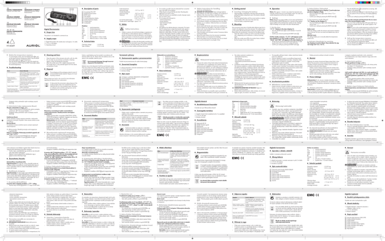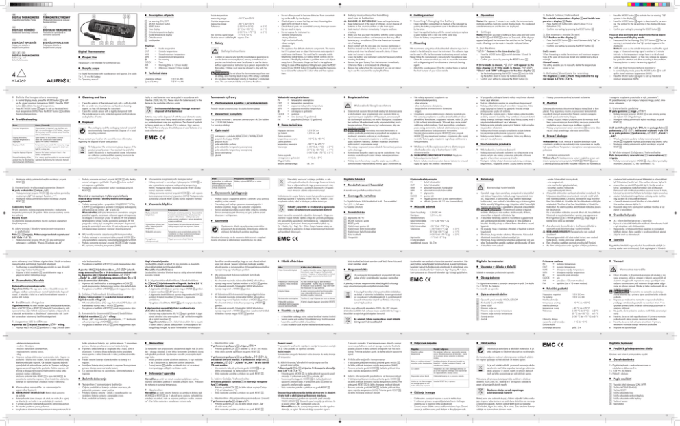 Digital Thermometer Operation and Safety Notes Digitális hőmérő Kezelési és biztonsági utalások Digitální teploměr Pokyny pro obsluhu a bezpečnostní pokyny 8 Termometr cyfrowy 1 Description of parts Q 2 Wskazówki dotyczące obsługi i bezpieczeństwa Ice warning ON / OFF MODE (function) button 3 RESET button 4 Time display 5 Outside temperature display 6 Inside temperature display 7 Outside sensor 8 Loudspeaker 1 2 Digitalni termometer Navodila za upravljanje in varnostna opozorila Digitálny teplomer 7 Pokyny pre obsluhu a bezpečnostné pokyny 6 5 4 3 1 D igital-Thermometer Proper Use Q The product is not intended for commercial use. Supply scope Q 4 1 x Digital thermometer with outside sensor and approx. 3 m cable 1 x 1.5 V , AA battery 1 x Operating manual H14269 Delete the temperature memory Cleaning and Care Q jIn normal display mode, press the MODE button 2 to call up the stored maximum temperature (MAX). Press the RESET button 3 to delete the stored temperatures. jPress the MODE button 2 again to call up the stored minimum temperature (MIN). Press the RESET button 3 to delete the stored temperatures. Troubleshooting Q j Clean the exterior of the instrument only with a soft, dry cloth. jDo not under any circumstances use liquids or cleaning agents, as they will damage the instrument. jClean the outside sensor with a slightly dampened cloth. The outside sensor is only protected against rain from above and splashes of water. Disposal Q Error Incorrect temperature Cause / Remedy Measurement is impaired, e.g. by direct sunlight, air-conditioning or a fan heater – remove the instrument and the outside sensor from the area of interference. Display diminishes / incorrect temperature is displayed Spent battery or dirty battery contacts – clean the contacts and insert battery; replace the battery if necessary. Display is black Temperatures are outside the measuring range or instrument has been exposed to direct sunlight for a long time. Irregular display of figures Remove the battery and put it back in the battery compartment. The packaging and the packaging material consist of environmentally friendly materials. Dispose of in local recycling containers. Please contact your local or city council for more information regarding the disposal of your used product. GB 3. Ustawienie trybu zapisywania (Reset) W polu wskaźnika 6 miga „iD “. jNależy nacisnąć przycisk MODE 2 , aby wybrać pomiędzy codziennym „iD “ lub ręcznym Resetem „--”. jNastępnie należy potwierdzić wybór naciskając przycisk RESET 3 . Codzienny Reset: W tym ustawieniu zostaną zapisane minimalne i maksymalne temperatury minionych 24 godzin i które zawsze zostaną usunięte o północy. Ręczny Reset: To ustawienia zawsze umożliwia ręczne usunięcie zapisanych dotąd temperatur. 4. Aktywacja / deaktywacja ostrzegacza o gołoledzi Pola 5 i 6 migają. Pokazują przedział sygnału od 3.0 °C do –1.0 °C. jNależy nacisnąć przycisk MODE 2 , aby zaktywować ostrzagacz o gołoledzi. W polu 5 pokaże się „ “. 1.5 V DC 1.5 V , AA Üzemeltetés / Kezelés Q Automatikus visszakapcsolás Figyelmeztetés: Kb. egy perc múlva a készülék minden tetszőleges módban automatikusan normál kijelzőmódba kapcsol vissza. A készülék a külső és a belső hőmérsékletet valamint a pontos időt mutatja. jNależy ponownie nacisnąć przycisk MODE 2 , aby deaktywować ostregacz o gołoledzi. W polu 5 zniknie symbol ostrzegacza o gołoledzi. jNastępnie należy potwierdzić wybór naciskając przycisk RESET 3 . Również w normalnym trybie wyświetlania można aktywować i deaktywować ostrzegacz o gołoledzi. jNależy nacisnąć jeden z przycisków WŁĄCZONY / WYŁĄCZONY 1 ostrzegacza o gołoledzi. Ostrzegacz jest włączony, jeśli pokazuje się symbol „ “ w polu 5 . Wskazówka: Jeśli tylko temperatura zewnętrzna osiągnie przedział sygnału, zacznie się odzywać sygnał ostrzegawczy w odstępie 5 minutowym przez 16 sekund. W tym przedziale temperatury istnieje ryzyko powstania gołoledzi. W tym przypadku należy być szczególnie ostrożnym i dopasować jazdę do zaistniałych warunków. W celu wyłączenia sygnału ostrzegawczego wystarczy nacisnąć dowolny przycisk. Beállítások elvégzése Figyelmeztetés: Az elem minden egyes behelyezését követően, illetve a MODE 2 és a RESET 3 billentyűk 2 másodpercig való nyomva tartása útján feltűnik valamennyi kijelzés a képernyőn és a készülék ezt követően a „Beállítások” üzemmódba vált. Az itt leírt sorrendben valamennyi beállítás elvégezhető. 1. Az pontos idő beállítása: A pontos idő 4 kijelző mezőben „1 2 h®“ villog. jNyomja meg a MODE 2 gombot a 12 vagy 24 órás üzem- Wywoływanie zapisanych temperatur jNależy nacisnąć w normalnym trybie przycisk MODE 2 w celu wyświetlenia zapisanej maksymalnej temperatury (MAX). jNależy ponownie nacisnąć przycisk MODE 2 aby wyświetlić zapisaną minimalną temperaturę (MIN). Varnostna navodila za ravnanje in uporabo baterij Q g N evarnost eksplozije! Baterij nikoli ponovno ne polnite! JBaterije hranite izven dosega rok otrok, ne vrzite jih v ogenj, ne sklenite jih na kratko in ne poskušajte jih razstaviti. JV primeru zaužitve baterije takoj poiščite zdravniško pomoč. JPri vstavitvi pazite na pravo polarnost. JIzogibajte se ekstremnim temperaturam in temperaturam, ki bi SI Zastosowanie zgodne z przeznaczeniem Q Environmental damage through incorrect disposal of the batteries! Produkt nie jest przeznaczony do użytku komercyjnego. mód kiválasztásához. j Nyugtázza a beállítást a RESET 3 gomb megnyomása útján. A pontos idő 4 kijelzőmezőben „ 0 0 : 0 0 “ jelenik meg, amennyiben Ön a 24 órás üzemmódot aktiválta. A pontos idő 4 kijelző mezőben „1 2 : 0 0 “, „Clock“ és „AM” jelenik meg, amennyiben Ön a 12 órás üzemmódot aktiválta. jA pontos idő beállításához a számjegyeket a MODE 2 gomb m
