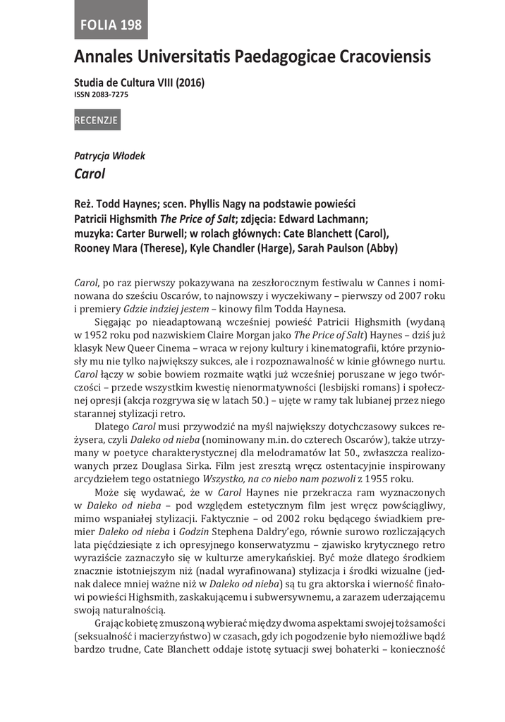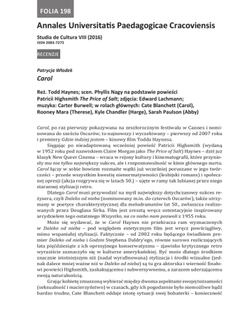 FOLIA 198 Annales Universitatis Paedagogicae Cracoviensis Studia de Cultura VIII (2016) ISSN 2083-7275 Recenzje Patrycja Włodek Carol Reż. Todd Haynes; scen. Phyllis Nagy na podstawie powieści Patricii Highsmith The Price of Salt; zdjęcia: Edward Lachmann; muzyka: Carter Burwell; w rolach głównych: Cate Blanchett (Carol), Rooney Mara (Therese), Kyle Chandler (Harge), Sarah Paulson (Abby) Carol, po raz pierwszy pokazywana na zeszłorocznym festiwalu w Cannes i nominowana do sześciu Oscarów, to najnowszy i wyczekiwany – pierwszy od 2007 roku i premiery Gdzie indziej jestem – kinowy film Todda Haynesa. Sięgając po nieadaptowaną wcześniej powieść Patricii Highsmith (wydaną w 1952 roku pod nazwiskiem Claire Morgan jako The Price of Salt) Haynes – dziś już klasyk New Queer Cinema – wraca w rejony kultury i kinematografii, które przyniosły mu nie tylko największy sukces, ale i rozpoznawalność w kinie głównego nurtu. Carol łączy w sobie bowiem rozmaite wątki już wcześniej poruszane w jego twórczości – przede wszystkim kwestię nienormatywności (lesbijski romans) i społecznej opresji (akcja rozgrywa się w latach 50.) – ujęte w ramy tak lubianej przez niego starannej stylizacji retro. Dlatego Carol musi przywodzić na myśl największy dotychczasowy sukces reżysera, czyli Daleko od nieba (nominowany m.in. do czterech Oscarów), także utrzymany w poetyce charakterystycznej dla melodramatów lat 50., zwłaszcza realizowanych przez Douglasa Sirka. Film jest zresztą wręcz ostentacyjnie inspirowany arcydziełem tego ostatniego Wszystko, na co niebo nam pozwoli z 1955 roku. Może się wydawać, że w Carol Haynes nie przekracza ram wyznaczonych w Daleko od nieba – pod względem estetycznym film jest wręcz powściągliwy, mimo wspaniałej stylizacji. Faktycznie – od 2002 roku będącego świadkiem premier Daleko od nieba i Godzin Stephena Daldry’ego, równie surowo rozliczających lata pięćdziesiąte z ich opresyjnego konserwatyzmu – zjawisko krytycznego retro wyraziście zaznaczyło się w kulturze amerykańskiej. Być może dlatego środkiem znacznie istotniejszym niż (nadal wyrafinowana) stylizacja i środki wizualne (jednak dalece mniej ważne niż w Daleko od nieba) są tu gra aktorska i wierność finałowi powieści Highsmith, zaskakującemu i subwersywnemu, a zarazem uderzającemu swoją naturalnością. Grając kobietę zmuszoną wybierać między dwoma aspektami swojej tożsamości (seksualność i macierzyństwo) w czasach, gdy ich pogodzenie było niemożliwe bądź bardzo trudne, Cate Blanchett oddaje istotę sytuacji swej bohaterki – konieczność Carol [173] podejmowania ciągłej gry pozorów z otoczeniem i maskowania uczuć. Carol jest starsza i bardziej doświadczona, pozostaje więc chłodna i powściągliwa, nauczona kontroli emocji. Z pewnym niedowierzaniem patrzy na Therese (Rooney Mara), która, jeszcze bez podobnego bagażu, z większą otwartością wchodzi w ich relację i o nią zabiega. Z nich dwóch to jednak Therese zostaje oddana racja – także przez Carol, dokonującą wspomnianego już i kluczowego w fabule wyboru. Przywodzi on na myśl Laurę Brown ze wspomnianych Godzin, podobnie bowiem jak Michael Cunningham (autor Godzin) i Daldry, także Highsmith i Haynes przyznają bohaterkom kontrolę i sprawstwo, choć za bycie sobą trzeba zapłacić cenę. O ile nie jest to może aż tak zaskakujące w XXI wieku (choć kwestie nienormatywności, a zwłaszcza odrzucenia macierzyństwa, pozostają na uboczu kina głównego nurtu), to musiało szokować w latach 50. przyzwyczajonych bądź do ignorowania tej tematyki, bądź przywracania jej bohaterów na łono społeczeństwa lub ich symbolicznego karania. Haynes – sięgając po powieść Highsmith ponad pół wieku po jej wydaniu – nie tylko nie szokuje, ale normalizuje to, co w kinie nadal zwykło uważać się za transgresję.