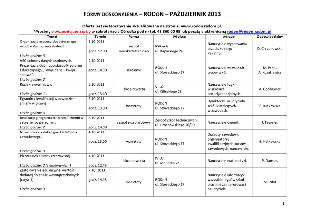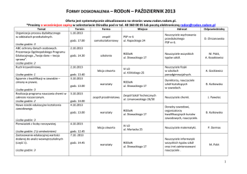 FORMY DOSKONALENIA – RODON – PAŹDZIERNIK 2013 Oferta jest systematycznie aktualizowana na stronie: www.rodon.radom.pl. *Prosimy o wcześniejsze zapisy w sekretariacie Ośrodka pod nr tel. 48 360 00 05 lub pocztą elektroniczną [email protected] Temat Organizacja procesu dydaktycznego w oddziałach przedszkolnych. Termin 1.10.2013 godz. 17.00 Liczba godzin: 3 ABC ochrony danych osobowych. Prezentacja Ogólnopolskiego Programu Edukacyjnego „Twoje dane – twoja sprawa”. Liczba godzin: 2 Ruch krzywoliniowy. Forma godz. 14.30 PSP nr 6 ul. Rapackiego 24 Nauczyciele wychowania przedszkolnego PSP nr 6. D. Chrzanowska szkolenie RODoN ul. Słowackiego 17 Nauczyciele wszystkich typów szkół. M. Pskit, A. Kozakiewicz VI LO ul. Kilińskiego 25 Nauczyciele fizyki w szkołach ponadgimnazjalnych. A. Gockiewicz RODoN ul. Słowackiego 17 Dyrektorzy, nauczyciele szkół kształcących w zawodach. B. Kutkowska Zespół Szkół Technicznych ul. Limanowskiego 26/30 Nauczyciele chemii. RODoN ul. Słowackiego 17 Doradcy zawodowi, organizatorzy kwalifikacyjnych kursów zawodowych, nauczyciele. B. Kutkowska IV LO ul. Mariacka 25 Nauczyciele matematyki. P. Darmas RODoN ul. Słowackiego 17 Nauczyciele informatyki wszystkich typów szkół oraz inni zainteresowani nauczyciele . M. Pskit 2.10.2013 godz. 13.40 3.10.2013 warsztaty 3.10.2013 zespół przedmiotowy godz. 14.00 4.10.2013 godz. 13.00 Liczba godzin: 3 Pierwiastek z liczby rzeczywistej. warsztaty 4.10.2013 lekcja otwarta Liczba godzin: 2 (z omówieniem) Zastosowanie edukacyjnej wartości dodanej do analiz wewnątrzszkolnych (część 1). Liczba godzin: 3 Odpowiedzialny 2.10.2013 godz. 13.00 Liczba godzin: 3 Realizacja programu nauczania chemii w zakresie rozszerzonym. Liczba godzin: 2 Nowe ścieżki edukacyjne kształcenia zawodowego. Adresat zespół samokształceniowy lekcja otwarta Liczba godzin: 1 Egzamin z kwalifikacji w zawodzie – zmiany w prawie. Miejsce godz. 12.45 7.10. 2013 godz. 14.45 warsztaty J. Pawelec 1 Praca z maturzystą – etapy pracy nad prezentacją maturalną. Liczba godzin: 2 Konkurs czytelniczy szansą na rozbudzenie zainteresowań lekturą młodzieży w szkole ponadgimnazjalnej. Liczba godzin: 2 Matura z geografii 2013 - poziom podstawowy. Liczba godzin: 2 Opracowanie autorskich i innowacyjnych programów nauczania. Przykłady dobrych praktyk. Liczba godzin: 4 Placówka promująca zdrowy styl życia – kulinarne zabawy dla niejadków. 7.10.2013 lekcja otwarta godz. 11.55 7.10.2013 godz. 15.15 7.10.2013 godz. 14.30 ZSO nr 6 ul. Kilińskiego 25 warsztaty RODoN ul. Słowackiego 17 9.10.2013 warsztaty PP nr 1 ul. Zientarskiego 3 Nauczyciele poloniści, uczniowie. E. Zawodnik Nauczyciele poloniści, bibliotekarze. E. Zawodnik Nauczyciele geografii szkół ponadgimnazjalnych. Nauczyciele przedszkoli, szkół podstawowych i gimnazjów. Nauczyciele wychowania przedszkolnego i edukacji wczesnoszkolnej. J. Kwiatkowska J. Siemiątkowska D. Chrzanowska B. Jankowska 9.10.2013 godz. 14.00 RODoN ul. Słowackiego 17 Zainteresowani nauczyciele. K. Ziomek Zespół Szkół Technicznych ul. Limanowskiego 26/30 Nauczyciele chemii. J. Pawelec warsztaty Zespół Szkół Elektronicznych ul. Sadkowska 19 (sala 107) Nauczyciele wychowania fizycznego. J. Kuczyński warsztaty RODoN ul. Słowackiego 17 Nauczyciele przedszkoli, szkół podstawowych i gimnazjów. lekcja otwarta PSP nr 13 ul. Sienkiewicza 31 warsztaty 9.10.2013 lekcja otwarta Liczba godzin: 1 Jak motywować ucznia do wysiłku fizycznego, aby był przyjemnością a nie przykrym obowiązkiem? Liczba godzin: 4 Konkurs piosenki klasowej: „Klasowe muzykowanie” Jak zaplanować przedsięwzięcie oraz przygotować dzieci i młodzież do jego realizacji? Liczba godzin: 4 Wędrówki po Europie. Audycja muzyczna. Liczba godzin: 2 V LO ul. Traugutta 52a warsztaty godz. 15.00 8.10.2013 godz. 16.30 Liczba godzin: 4 Wspomaganie rozwoju dziecka młodszego: przykłady zabaw integrujących półkule mózgowe. Liczba godzin: 2 Rodzaje paliw kopalnych. warsztaty II LO ul. Kusocińskiego 8 godz. 8.50 10.10.2013 godz. 16.00 10.10.2013 godz. 14.30 10.10.2013 godz. 10.30 Zainteresowani nauczyciele. J. Siemiątkowska K. Ziomek 2 Awans zawodowy nauczyciela – podstawa prawna 11.10.2013 godz. 13.00 Liczba godzin: 3 Integracja zespołu klasowego. Liczba godzin: 3 Błękitny pakiet-wykorzystanie nowoczesnych materiałów dydaktycznych w nauczaniu o zmianach klimatu na przedmiotach przyrodniczych. Liczba godzin: 2 Projekt w pracy Szkolnego Klubu Europejskiego – tworzymy ankietę. Liczba godzin: 3 Placówka promująca zdrowy styl życia – kulinarne zabawy dla niejadków. godz. 15.00 warsztaty RODoN ul. Słowackiego 17 Zainteresowani nauczyciele. A. Siczek warsztaty ZSO nr 6 ul. Kilińskiego 25 warsztaty RODoN ul. Słowackiego 17 Opiekunowie SKE. warsztaty RODoN ul. Słowackiego 17 Nauczyciele przedszkoli, szkół i placówek. G. Syta Nauczyciele wychowania przedszkolnego i edukacji wczesnoszkolnej. D. Chrzanowska B. Jankowska Nauczyciele przyrody szkół ponadgimnazjalnych. J. Kwiatkowska A. Rdzanek 16.10.2013 godz. 13.30 16.10.2013 warsztaty 16.10.2013 PP nr 1 ul. Zientarskiego 3 warsztaty PSP nr 13 ul. Sienkiewicza 31 Zainteresowani nauczyciele. K. Ziomek warsztaty RODoN ul. Słowackiego 17 Nauczyciele wok-u i języka polskiego szkół ponadgimnazjalnych. A. Nobis Zespół Szkół Elektronicznych ul. Sadkowska 19 (sala gimnastyczna) Nauczyciele wychowania fizycznego. J. Kuczyński godz. 14.00 17.10.2013 17.10.2013 godz. 16.00 Liczba godzin: 3 B. Kutkowska 16.10.2013 godz. 13.00 Liczba godzin: 2 Nauczanie zbicia piłki i doskonalenie bloku w siatkówce. Zainteresowani nauczyciele. godz. 15.00 15.10.2013 godz. 16.30 Liczba godzin: 4 Wspomaganie rozwoju dziecka młodszego: „gimnastyka buzi i języka”. Liczba godzin: 2 Pomysł na lekcje wok-u w kontekście matury ustnej od 2015 roku. RODoN ul. Słowackiego 17 11.10.2013 godz. 15.30 Liczba godzin: 3 Pomoc psychologiczno-pedagogiczna w świetle przepisów