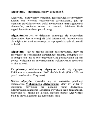 Algorytmy – definicja, cechy, złożoność. Algorytmy napotykamy wszędzie, gdziekolwiek się zwrócimy. Rządzą one wieloma codziennymi czynnościami, jak np. wymiana przedziurawionej dętki, montowanie szafy z gotowych elementów, robienie swetra na drutach, dzielenie liczb, wypełnienie formularza podatkowego. Algorytmika jest to dziedzina zajmująca się tworzeniem algorytmów. Jest to więcej niż dział informatyki. Jest ona ważna dla większości nauk matematyczno – przyrodniczych, ekonomii, techniki. Algorytm – jest to przepis (sposób postępowania), który ma prowadzić do rozwiązania określonego zadania. Przyjmuje się, że przepis ten jest na tyle precyzyjny, że posługiwanie się nim polega wyłącznie na automatycznym wykonywaniu zawartych w nim poleceń. Za pierwszy niebanalny algorytm uważa się algorytm Euklidesa – wyszukiwanie NWD dwóch liczb (400 a 300 rok przed narodzeniem Chrystusa). Nazwa algorytm wywodzi się od nazwiska perskiego matematyka Muhammeda Alchwarizmi, który żył w IX w. i któremu przypisuje się podanie reguł dodawania, odejmowania, mnożenia i dzielenia zwykłych liczb dziesietnych. Nazwisko to, pisane po łacinie, przyjęło postać Algorismus. Stąd do słowa algorytm już tylko mały krok. Cechy algorytmu: • wykonalność – polecenia zawarte w algorytmie są wykonywalne, tzn. dostępne, a pisząc algorytm wystarczy się nimi tylko posłużyć. • posiadanie wejścia i wyjścia – wejście oznacza zwykle pewne dane pobierane przez algorytm w celu ich przetworzenia, wyjście odnosi się do wyniku działania algorytmu. • skończoność – algorytm powinien zakończyć swoje działanie po skończonej liczbie kroków. • określoność - każda operacja w algorytmie powinna być sformułowana tak, aby zapewnić jej jednoznaczną interpretację. Zestawienie wymienionych cech algorytmów Podstawowe pytania pojawiające się w czasie badań nad obliczeniami: • Jak dla określonego zadania znaleźć efektywny algorytm? • Jeśli algorytm już znaleziono, to jak porównać go z innymi, które rozwiązują podobne zadania? • Jak udowodnić poprawność algorytmu? • W jakim sensie można wykazać, że pewne algorytmy są „najlepszymi z możliwych”? Odpowiedzi na te pytania można uzyskać dzięki dziedzinie zwanej analiza algorytmów, której zasadnicze kierunki dotyczą poprawności i złożoności obliczeniowej. Poprawność dotyczy przede wszystkim pojęć i metod związanych z dowodzeniem poprawności algorytmów, takich m.in. jak: • własność stopu – algorytm musi osiągnąć swój logiczny koniec i zatrzymać się • częściowa poprawność – program nigdy nie może zatrzymać się ze złymi wynikami • metoda niezmienników – niezmienniki pozostają prawdziwe bez względu na to, jak często się je osiąga – przejście z jednego punktu kontrolnego do drugiego nie narusza żadnych własności niezmienników. Złożoność obliczeniowa koncentruje się na określeniu zasobów (czas obliczeń i pamięć), jakie są potrzebne do wykonania badanego algorytmu. Złożoność obliczeniowa Oceny złożoności można dokonać według różnych kryteriów. Często stosowana jest metoda polegająca na badaniu, jak zwiększają się zasoby potrzebne do wykonania algorytmu wraz ze wzrostem rozmiaru danych wejściowych. Rozmiar danych wejściowych nazywać będziemy rozmiarem zadania, albo rozmiarem wejścia, przyjmując, że jest to konkretna liczba charakteryzująca objętość danych wejściowych. Jako przykłady rozmiarów wejścia można wymienić: • wymiary macierzy w zadaniu mnożenia macierzy • liczbę elementów tablicy wejściowej w algorytmach sortowania • liczbę n w obliczeniach n! Złożoność czasowa algorytmu – czas potrzebny na wykonanie algorytmu w funkcji rozmiaru zadania. Asymptotyczna złożoność czasowa – charakter złożoności czasowej przy dążeniu do wartości granicznej wraz ze wzrostem rozmiaru zadania. Złożoność pamięciowa algorytmu – pamięć potrzebna na wykonanie algorytmu w funkcji rozmiaru zadania. Asymptotyczna złożoność pamięciowa – charakter złożoności pamięciowej przy dążeniu do wartości granicznej wraz ze wzrostem rozmiaru zadania. Wprowadzenie asymptotycznej złożoności algorytmu jest szczególnie ważne, gdyż przy jej pomocy można określić rozmiar zadań, które mogą być rozwiązane za pomocą tego algorytmu. Jeśli np. algorytm przetwarza wejście o rozmiarze n w czasie cn2, gdzie c jest pewną stałą, wówczas mówimy, że złożoność czasowa tego jest rzędu cn2, co zapisujemy jako O(n2) i czytamy ”duże o od n kwadrat”. Pewna nieujemna funkcja f(n) jest O(g(n)), jeśli istnieje taka stała c, że 0 ≤ f(n) ≤ cg(n) dla wszystkich n oprócz pewnego, być może pustego, zbioru nieujemnych wartości n. Symbol O(g(n)) jest zaliczany do tzw. notacji asymptotycznych, używanych do opisu asymptotycznego czasu działania algorytmów. Na rysunku a) podano interpretację graficzną notacji O. Wynika z niej, że przy pomocy zapisu f(n) = O(g(n)) podaje się górne ograniczenie funkcji z dokładnością do stałego współczynnika. Bardziej precyzyjne zapis ten oznacza, że istnieją dodatnie stałe c i no takie, że na prawo od no wartość f(n) jest zawsze nie większa niż cg(n). Interpretacja graficzna Na rysunkach b) i c) przedstawiono w podobny sposób notacje Θ i Ω, będące także przykładami notacji asymptotycznych. W odróżnieniu od notacji O, która ogranicza funkcję z góry, notacja Ω (rys b) ogranicza funkcję z dołu. Zapis f(n) = Ω(g(n)) oznacza, że istnieją stałe dodatnie c i no takie, że na prawo od no wartość funkcji f(n) jest zawsze nie mniejsza od cg(n). Przedstawiona na rys. c) notacja pozwala szacować funkcję z dołu i z góry. Pisząc zatem f(n) = Θ(g(n)) wskazujemy, że istnieją dodatnie stałe c1, c2 i no takie, że na prawo od no wartość f(n) jest zawsze nie mniejsza od c1g(n) i nie wi