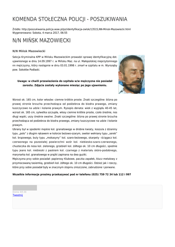 KOMENDA STOŁECZNA POLICJI - POSZUKIWANIA Źródło: http://poszukiwania.policja.waw.pl/pz/identyfikacja-zwlok/13515,NN-Minsk-Mazowiecki.html Wygenerowano: Sobota, 4 marca 2017, 06:55 N/N MIŃSK MAZOWIECKI N/N Mińsk Mazowiecki Sekcja Kryminalna KPP w Mińsku Mazowieckim prowadzi sprawę identyfikacyjną dot. ujawnionego w dniu 14.09.1997 r. w Mińsku Maz. na ul. Małopolskiej nieprzytomnego nn mężczyzny, który następnie w dniu 03.01.1998 r. zmarł w szpitalu w m. Wyrozęby pow. Sokołów Podlaski. Uwaga: w chwili przewiezienia do szpitala w/w mężczyzna nie posiadał zarostu. Zdjęcia zostały wykonane miesiąc po jego ujawnieniu. Wzrost ok. 165 cm, kolor włosów: ciemne krótkie proste. Znaki szczególne: blizna po prawej stronie brzucha przechodząca od podżebrza do biodra prawego, zmiany łuszczycowe na udzie i kolanie prawym. Rysopis denata: wiek z wyglądu 40-45 lat, wzrost ok. 165 cm, sylwetka szczupła, włosy ciemne krótkie proste, czoło średnie, nos długi wąski, uszy średnie owalne. Znaki szczególne: blizna po prawej stronie brzucha przechodząca od podżebrza do biodra prawego, zmiany łuszczycowe na udzie i kolanie prawym. Ubrany był w spodenki męskie kol. granatowego w drobne kwiaty, koszula z dzianiny typu „polo” z długim rękawem w kolorze beżowo-szarym, sweter wełniany typu „serek” kol. brązowego, buty typu „mokasyny” kol. szaro-beżowego, skarpety –ściągacz kol. czerwonego na pozostałej powierzchni wzór kol. niebiesko-szaro-czerwonego, chusteczka do nosa kol. zielonego, grzebień kol. żółtego ok. 10 cm długości, spodnie typu jeans kol. niebieski z paskiem kol. czarnego z materiału skóro-podobnego, marynarka kol. granatowego w prążki zapinana na dwa guziki. Mężczyzna przy sobie posiadał: papierosy Klubowe, paczka zapałek, klucz metalowy z przymocowaną tasiemką, grzebień kol. żółtego ok. 10 cm długości. Odzież jak i rzeczy, które przy sobie posiadał były w znacznym stopniu zniszczone, zabrudzone i porwane. Wszelkie informacje prosimy przekazywać pod nr telefonu (025) 759 72 34 lub 112 i 997 Ocena: 0/5 (0) Tweetnij