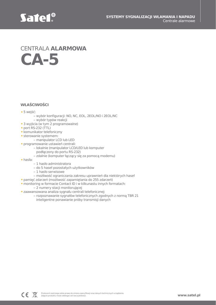 SYSTEMY SYGNALIZACJI WŁAMANIA I NAPADU Centrale alarmowe CENTRALA ALARMOWA CA-5 WŁAŚCIWOŚCI ••5 wejść: –– wybór konfiguracji: NO, NC, EOL, 2EOL/NO i 2EOL/NC –– wybór typów reakcji ••3 wyjścia (w tym 2 programowalne) ••port RS-232 (TTL) ••komunikator telefoniczny ••sterowanie systemem: –– manipulator LCD lub LED ••programowanie ustawień centrali: –– lokalnie (manipulator LCD/LED lub komputer podłączony do portu RS-232) –– zdalnie (komputer łączący się za pomocą modemu) ••hasła: –– 1 hasło administratora –– do 5 haseł pozostałych użytkowników –– 1 hasło serwisowe –– możliwość ograniczania zakresu uprawnień dla niektórych haseł ••pamięć zdarzeń (możliwość zapamiętania do 255 zdarzeń) ••monitoring w formacie Contact ID i w kilkunastu innych formatach: –– 2 numery stacji monitorującej ••zaawansowana analiza sygnału centrali telefonicznej: –– rozpoznawanie sygnałów telefonicznych zgodnych z normą TBR 21 inteligentne ponawianie próby transmisji danych Producent zastrzega sobie prawo do zmiany specyfikacji oraz danych technicznych urządzenia. Zdjęcie produktu może odbiegać od rzeczywistości. www.satel.pl SYSTEMY SYGNALIZACJI WŁAMANIA I NAPADU Centrale alarmowe CENTRALA ALARMOWA CA-5 DANE TECHNICZNE CECHY SYSTEMU Klasa zabezpieczenia Klasa C Maksymalna liczba wejść w systemie 5 Maksymalna liczba wyjść 3 Strefy 1 Użytkownicy: użytkownicy + administratorzy + instalator Pamięć zdarzeń 5+1+1 255 OBSŁUGA SYSTEMU Manipulatory LCD tak Manipulatory LED tak Współpraca ze sterownikami radiowymi z serii RX/RE tak PŁYTY GŁÓWNE Znamionowe napięcie zasilania (±15%) Typ zasilacza 18 V AC, 50-60 Hz A Nominalne napięcie zasilacza centrali (±10%) Wydajność zasilacza Obciążalność wyjść wysokoprądowych (±10%) Obciążalność wyjść programowalnych niskoprądowych Maksymalna pojemność akumulatora Klasa środowiskowa Zakres temperatur pracy Wejścia 12 V DC 1,2 A 1,1 A 50 mA 7 Ah II -10°C…+55°C 5 Port RS-232 tak Komunikator telefoniczny tak Modem wewnętrzny Wymiary płytki elektroniki (mm) tak 147 x 70 KOMUNIKACJA Monitoring tak Obsługa przy pomocy programu DLOAD10 tak Producent zastrzega sobie prawo do zmiany specyfikacji oraz danych technicznych urządzenia. Zdjęcie produktu może odbiegać od rzeczywistości. www.satel.pl
