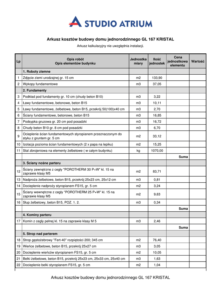 Arkusz kosztów budowy domu jednorodzinnego GL 167 KRISTAL Arkusz kalkulacyjny nie uwzględnia instalacji. Opis robót Opis elementów budynku Lp Cena Jednostka Ilość jednostkowa miary jednostek elementu 1. Roboty ziemne 1 Zdjęcie ziemi urodzajnej gr. 15 cm m2 133,90 2 Wykopy fundamentowe m3 37,05 2. Fundamenty 3 Podkład pod fundamenty gr. 10 cm (chudy beton B10) m3 3,22 4 Ławy fundamentowe, betonowe, beton B15 m3 10,11 5 Ławy fundamentowe, żelbetowe, beton B15, przekrój 50(100)x40 cm m3 2,70 6 Ściany fundamentowe, betonowe, beton B15 m3 16,85 7 Podsypka gruzowa gr. 20 cm pod posadzki m3 16,72 8 Chudy beton B10 gr. 8 cm pod posadzki m3 6,70 9 Ocieplenie ścian fundamentowych styropianem przeznaczonym do styku z gruntem gr. 5 cm m2 33,12 10 Izolacja pozioma ścian fundamentowych (2 x papa na lepiku) m2 15,25 11 Stal zbrojeniowa na elementy żelbetowe ( w całym budynku) kg 1070,00 Suma 3. Ściany nośne parteru 12 Ściany zewnętrzne z cegły "POROTHERM 30 P+W" kl. 15 na zaprawie klasy M5 m2 83,71 13 Nadproża żelbetowe, beton B15, przekrój 25x23 cm, 25x12 cm m3 0,81 14 Docieplenie nadproży styropianem FS15, gr. 5 cm m2 3,24 m2 9,63 m3 0,34 15 Ściany wewnętrzne z cegły "POROTHERM 25 P+W" kl. 15 na zaprawie klasy M5 16 Słup żelbetowy, beton B15, POZ. 1. 2. Suma 4. Kominy parteru 17 Komin z cegły pełnej kl. 15 na zaprawie klasy M 5 m3 2,46 Suma 5. Strop nad parterem 18 Strop gęstożebrowy "Fert-40" rozpiętości 200; 345 cm m2 76,40 19 Wieńce żelbetowe, beton B15, przekrój 25x27 cm m3 3,05 20 Docieplenie wieńców styropianem FS15, gr. 5 cm m2 10,05 21 Belki żelbetowe, beton B15, przekrój 25x23 cm, 25x33 cm, 25x40 cm m3 1,63 22 Docieplenie belki styropianem FS15, gr. 5 cm m2 1,04 Arkusz kosztów budowy domu jednorodzinnego GL 167 KRISTAL Wartość 23 Docieplenie belki styropianem FS15, gr. 10 cm m2 1,68 24 Schody płytowe, żelbetowe, beton B15, gr. 12 cm m2 5,50 25 Płyta żelbetowa, beton B15, gr. 12-10 cm m2 4,22 Suma 6. Ściany nośne poddasza 26 Ściany zewnętrzne z cegły "POROTHERM 30 P+W" kl. 15 na zaprawie klasy M5 m2 23,30 27 Nadproża żelbetowe, beton B15, przekrój 25x23 cm m3 0,33 28 Docieplenie nadproży styropianem FS15, gr. 5 cm m2 1,30 29 Wieńce opaskowe żelbetowe, beton B15, przekrój 25x15 cm m3 1,34 30 Docieplenie wieńców styropianem FS15, gr. 5 cm m2 5,55 31 Słupki kotwiące żelbetowe, beton B15, przekrój 25x25 cm m3 0,50 32 Docieplenie słupków kotwiących styropianem FS15, gr. 5 cm m2 2,00 Suma 7. Kominy poddasza 33 Komin z cegły pełnej kl. 15 na zaprawie klasy M5 m3 2,56 34 Komin z cegły klinkierowej kl. 15 na zaprawie klasy M5 ( nad dachem) m3 1,12 35 Nakrywy betonowe kominów, beton B15 m3 0,20 Suma 8. Więźba 36 Drewno konstrukcyjne więźby kl. C-30 m3 10,18 37 Konstrukcja dachu ( w rozwinięciu) m2 194,40 Suma 9. Dach 38 Krycie dachówką m2 194,40 39 Folia wiatroizolacyjna m2 194,40 40 Rynny f 100 mb 45,90 41 Rynny f 70 mb 8,20 42 Rury spustowe f 70 mb 15,00 43 Wyłaz dachowy o wymiarach min. 80 x 80 cm szt 1 44 Okna połaciowe o wymiarach ościeżnicy 78x140 cm szt 7 45 Podbitka drewniana, heblowana gr. 2 cm m2 45,30 46 Podłoga na kleszczach z desek gr. 3, 2 cm m2 8,00 Suma 10. Ścianki lukarny 47 Płyta gipsowo-włóknowa FERMACELL na ruszcie stalowym gr. 1, 0 cm 48 Wełan mineralna gr. 12 cm 49 Płyta gipsowo-włóknowa FERMACELL na ruszcie stalowym gr. 2, 0 cm 50 Styropian FS 15 gr. 2 cm m2 5,60 m2 5,20 m2 7,20 m2 7,20 Arkusz kosztów budowy domu jednorodzinnego GL 167 KRISTAL Suma 11. Ściany działowe parteru 51 Ściana gr. 12 cm z cegły ceram. pełnej kl. 10 na zaprawie klasy M2 m2 23,40 52 Nadproża prefabrykowane L-19 o dł. 120 cm szt 4 Suma 12. Podłoga na parterze 53 Izolacja pozioma przeciwwilgociowa (2 x papa na lepiku) m2 83,55 54 Wełna mineralna PAROC VL , gr. 10 cm m2 84,30 55 Wylewka betonowa, beton B15, gr. 6, 5 cm, zatarta na gładko m3 5,48 Suma 13. Ściany działowe poddasza 56 Ściana gr. 12 cm z cegły POROTHERM 11, 5 klasy 10 na zaprawie klasy M2 57 Nadproża prefabrykowane L-19 o dł. 240 cm m2 51,90 szt 2 Suma 14. Podłoga na poddaszu 58 Styropian FS 20 gr. 3 cm m2 79,80 59 Wylewka betonowa, beton B10, gr. 3, 5 cm, zatarta na gładko m3 2,80 Suma 15. Roboty wykończeniowe Tynki 60 Tynk cementowo-wapienny na ścianach od wewnątrz m2 326,60 61 Tynk cementowo-wapienny na sufitach m2 84,00 Docieplenie ścian zewnętrznych 62 Ocieplenie ścian zewnętrznych wełną mineralną "PAROC RAL 4", gr. 10 cm m2 140,25 63 Ocieplenie cokołu zewnętrznego styropianem przeznaczonym do styku z gruntem gr. 5 cm m2 12,42 64 Wełna mineralna "PAROC IL" gr. 12 cm m2 114,40 65 Wełna mineralna "PAROC IL" gr. 5 cm m2 91,60 m2 91,60 67 Posadzka z płytek ceramicznych m2 35,50 68 Posadzka z paneli podłogowych m2 128,50 69 Trepy dębowe na schodach m2 5,50 70 Docieplenie płyty styropianem FS15, gr. 2 cm m2 3,76 71 Izolacja pozioma przeciwwilgociowa (2 x papa na lepiku) m2 4,10 72 Styropian FS 15, gr. 3 cm m2 4,10 73 Wylewka betonowa, beton B10, gr. 4 cm, zatarta na gładko m3 0,16 Sufit podwieszany + skosy poddasza 66 Płyta gipsowo-włóknowa FERMACELL na ruszcie stalowym gr. 1, 0 cm Posadzki Balkon Arkusz kosztów budowy domu jednorodzinnego GL 167 KRISTAL 74 Posadzka z płytek gresowych m2 4,10 75 Balustrada na schodach wysokości 90 cm mb 9,00 76 Balustrada na balkonie wysokości 100 cm mb 5,75 Balustrady Suma 16. Okna i drzwi 77 Okna o wymiarach ościeżnicy 58x55, 5 cm szt 1 78 Okiennica drewniana pojedyncza lewostronna szt 1 79 Okna o wymiarach ościeżnicy 88x115, 5 cm szt 2 80 Okna o wymiarach ościeżnicy 148x145, 5 cm szt 4 81 Okiennica drewniana pojedyncza obustronna szt 4 82 Drzwi wewnętrzne pokojowe o wymiarach ościeżnicy 88x205 cm szt 5 83 Drzwi wewnętrzne pokojowe o wymiarach ościeżnicy 98x205 cm szt 1 84 Drzwi wewnętrzne łazienkowe o wymiarach ościeżnicy 88x205 cm szt 2 85 Drzwi zewnętrzne o wymiarach ościeżnicy 96, 5x222 cm szt 1 86 Drzwi balkonowe o wymiarach ościeżnicy 156, 5x236 c