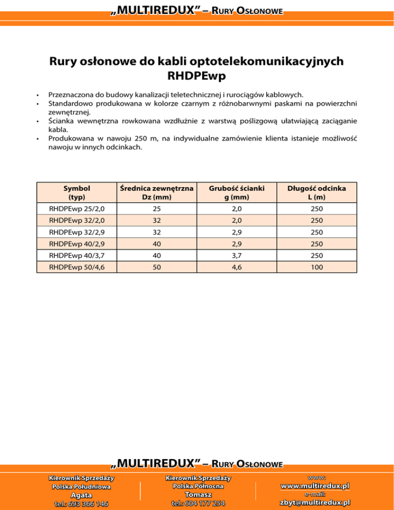 „MULTIREDUX” – Rury Osłonowe Rury osłonowe do kabli optotelekomunikacyjnych RHDPEwp • • • • Przeznaczona do budowy kanalizacji teletechnicznej i rurociągów kablowych. Standardowo produkowana w kolorze czarnym z różnobarwnymi paskami na powierzchni zewnętrznej. Ścianka wewnętrzna rowkowana wzdłużnie z warstwą poślizgową ułatwiającą zaciąganie kabla. Produkowana w nawoju 250 m, na indywidualne zamówienie klienta istanieje możliwość nawoju w innych odcinkach. Symbol (typ) Średnica zewnętrzna Dz (mm) Grubość ścianki g (mm) Długość odcinka L (m) RHDPEwp 25/2,0 25 2,0 250 RHDPEwp 32/2,0 32 2,0 250 RHDPEwp 32/2,9 32 2,9 250 RHDPEwp 40/2,9 40 2,9 250 RHDPEwp 40/3,7 40 3,7 250 RHDPEwp 50/4,6 50 4,6 100 „MULTIREDUX” – Rury Osłonowe Kierownik Sprzedaży Polska Południowa Agata tel.: 693 366 146 Kierownik Sprzedaży Polska Północna Tomasz tel.: 604 177 254 www: www.multiredux.pl e-mail: [email protected] „MULTIREDUX” – Rury Osłonowe Rury osłonowe gładkie przepustowe RHDPEp • • • • • Przeznaczone do przewiertów sterowanych (średnice od 75125) pod szlakami komunikacyjnymi i wodnymi. Do budowy rurociągów ochronnych w warunkach specjalnych: przy zbliżeniach i skrzyżowaniach linii telekomunikacyjnych, lub energetycznych z innymi urządzeniami uzbrojenia terenu. Wykonane z polietylenu o dużej gęstości (HDPE) w kolorze czarnym. Przeznaczone do zgrzewania. Produkowane w odcinkach 100 m (krążek) 6 lub 12 m (zgodnie z tabelką). Symbol (typ) Średnica zewnętrzna Dz (mm) Grubość ścianki g (mm) Długość odcinka L (m) RHDPEp 50/3,7 50 3,7 100 RHDPEp 63/3,6 63 3,6 100 RHDPEp 63/4,7 63 4,7 100 RHDPEp 75/4,3 75 4,3 50 lub 6 RHDPEp 75/5,6 75 5,6 50 lub 6 RHDPEp 75/6,9 75 6,9 50 lub 6 RHDPEp 110/4,2 110 4,2 6 lub 12 RHDPEp 110/5,0 110 5 6 lub 12 RHDPEp 110/6,3 110 6,3 6 lub 12 RHDPEp 110/10 110 10 6 lub 12 RHDPEp 125/7,1 125 7,1 6 lub 12 RHDPEp 125/11,4 125 11,4 6 lub 12 „MULTIREDUX” – Rury Osłonowe Kierownik Sprzedaży Polska Południowa Agata tel.: 693 366 146 Kierownik Sprzedaży Polska Północna Tomasz tel.: 604 177 254 www: www.multiredux.pl e-mail: [email protected] „MULTIREDUX” – Rury Osłonowe Rury osłonowe polipropylenowe RPP • • Przeznaczone do zabezpieczania przewodów i kabli telekomunikacyjnych, kabli telewizji kablowej, elektroenergetycznych i sygnalizacyjnych, w miejscach ochrony kabli przed uszkodzeniami mechanicznymi spowodowanymi występowaniem nacisków od poruszających się pojazdów mechanicznych. Wykonane z polipropylenu PP, który charakteryzuje się wysoką sztywnością obwodową przy zachowaniu wysokiej odporności na udarność. Symbol (typ) Średnica zewnętrzna Dz (mm) Grubość ścianki g (mm) Długość odcinka L (m) RPP 110/3,7 110 3,7 6 lub 12 RPP 110/5,0 110 5 6 lub 12 „MULTIREDUX” – Rury Osłonowe Kierownik Sprzedaży Polska Południowa Agata tel.: 693 366 146 Kierownik Sprzedaży Polska Północna Tomasz tel.: 604 177 254 www: www.multiredux.pl e-mail: [email protected] „MULTIREDUX” – Rury Osłonowe Rury osłonowe gładkie odporne na promieniowanie UV RHDPEUV • • • Przeznaczone do ochrony kabli instalowanych na przestrzeniach otwartych. Wykonywane z polietylenu dużej gęstości z dodatkiem materiałów zapewniających długoletnią odporność na działanie promieni UV. Produkowane w odcinkach 3 m w kolorze czarnym. Symbol (typ) Średnica zewnętrzna Dz (mm) Grubość ścianki g (mm) Długość odcinka L (m) RHDPEuv 50/5 50 5 3 RHDPEuv 75/6,9 75 6,9 3 RHDPEuv 110/10 110 10 3 „MULTIREDUX” – Rury Osłonowe Kierownik Sprzedaży Polska Południowa Agata tel.: 693 366 146 Kierownik Sprzedaży Polska Północna Tomasz tel.: 604 177 254 www: www.multiredux.pl e-mail: [email protected]
