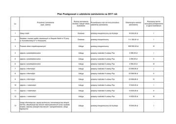 Plan Postępowań o udzielenie zamówienia na 2017 rok Przedmiot zamówienia (opis, zakres) Lp. Rodzaj zamówienia Przewidywany tryb lub inna procedura dostawy /usługi/ roboty udzielenia zamówienia budowlane Orientacyjna wartość zamówienia Planowany termin wszczęcia postępowania w ujęciu kwartalnym 1 Zakup mebli Dostawa przetarg nieograniczony lub licytacja 16 500,00 zł I 2 Dostawa i montaż szafek ubraniowych w Zespole Szkół nr 72 przy ul. Konwiktorskiej 5/7 w Warszawie. Dostawa przetarg nieograniczony 111 300,81 zł I 3 Przewóz dzieci niepełnosprawnych Usługa przetarg nieograniczony 859 950,00 zł III 4 zajęcia z przedsiębiorczości Usługa przepisy rozdziału 6 ustawy Pzp 4 590,00 zł I 5 zajęcia z przedsiębiorczości Usługa przepisy rozdziału 6 ustawy Pzp 4 590,00 zł II 6 zajęcia z przedsiębiorczości Usługa przepisy rozdziału 6 ustawy Pzp 4 590,00 zł III 7 zajęcia z informatyki Usługa przepisy rozdziału 6 ustawy Pzp 23 066,66 zł I 8 zajęcia z informatyki Usługa przepisy rozdziału 6 ustawy Pzp 23 066,66 zł II 9 zajęcia z informatyki Usługa przepisy rozdziału 6 ustawy Pzp 23 066,66 zł III 10 zajęcia z matematyki Usługa przepisy rozdziału 6 ustawy Pzp 14 920,00 zł I 11 zajęcia z matematyki Usługa przepisy rozdziału 6 ustawy Pzp 14 920,00 zł II 12 zajęcia z matematyki Usługa przepisy rozdziału 6 ustawy Pzp 14 920,00 zł III 13 Usługi informatyczne: asysty techniczne, konserwacja baz danych, hot-line, aktualizacja baz danych wykorzystywanych przez wydziały Urzędu, naprawy awaryjne baz danych i oprogramowania, usługi logistyczne Usługa przetarg nieograniczony lub licytacja 15 000,00 zł I Plan Postępowań o udzielenie zamówienia na 2017 rok Lp. Przedmiot zamówienia (opis, zakres) Rodzaj zamówienia Przewidywany tryb lub inna procedura dostawy /usługi/ roboty udzielenia zamówienia budowlane Orientacyjna wartość zamówienia Planowany termin wszczęcia postępowania w ujęciu kwartalnym 14 Usługi informatyczne: asysty techniczne, konserwacja baz danych, hot-line, aktualizacja baz danych wykorzystywanych przez wydziały Urzędu, naprawy awaryjne baz danych i oprogramowania, usługi logistyczne Usługa przetarg nieograniczony lub licytacja 38 000,00 zł II 15 Usługi informatyczne: asysty techniczne, konserwacja baz danych, hot-line, aktualizacja baz danych wykorzystywanych przez wydziały Urzędu, naprawy awaryjne baz danych i oprogramowania, usługi logistyczne Usługa przetarg nieograniczony lub licytacja 23 000,00 zł III 16 Usługi informatyczne: asysty techniczne, konserwacja baz danych, hot-line, aktualizacja baz danych wykorzystywanych przez wydziały Urzędu, naprawy awaryjne baz danych i oprogramowania, usługi logistyczne Usługa przetarg nieograniczony lub licytacja 452 000,00 zł IV 17 Świadczenie usług całodobowej ochrony osób i mienia w obiektach administracyjnych Urzędu Dzielnicy Śródmieście m.st. Warszawy Usługa przepisy rozdziału 6 ustawy Pzp 900 000,00 zł III 18 Świadczenie usług pocztowych, usługi frankowania oraz usługi codziennego odbioru przesyłek dla Urzędu Dzielnicy Śródmieście m.st. Warszawy Usługa przepisy rozdziału 6 ustawy Pzp 1 000 000,00 zł IV 19 Dystrybucję energii elektrycznej dla siedzib Urzędu m. st. Warszawy – Dzielnica Śródmieście Usługa zamówienie z wolnej ręki 400 000,00 zł III 20 zakup energii dla siedzib Urzędu m. st. Warszawy – Dzielnica Śródmieście Dostawa przetarg nieograniczony lub licytacja 231 700,00 zł IV 21 Dokumentacja projektowa na remont dachu i elewacji w Przedszkolu 4, ul. Elektoralna 15/17 w Warszawie Usługa przetarg nieograniczony lub licytacja 16 260,16 zł I Plan Postępowań o udzielenie zamówienia na 2017 rok Rodzaj zamówienia Przewidywany tryb lub inna procedura dostawy /usługi/ roboty udzielenia zamówienia budowlane Orientacyjna wartość zamówienia Planowany termin wszczęcia postępowania w ujęciu kwartalnym przetarg nieograniczony lub licytacja 20 325,20 zł I Usługa przetarg nieograniczony lub licytacja 28 455,28 zł II Dokumentacja projektowa na usunięcie zalanych pomieszczeń przedszkola (kanalizacja deszczowa) w Przedszkolu nr 10, ul. Nowolipki 10a w Warszawie Usługa przetarg nieograniczony lub licytacja 12 195,12 zł I 25 Dokumentacja projektowa na remont instalacji elektrycznej w Przedszkolu nr 12, ul. Niska 9 w Warszawie Usługa przetarg nieograniczony lub licytacja 12 195,12 zł II 26 Dokumentacja projektowa oświetlenia zewnętrznego ogródka i monitoringu w Przedszkolu nr 206, ul. Franciszkańska 7 Usługa przetarg nieograniczony lub licytacja 6 504,07 zł II 27 Dokumentacja projektowa na remont instalacji elektrycznej w Przedszkolu nr 20, ul. Sempołowskiej 2a Usługa przetarg nieograniczony lub licytacja 16 260,16 zł III 28 Dokumentacja projektowa remontu instalacji c.o. i węzła cieplnego w Szkole Podstawowej nr 32, ul. Lewartowskiego 2 Usługa przetarg nieograniczony lub licytacja 19 349,59 zł I 29 Dokumentacja projektowa remontu lokalu na pomieszczenie magazynowania dokumentacji w Szkole Podstawowej nr 29, ul. Fabryczna 19 w Warszawie Usługa przetarg nieograniczony lub licytacja 12 195,12 zł I 30 Dokumentacja projektowa remontu węzła cieplnego w Szkole Podstawowej nr 29, ul. Fabryczna 19 w Warszawie Usługa przetarg nieograniczony lub licytacja 16 260,16 zł I 31 Dokumentacja projektowa remontu ogrodzenia w Szkole Podstawowej nr 75, ul. Niecała 14 Usługa przetarg nieograniczony lub licytacja 12 195,12 zł I 32 Dokumentacja projektowa czyszczenia i napraw elewacji, wyburzenia ścian działowych oraz robót towarzyszących w Szkole Podstawowej nr 203, ul. Skorupki 8 w Warszawie Usługa przetarg nieograniczony lub licytacja 20 325,20 zł I Lp. Przedmiot zamówienia (opis, zakres) 22 Dokumentacja projektowa na remont placu zabaw w Przedszkolu nr 2, ul. Orla 11 w Warszawie Usługa 23 Dokumentacja projektowa na remont kuchni w Przedszkolu nr 9 ul. Dzielna 5a w Warszawie 24 Plan Postępowań o udzielen