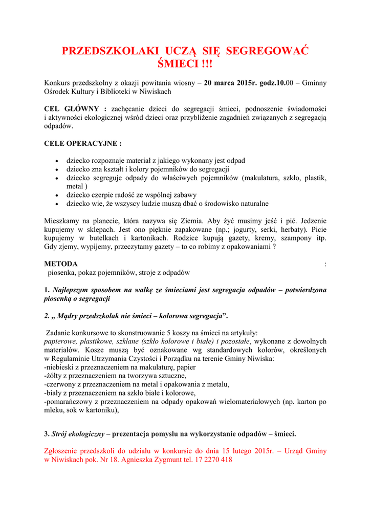 PRZEDSZKOLAKI UCZĄ SIĘ SEGREGOWAĆ ŚMIECI !!! Konkurs przedszkolny z okazji powitania wiosny – 20 marca 2015r. godz.10.00 – Gminny Ośrodek Kultury i Biblioteki w Niwiskach CEL GŁÓWNY : zachęcanie dzieci do segregacji śmieci, podnoszenie świadomości i aktywności ekologicznej wśród dzieci oraz przybliżenie zagadnień związanych z segregacją odpadów. CELE OPERACYJNE : dziecko rozpoznaje materiał z jakiego wykonany jest odpad dziecko zna kształt i kolory pojemników do segregacji dziecko segreguje odpady do właściwych pojemników (makulatura, szkło, plastik, metal ) dziecko czerpie radość ze wspólnej zabawy dziecko wie, że wszyscy ludzie muszą dbać o środowisko naturalne Mieszkamy na planecie, która nazywa się Ziemia. Aby żyć musimy jeść i pić. Jedzenie kupujemy w sklepach. Jest ono pięknie zapakowane (np.; jogurty, serki, herbaty). Picie kupujemy w butelkach i kartonikach. Rodzice kupują gazety, kremy, szampony itp. Gdy zjemy, wypijemy, przeczytamy gazety – to co robimy z opakowaniami ? METODA piosenka, pokaz pojemników, stroje z odpadów : 1. Najlepszym sposobem na walkę ze śmieciami jest segregacja odpadów – potwierdzona piosenką o segregacji 2. ,, Mądry przedszkolak nie śmieci – kolorowa segregacja”. Zadanie konkursowe to skonstruowanie 5 koszy na śmieci na artykuły: papierowe, plastikowe, szklane (szkło kolorowe i białe) i pozostałe, wykonane z dowolnych materiałów. Kosze muszą być oznakowane wg standardowych kolorów, określonych w Regulaminie Utrzymania Czystości i Porządku na terenie Gminy Niwiska: -niebieski z przeznaczeniem na makulaturę, papier -żółty z przeznaczeniem na tworzywa sztuczne, -czerwony z przeznaczeniem na metal i opakowania z metalu, -biały z przeznaczeniem na szkło białe i kolorowe, -pomarańczowy z przeznaczeniem na odpady opakowań wielomateriałowych (np. karton po mleku, sok w kartoniku), 3. Strój ekologiczny – prezentacja pomysłu na wykorzystanie odpadów – śmieci. Zgłoszenie przedszkoli do udziału w konkursie do dnia 15 lutego 2015r. – Urząd Gminy w Niwiskach pok. Nr 18. Agnieszka Zygmunt tel. 17 2270 418