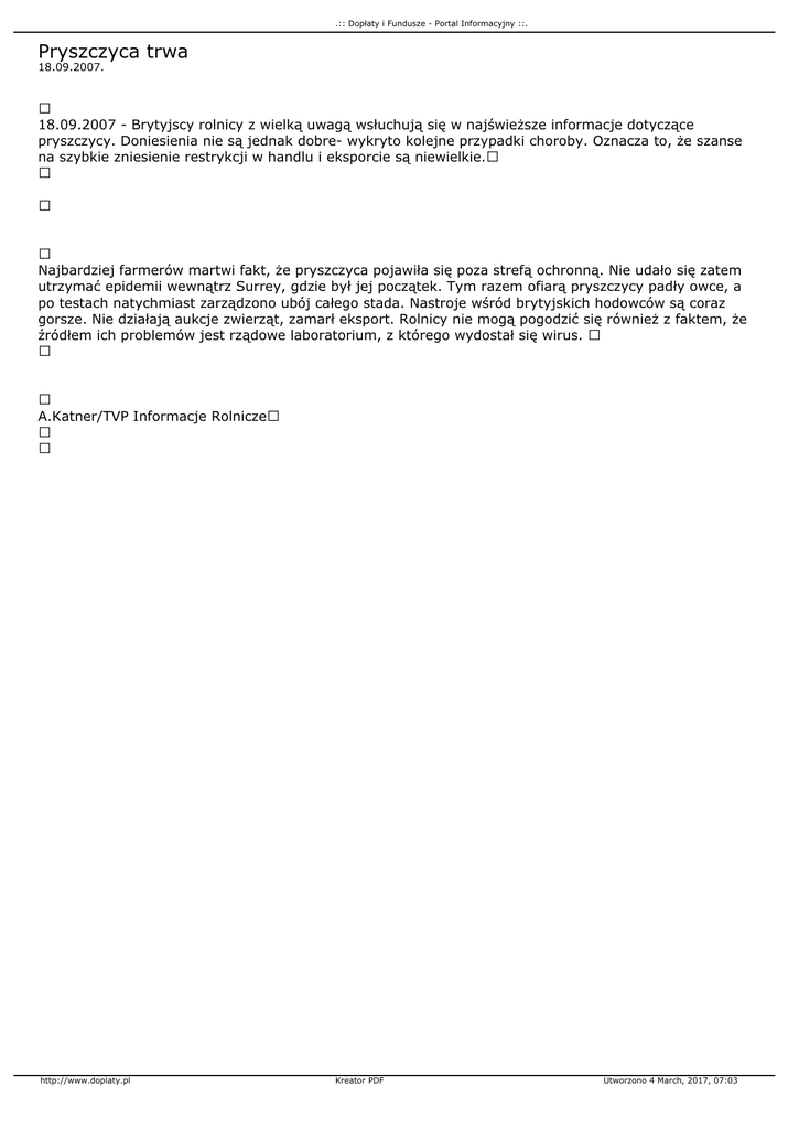 .:: Dopłaty i Fundusze - Portal Informacyjny ::. Pryszczyca trwa 18.09.2007. 18.09.2007 - Brytyjscy rolnicy z wielką uwagą wsłuchują się w najświeższe informacje dotyczące pryszczycy. Doniesienia nie są jednak dobre- wykryto kolejne przypadki choroby. Oznacza to, że szanse na szybkie zniesienie restrykcji w handlu i eksporcie są niewielkie. Najbardziej farmerów martwi fakt, że pryszczyca pojawiła się poza strefą ochronną. Nie udało się zatem utrzymać epidemii wewnątrz Surrey, gdzie był jej początek. Tym razem ofiarą pryszczycy padły owce, a po testach natychmiast zarządzono ubój całego stada. Nastroje wśród brytyjskich hodowców są coraz gorsze. Nie działają aukcje zwierząt, zamarł eksport. Rolnicy nie mogą pogodzić się również z faktem, że źródłem ich problemów jest rządowe laboratorium, z którego wydostał się wirus. A.Katner/TVP Informacje Rolnicze http://www.doplaty.pl Kreator PDF Utworzono 4 March, 2017, 07:03