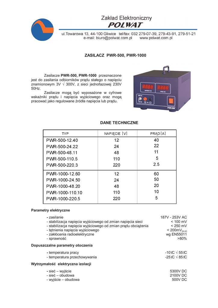 ZASILACZ PWR-500, PWR-1000 DANE TECHNICZNE