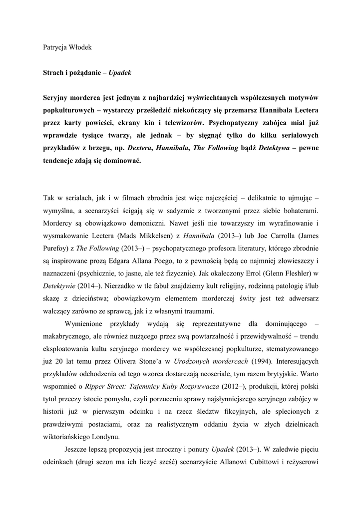 Patrycja Włodek Strach i pożądanie – Upadek Seryjny morderca jest jednym z najbardziej wyświechtanych współczesnych motywów popkulturowych – wystarczy prześledzić niekończący się przemarsz Hannibala Lectera przez karty powieści, ekrany kin i telewizorów. Psychopatyczny zabójca miał już wprawdzie tysiące twarzy, ale jednak – by sięgnąć tylko do kilku serialowych przykładów z brzegu, np. Dextera, Hannibala, The Following bądź Detektywa – pewne tendencje zdają się dominować. Tak w serialach, jak i w filmach zbrodnia jest więc najczęściej – delikatnie to ujmując – wymyślna, a scenarzyści ścigają się w sadyzmie z tworzonymi przez siebie bohaterami. Mordercy są obowiązkowo demoniczni. Nawet jeśli nie towarzyszy im wyrafinowanie i wysmakowanie Lectera (Mads Mikkelsen) z Hannibala (2013–) lub Joe Carrolla (James Purefoy) z The Following (2013–) – psychopatycznego profesora literatury, którego zbrodnie są inspirowane prozą Edgara Allana Poego, to z pewnością będą co najmniej złowieszczy i naznaczeni (psychicznie, to jasne, ale też fizycznie). Jak okaleczony Errol (Glenn Fleshler) w Detektywie (2014–). Nierzadko w tle fabuł znajdziemy kult religijny, rodzinną patologię i/lub skazę z dzieciństwa; obowiązkowym elementem morderczej świty jest też adwersarz walczący zarówno ze sprawcą, jak i z własnymi traumami. Wymienione przykłady wydają się reprezentatywne dla dominującego – makabrycznego, ale również nużącego przez swą powtarzalność i przewidywalność – trendu eksploatowania kultu seryjnego mordercy we współczesnej popkulturze, stematyzowanego już 20 lat temu przez Olivera Stone’a w Urodzonych mordercach (1994). Interesujących przykładów odchodzenia od tego wzorca dostarczają neoseriale, tym razem brytyjskie. Warto wspomnieć o Ripper Street: Tajemnicy Kuby Rozpruwacza (2012–), produkcji, której polski tytuł przeczy istocie pomysłu, czyli porzuceniu sprawy najsłynniejszego seryjnego zabójcy w historii już w pierwszym odcinku i na rzecz śledztw fikcyjnych, ale splecionych z prawdziwymi postaciami, oraz na realistycznym oddaniu życia w złych dzielnicach wiktoriańskiego Londynu. Jeszcze lepszą propozycją jest mroczny i ponury Upadek (2013–). W zaledwie pięciu odcinkach (drugi sezon ma ich liczyć sześć) scenarzyście Allanowi Cubittowi i reżyserowi Jakobowi Verbruggenowi udało się nie tylko odświeżyć wizerunek seryjnego mordercy, jednocześnie go urealniając. Nieco przedefiniowali oni również samą formułę, nader często oskarżaną o mizoginię ze względu na powszechnie wybieraną płeć ofiar, wysokie stężenie makabry towarzyszące zabijaniu oraz późniejszą ekspozycję czyniącą z okaleczonych zwłok sadystyczny, a zarazem wizualnie wyrafinowany spektakl. Fabuła Upadku wydaje się prosta. Oto w Belfaście grasuje dusiciel kobiet, których martwe ciała pozostawia w ich własnych sypialniach umyte, wypielęgnowane (maluje im paznokcie, czesze) i upozowane, choć mało wymyślnie. Jego tropem podąża komisarz Stella Gibson, wezwana specjalnie z Londynu, by skontrolować przebieg dochodzenia w sprawie pierwszego morderstwa, które wydawało się jeszcze odosobnionym wypadkiem. Wkrótce oczywiście pojawiają się kolejne ofiary, a Stella przejmuje dowodzenie. Ta historia – pozornie konwencjonalna – jest jednak elektryzująca z kilku powodów. Wśród nich najważniejsze są konstrukcje głównych postaci – mordercy i policjantki – wzmacniane przez doskonałe wybory obsadowe. Główne role kreują Gillian Anderson oraz Jamie Dornan, na razie najbardziej znany z dużo słabszego występu w Dawno, dawno temu (2011–) – wkrótce jego sława osiągnie skalę globalną za sprawą tytułowej roli w 50 twarzach Graya (2015, S. Taylor-Johnson). Grany przez Dornana Paul Spector łączy w sobie dwie, zdawałoby się przeciwstawne, cechy – obie wniesione przez samego aktora i doskonale zintegrowane ze scenariuszem. Jest przystojny, co jednak w kontekście charakteru i poczynań granej przez niego postaci zamiast przyjemności wprowadza niepokój i dyskomfort. Co istotniejsze – mimo niezaprzeczalnej urody – bohater jest bardzo zwyczajny. To biały, trzydziestokilkuletni mężczyzna, żonaty z równie przeciętną, choć mniej od niego urodziwą, kobietą. Oboje pracują w zwyczajnych zawodach (ona jest pielęgniarką, on terapeutą w ośrodku opieki społecznej), mają dwoje dzieci, standardowy dom i takież kontakty towarzyskie oraz rodzinne. Spector w żaden sposób nie wybija się ponad otaczające go tło, oczywiście pomijając fakt, że jest seryjnym mordercą. Nie wyróżnia się na zewnątrz – mroczna strona jego osobowości pozostaje tylko dla ofiar i niego samego, np. gdy w samotności podnosi sprawność fizyczną niezbędną do mordowania, a podczas terapii potajemnie szkicuje pacjentkę w specyficznych sytuacjach. Jego zwyczajność budzi zaufanie i pomaga mu się ukryć – np. gdy podsłuchuje rozmowę swej przyszłej ofiary z jej siostrą, jako kamuflaż wykorzystując spacer z córką. O tym, że niełatwo go złapać, nie decydują ani jego wybitna inteligencja, ani umiejętność przewidywania poczynań policji, ani wyrafinowane gry prowadzone ze śledczymi. Wręcz przeciwnie – gdy po raz pierwszy rozmawia przez telefon ze Stellą Gibson, jest przerażony i zaszokowany tym, jak wiele o nim wiadomo jedynie na podstawie badania miejsca zbrodni i śledztwa. Twórcy wielokrotnie podkreślają, że Spectora przed demaskacją ratuje szczęście bądź przypadek – nie jest demonicznym mistrzem zbrodni doskonałej, nadczłowiekiem pokroju Lectera lub Carrolla. Nie jest nim także dlatego, że – przynajmniej na razie – autorzy ujawniają jedynie niewielkie skrawki jego przeszłości, wystrzegają się łatwego tłumaczenia i podsuwania motywacji, których przecież nigdy nie poznają jego ofiary. Spector jest enigmą, ale jednocześnie