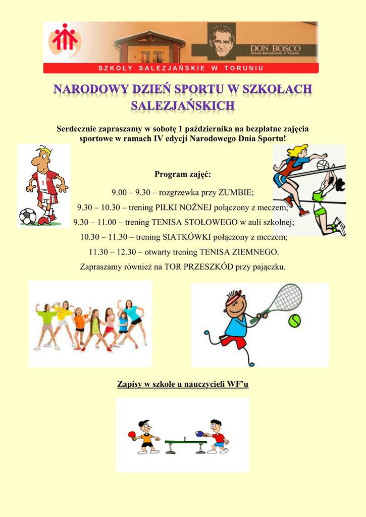 Serdecznie zapraszamy w sobotę 1 października na bezpłatne zajęcia sportowe w ramach IV edycji Narodowego Dnia Sportu! Program zajęć: 9.00 – 9.30 – rozgrzewka przy ZUMBIE; 9.30 – 10.30 – trening PIŁKI NOŻNEJ połączony z meczem; 9.30 – 11.00 – trening TENISA STOŁOWEGO w auli szkolnej; 10.30 – 11.30 – trening SIATKÓWKI połączony z meczem; 11.30 – 12.30 – otwarty trening TENISA ZIEMNEGO. Zapraszamy również na TOR PRZESZKÓD przy pajączku. Zapisy w szkole u nauczycieli WF’u