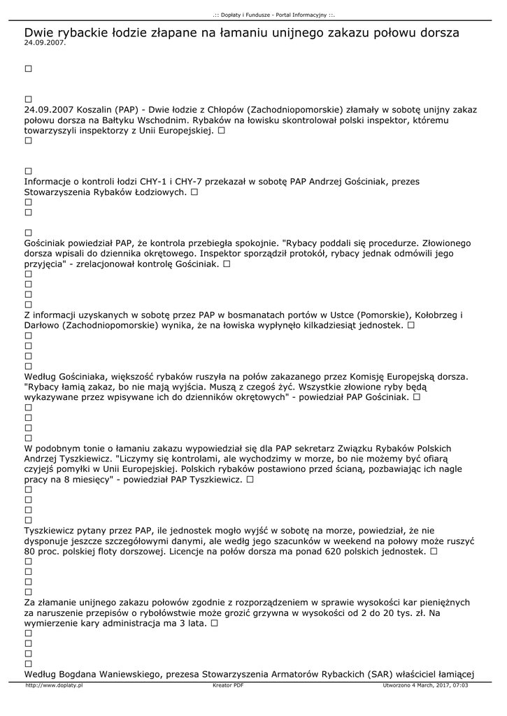 .:: Dopłaty i Fundusze - Portal Informacyjny ::. Dwie rybackie łodzie złapane na łamaniu unijnego zakazu połowu dorsza 24.09.2007. 24.09.2007 Koszalin (PAP) - Dwie łodzie z Chłopów (Zachodniopomorskie) złamały w sobotę unijny zakaz połowu dorsza na Bałtyku Wschodnim. Rybaków na łowisku skontrolował polski inspektor, któremu towarzyszyli inspektorzy z Unii Europejskiej. Informacje o kontroli łodzi CHY-1 i CHY-7 przekazał w sobotę PAP Andrzej Gościniak, prezes Stowarzyszenia Rybaków Łodziowych. Gościniak powiedział PAP, że kontrola przebiegła spokojnie. "Rybacy poddali się procedurze. Złowionego dorsza wpisali do dziennika okrętowego. Inspektor sporządził protokół, rybacy jednak odmówili jego przyjęcia" - zrelacjonował kontrolę Gościniak. Z informacji uzyskanych w sobotę przez PAP w bosmanatach portów w Ustce (Pomorskie), Kołobrzeg i Darłowo (Zachodniopomorskie) wynika, że na łowiska wypłynęło kilkadziesiąt jednostek. Według Gościniaka, większość rybaków ruszyła na połów zakazanego przez Komisję Europejską dorsza. "Rybacy łamią zakaz, bo nie mają wyjścia. Muszą z czegoś żyć. Wszystkie złowione ryby będą wykazywane przez wpisywane ich do dzienników okrętowych" - powiedział PAP Gościniak. W podobnym tonie o łamaniu zakazu wypowiedział się dla PAP sekretarz Związku Rybaków Polskich Andrzej Tyszkiewicz. "Liczymy się kontrolami, ale wychodzimy w morze, bo nie możemy być ofiarą czyjejś pomyłki w Unii Europejskiej. Polskich rybaków postawiono przed ścianą, pozbawiając ich nagle pracy na 8 miesięcy" - powiedział PAP Tyszkiewicz. Tyszkiewicz pytany przez PAP, ile jednostek mogło wyjść w sobotę na morze, powiedział, że nie dysponuje jeszcze szczegółowymi danymi, ale wedłg jego szacunków w weekend na połowy może ruszyć 80 proc. polskiej floty dorszowej. Licencje na połów dorsza ma ponad 620 polskich jednostek. Za złamanie unijnego zakazu połowów zgodnie z rozporządzeniem w sprawie wysokości kar pieniężnych za naruszenie przepisów o rybołówstwie może grozić grzywna w wysokości od 2 do 20 tys. zł. Na wymierzenie kary administracja ma 3 lata. Według Bogdana Waniewskiego, prezesa Stowarzyszenia Armatorów Rybackich (SAR) właściciel łamiącej http://www.doplaty.pl Kreator PDF Utworzono 4 March, 2017, 07:03 .:: Dopłaty i Fundusze - Portal Informacyjny ::. zakaz jednostki może również zostać pozbawiony unijnej pomocy. "Łamiąc zakaz idziemy z Unią Europejską na potężną awanturę. Rozumiem kłopoty kolegów i ich determinację, nie rozumiem natomiast postępowania polskiej administracji. Dotychczas nie ukazało się przecież żadne rządowe rozporządzenie w sprawie zakazu połowów dorsza, które zezwalałoby rybakom na połowy" - powiedział w sobotę PAP Waniewski. Prezes SAR dodał, że w poniedziałek w Ustce zbierze się Sztab Kryzysowy Rybołówstwa, by zająć stanowisko wobec aktualnej sytuacji. Waniewski pytany przez PAP czy jednostki należące do członków SAR wyszły w sobotę w morze, powiedział, że część tak, ale - jak dodał - głównie na śledzia i szprota. "Dorsza łowimy tylko na Bałtyku Zachodnim, który nie jest objętym zakazem Komisji Europejskiej" - wyjaśnił. Grzegorz Hałubek, wiceminister gospodarki morskiej ds. rybołówstwa podtrzymał w sobotę wcześniejsze stanowisko resoru o nie karaniu rybaków łamiących unijny zakaz. "To problem społeczny i dlatego rybacy mają głębokie moralne prawo do prowadzenia połowów. Rząd jest z rybakami, a sprawa utrzymania zakazu w mocy nie jest ostatecznie przesądzona. 17 września przedstawiliśmy unijnemu komisarzowi ds. rybołówstwa Joe Borgowi argumenty, które naszym zdaniem jasno wskazują, że zakaz wprowadzono na podstawie nieprawidłowych danych. Komisarz Borg ma się do tego ustosunkować w czasie zaplanowanego na poniedziałek telemostu z ministrem gospodarki morskiej Markiem Gróbarczykiem" - powiedział PAP Hałubek. Hałubek pytany przez PAP o sobotnią kontrolę rybackich jednostek przez polskich i unijnych inspektorów powiedział, że "dobrze się stało, bo dzięki temu Unia szybciej się dowie, że dorsza jest w Bałtyku dużo, a sobotnie wyjście rybaków w morze można potraktować w kategoriach swego rodzaju badań zasobów tej ryby." Według Bogdana Waniewskiego nielegalne w świetle decyzji KE połowy dorsza mogą mieć jeszcze jeden oprócz nieuchronnych kar dla rybaków - negatywny skutek. "Przetwórcy nie kupią nielegalnego dorsza i jeśli faktycznie jest go dużo, to rybacy mogą się +udławić+ tymi połowami" - powiedział PAP Waniewski. Prezes Polskiego Stowarzyszenia Przetwórców Ryb Jerzy Safader nie widzi jednak przeszkód w kupowaniu od rybaków dorsza. "Jeżeli dostanę fakturę, będę kupował" - powiedział w sobotę PAP Safader. http://www.doplaty.pl Kreator PDF Utworzono 4 March, 2017, 07:03 .:: Dopłaty i Fundusze - Portal Informacyjny ::. Zakaz połów dorsza przez statki pływające pod polską banderą na Bałtyku Wschodnim (na wschód od 15. południka przebiegającego przez miejscowość Trzęsacz w woj. zachodniopomorskim) do końca 2007 r. Komisja Europejska wydała 9 lipca br. Zaczął obowiązywać 16 września, po zakończeniu trzymiesięcznego okresu ochronnego na tę rybę. Podstawą zakazu były wyniki kontroli przeprowadzonej przez inspektorów z UE w I kwartale br. w kilku polskich portach i na części rybackich jednostek. Z kontroli wynikało, że polscy rybacy trzykrotnie przekroczyli przyznany na ten rok limit wynoszący na tym akwenie 10,8 tys. ton. (PAP) sibi/ mhr/ http://www.doplaty.pl Kreator PDF Utworzono 4 March, 2017, 07:03