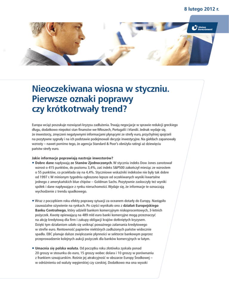 8 lutego 2012 r. Nieoczekiwana wiosna w styczniu. Pierwsze oznaki poprawy czy krótkotrwały trend? Europa wciąż poszukuje rozwiązań kryzysu zadłużenia. Trwają negocjacje w sprawie redukcji greckiego długu, dodatkowo niepokoi stan finansów we Włoszech, Portugalii i Irlandii. Jednak wydaje się, że inwestorzy, zmęczeni negatywnymi informacjami płynącymi ze strefy euro, przychylniej spojrzeli na pozytywne sygnały i na ich podstawie podejmowali decyzje inwestycyjne. Na giełdach zapanowały wzrosty – nawet pomimo tego, że agencja Standard & Poor’s obniżyła ratingi aż dziewięciu państw strefy euro. Jakie informacje poprawiają nastroje inwestorów? • Dobre dane napływają ze Stanów Zjednoczonych. W styczniu indeks Dow Jones zanotował wzrost o 415 punktów, do poziomu 3,4%, zaś indeks S&P500 zakończył miesiąc ze wzrostem o 55 punktów, co przekłada się na 4,4%. Styczniowe wskaźniki indeksów nie były tak dobre od 1997 r. W minionym tygodniu ogłoszono lepsze od oczekiwanych wyniki kwartalne jednego z amerykańskich blue chipów – Goldman Sachs. Pozytywnie zaskoczyły też wyniki spółek i dane napływające z rynku nieruchomości. Wydaje się, że informacje te oznaczają wychodzenie z trendu spadkowego. • Wraz z początkiem roku efekty poprawy sytuacji za oceanem dotarły do Europy. Nastąpiło zauważalne ożywienie na rynkach. Po części wynikało ono z działań Europejskiego Banku Centralnego, który udzielił bankom komercyjnym niskoprocentowych, 3-letnich pożyczek. Kwotę opiewającą na 489 mld euro banki komercyjne mogą przeznaczyć na akcję kredytową dla firm i zakupy obligacji krajów dotkniętych kryzysem. Dzięki tym działaniom udało się uniknąć poważnego załamania kredytowego w strefie euro. Rentowność papierów niektórych zadłużonych państw widocznie spadła. EBC planuje dalsze zwiększanie płynności w sektorze bankowym poprzez przeprowadzenie kolejnych aukcji pożyczek dla banków komercyjnych w lutym. • Umacnia się polska waluta. Od początku roku złotówka zyskała ponad 20 groszy w stosunku do euro, 15 groszy wobec dolara i 10 groszy w porównaniu z frankiem szwajcarskim. Rośnie jej atrakcyjność w obszarze Europy Środkowej – w odróżnieniu od waluty węgierskiej czy czeskiej. Dodatkowo ma ona wysoki 8 lutego 2012 r. potencjał wzrostu i dobrze wróży polskiej gospodarce. Rozwiązanie kwestii spornych w sprawie pomocy dla Grecji ma szansę dodatkowo wzmocnić złotówkę. Pozytywny wpływ mogą też mieć oczekiwane raporty gospodarcze. • Węgry otworzyły się na współpracę. W ubiegłym tygodniu ogłosiły decyzję o wycofaniu z pomysłu przejęcia kontroli nad Bankiem Centralnym. Jednocześnie wyraziły gotowość podjęcia współpracy z Międzynarodowym Funduszem Walutowym i Komisją Europejską w sprawie rozwiązania kryzysu zadłużenia. Zdaniem ekspertów Union Investment TFI Jarosław Lis, zarządzający funduszami Gwałtowne wzrosty na światowych giełdach, z jakimi mieliśmy do czynienia w ostatnim tygodniu, to wynik nieoczekiwanej poprawy sentymentu inwestorów. Istnieją przesłanki świadczące o tym, że zainteresowanie inwestorów zagranicznych akcjami polskich blue chipów wydaje się mieć charakter inny niż krótkoterminowy. Większy niż w drugiej części ubiegłego roku apetyt na ryzyko może być przejściowy, jeśli nasilą się problemy zadłużeniowe. O ile inwestorzy wierzą w pozytywny scenariusz dla strefy euro i w to, że wszelkie zagrożenia zostały już zdyskontowane w cenach akcji, o tyle należy pamiętać, że czynniki ryzyka nadal istnieją. Masz pytania? ☎ @ 800 567 662 (22) 449 03 40 (od poniedziałku do piątku, od 8.00 do 18.00). tfi@union-investment.pl