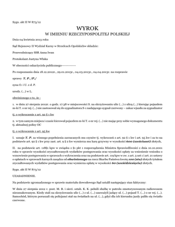 Sygn. akt II W 873/12 WYROK W IMIENIU RZECZYPOSPOLITEJ POLSKIEJ Dnia 04 kwietnia 2013 roku Sąd Rejonowy II Wydział Karny w Strzelcach Opolskichw składzie: Przewodniczący SSR Anna Iwan Protokolant Justyna Wloka W obecności oskarżyciela publicznego------------Po rozpoznaniu dnia 18.12.2012r., 29.01.2013r., 04.03.2013r., 04.04.2013r. na rozprawie sprawy T. P. /P./ syna O. i U. z d. P. urodz. (...) w L. obwinionego o to, że : 1. w dniu 27 sierpnia 2012r. o godz. 17:38 w miejscowości S. na skrzyżowaniu ulic (...) z ulicą (...) kierując pojazdem m-ki T. o nr rej. (...) nie zastosował się do sygnalizatora S-1 nadającego sygnał czerwony – zakaz wjazdu za sygnalizator tj. o wykroczenie z art. 92 § 1 kw 2. w tym samym miejscu i czasie kierował pojazdem m-ki T. o nr rej. (...) nie mając przy sobie wymaganego dokumentu tj. aktualnej polisy OC tj. o wykroczenie z art. 95 kw I. uznaje T. P. za winnego popełnienia zarzucanych mu czynów tj. wykroczeń z art. 92 § 1 kw i art. 95 kw i za to na podstawie art. 92 § 1 kw przy zast. art. 9 § 2 kw wymierza mu karę grzywny w wysokości 600 (sześciuset) złotych, II. na podstawie art. 118§1 kpw w związku z §1 pkt 1 rozporządzenia Ministra Sprawiedliwości z dnia 10.10.2001 roku w sprawie wysokości zryczałtowanych wydatków postępowania oraz wysokości opłaty za wniesienie wniosku o wznowienie postępowania w sprawach o wykroczenia oraz na podstawie art. 119 kpw w zw. z art. 3 ust 1 i art. 21 ustawy o opłatach w sprawach karnych zasądza od obwinionego na rzecz Skarbu Państwa kwotę 100 (stu) złotych tytułem zryczałtowanych wydatków postępowania oraz wymierza opłatę w wysokości 60 (sześćdziesięciu) złotych. Sygn. akt II W 873/12 UZASADNIENIE. Na podstawie zgromadzonego w sprawie materiału dowodowego Sąd ustalił następujący stan faktyczny: W dniu 27 sierpnia 2012 r. post. M. B. i sierż. sztab. K. K. pełnili służbę w patrolu zmotoryzowanym radiowozem nieoznakowanym. Kiedy stali na skrzyżowaniu ulic (...) z ul. (...) zauważyli jadący ul. (...) pojazd T. (...) o nr rej. (...). Samochód, którym poruszali się policjanci stał na światłach na ul. (...), gdyż dla ich kierunku jazdy paliło się światło czerwone. Samochodem T. (...)o nr rej. (...)poruszał się T. P., który jadąc ul. (...)zamierzał skręcić w lewo w ul. (...). T. P.kontynuował jazdę mimo, że dla jego kierunku światło zmieniło się już na pomarańczowe, a na skrzyżowanie wjechał już na świetle czerwonym. Po przejechaniu skrzyżowania policjanci udali się za T.P.i zatrzymali go do kontroli w związku ze stwierdzonym wykroczeniem. Po zatrzymaniu okazało się, że T. P.nie miał przy sobie wymaganego dokumentu OC. OC pojazdu, którym poruszał się T. P.było opłacone, ale T. P.nie miał przy sobie aktualnego dokumentu potwierdzającego zawarcie umowy OC. Dowód: zeznania św. M.j. k. 38 projekt organizacji ruchu dla sygnalizacji świetlnej na skrzyżowaniu ul. (...) z ul. (...) k.40- 65 notatka urzędowa k. 6 płyta z nagraniem k. 4 wyjaśnienia obw. T. P. k. 25 ( częściowo) Z diagramów sterowania światłami na skrzyżowaniu ul. (...) z ul. (...) w S. wynika, że jeżeli na sygnalizatorze K4 na ul. (...) mamy ostatnią sekundę światła zielonego, następnie światło zielone przechodzi na światło żółte, które trwa 3 sekundy, to cały czas na sygnalizatorach na ul. (...) świeci się światło czerwone, jak na ul. (...) zapala się czerwone to na ul. (...) na sygnalizatorze K1A nadal przez 2 sekundy świeci się światło czerwone, które przechodzi światło czerwonożółte, które trwa 1 sekundę i dopiero potem zapala się światło zielone na ul. (...) na sygnalizatorze K1A. Oznacza to, że czas „międzydzielony” wynosi 6 sekund”. Dowód: zeznania św. Ł. N. k.75 projekt organizacji ruchu dla sygnalizacji świetlnej na skrzyżowaniu ul. (...) z ul. (...) k.40- 65 T. P.jest bezdzietnym kawalerem, studiuje na Politechnice (...), pozostaje na utrzymaniu rodziców. Majątku nie posiada, nie był uprzednio karany. Dowód: dane o osobie k. 25 T. P.nie przyznał się do popełnienia zarzucanych mu czynów i wyjaśnił, że nie przejeżdżał na skrzyżowaniu na świetle czerwonym, a dokumenty OC miał przy sobie, tyle, że OC nie było aktualne, ale było zapłacone. Dodał, że jechał na świetle pomarańczowym, gdyż jak się zbliżył do skrzyżowania to pojawiło się światło pomarańczowe, a nie chciał gwałtownie hamować, bo tak go uczyli na kursach, a gdyby zahamował zagrażałoby to innym. Wyjaśnił, że jechał z prędkością ok. 50 km/h i jak się zbliżał do skrzyżowania to było światło zielone, a dopiero parę metrów przed sygnalizatorem, zrobiło się pomarańczowe. Odnośnie drugiego zarzutu wyjaśnił, że samochód, którym, jechał to samochód rodziców, a zawsze mają tak, że dokumenty są w samochodzie, wsiadając nie sprawdził jednak, czy ma przy sobie aktualne OC. Dowód: wyjaśnienia obw. T. P. k. 25 Sąd zważył, co następuje: Dokonując ustaleń w przedmiocie stanu faktycznego Sąd oparł się na dowodach z dokumentów, nagraniu z wideo rejestratora, zeznania świadków Ł. N. i M. B.. W sprawie w charakterze świadków zostali także przesłuchani pasażerowi samochodu, którym poruszał się obwiniony: M. F.i M. J., jednak z ocenie Sądu ich zeznania nie mogą stanowić podstawy do czynienia ustaleń faktycznych w sprawie. M. F.zeznał, że kiedy byli około 5 metrów przed sygnalizatorem zapaliło się światło pomarańczowe, jednak kolega nie miał szans żeby wyhamować, bo jakby zahamował to zagroziłoby to innym osobom. Jednak odpowiadając na kolejne pytania zeznał, że nie wie, czy kiedy zapaliło się światło pomarańczowe byli przed pasami, czy za pasami, ponadto dodał, że dojeżdżając do skrzyżowania kolega zwalniał, a jechał z prędkością 50 km/h. W ocenie Sądu zeznania świadka są miejscami nielogiczne i mało wiarygodne. Z jednej str