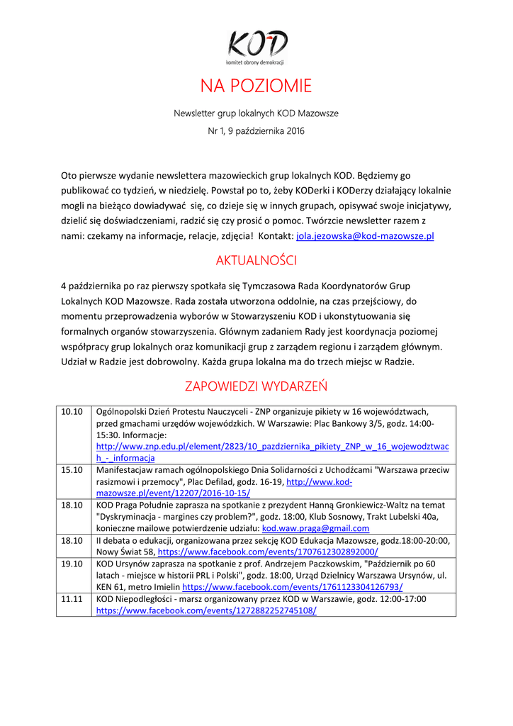 NA POZIOMIE Newsletter grup lokalnych KOD Mazowsze Nr 1, 9 października 2016 Oto pierwsze wydanie newslettera mazowieckich grup lokalnych KOD. Będziemy go publikować co tydzień, w niedzielę. Powstał po to, żeby KODerki i KODerzy działający lokalnie mogli na bieżąco dowiadywać się, co dzieje się w innych grupach, opisywać swoje inicjatywy, dzielić się doświadczeniami, radzić się czy prosić o pomoc. Twórzcie newsletter razem z nami: czekamy na informacje, relacje, zdjęcia! Kontakt: [email protected] AKTUALNOŚCI 4 października po raz pierwszy spotkała się Tymczasowa Rada Koordynatorów Grup Lokalnych KOD Mazowsze. Rada została utworzona oddolnie, na czas przejściowy, do momentu przeprowadzenia wyborów w Stowarzyszeniu KOD i ukonstytuowania się formalnych organów stowarzyszenia. Głównym zadaniem Rady jest koordynacja poziomej współpracy grup lokalnych oraz komunikacji grup z zarządem regionu i zarządem głównym. Udział w Radzie jest dobrowolny. Każda grupa lokalna ma do trzech miejsc w Radzie. ZAPOWIEDZI WYDARZEŃ 10.10 15.10 18.10 18.10 19.10 11.11 Ogólnopolski Dzień Protestu Nauczyceli - ZNP organizuje pikiety w 16 województwach, przed gmachami urzędów wojewódzkich. W Warszawie: Plac Bankowy 3/5, godz. 14:0015:30. Informacje: http://www.znp.edu.pl/element/2823/10_pazdziernika_pikiety_ZNP_w_16_wojewodztwac h_-_informacja Manifestacjaw ramach ogólnopolskiego Dnia Solidarności z Uchodźcami "Warszawa przeciw rasizmowi i przemocy", Plac Defilad, godz. 16-19, http://www.kodmazowsze.pl/event/12207/2016-10-15/ KOD Praga Południe zaprasza na spotkanie z prezydent Hanną Gronkiewicz-Waltz na temat "Dyskryminacja - margines czy problem?", godz. 18:00, Klub Sosnowy, Trakt Lubelski 40a, konieczne mailowe potwierdzenie udziału: [email protected] II debata o edukacji, organizowana przez sekcję KOD Edukacja Mazowsze, godz.18:00-20:00, Nowy Świat 58, https://www.facebook.com/events/1707612302892000/ KOD Ursynów zaprasza na spotkanie z prof. Andrzejem Paczkowskim, "Październik po 60 latach - miejsce w historii PRL i Polski", godz. 18:00, Urząd Dzielnicy Warszawa Ursynów, ul. KEN 61, metro Imielin https://www.facebook.com/events/1761123304126793/ KOD Niepodległości - marsz organizowany przez KOD w Warszawie, godz. 12:00-17:00 https://www.facebook.com/events/1272882252745108/ GRUPY LOKALNE PIKODY 15 października, KOD Miasta Ogrody, Milanówek, kontakt: [email protected] SPOTKANIA GRUP 10 października spotkanie osób stowarzyszonych w KOD Śródmieście, m.in. wybory tymczasowych koordynatorów 11 października spotkanie KOD Targówek-Praga Północ DYŻURY POD LICZNIKIEM 9/10 października Bemowo-Wola 11/12 i 13/14 października Siedlce 14/15 października Targówek-Praga Północ 15/16 października Ochota RELACJE KOD PIASECZNO podczas swego dyżuru pod licznikiem przed KPRM zorganizował debatę w ramach autorskiego cyklu "KOD dostępu", poświęconego różnym kulturom. Tym razem tematem rozmowy był "Jeden islam? Wielość spojrzeń". Zachęcamy do przeczytania relacji Janusza Krzywickiego: http://www.kodpiaseczno.pl/tekst26_KodDost3.html Jak widać bardzo nastrojowo, mimo chłodu: REGION I KRAJ Marek Skórka zastąpił Piotra Wieczorka w roli pełnomocnika ds. organizacji struktur Stowarzyszenia KOD w województwie mazowieckim. Piotr Wieczorek będzie pełnił funkcję dyrektora biura zarządu KOD oraz pełnomocnika ds. akcji ogólnopolskich. Na 10 października Marek zaplanował spotkania "zapoznawcze" z przedstawicielami grup lokalnych. 8 października podczas warszawskiego Kongresu Kultury sekcja KOD Edukacja Mazowsze była gospodarzem debaty: "Zakłamana rzeczywistość". Tu można znaleźć więcej informacji, w tym również materiały z debaty: https://www.facebook.com/events/1081692465212403/ 4 października Krajowy Sąd Rejestrowy zarejestrował nowy Statut Stowarzyszenia Komitet Obrony Demokracji. Tekst jednolity statutu: http://www.ruchkod.pl/statutstowarzyszenia-kod/ WARTO ZAGLĄDAĆ witryna KOD Mazowsze: aktualności z regionu, publicystyka, kalendarium wydarzeń w regionie, blogi, galeria rysunków satyrycznych: www.kod-mazowsze.pl fanpage sekcji Edukacja KOD Mazowsze - naprawdę ciekawe inicjatywy edukacyjne: https://www.facebook.com/KodEduMaz/?fref=ts witryna ogólnopolska KOD: www.ruchkod.pl prawdziwa kopalnia dobrych tekstów, wywiadów, felietonów: www.koduj24.pl STOPKA INFORMACYJNA GRUPY LOKALNE KOD MAZOWSZE: Bemowo-Wola, Białołęka-Tarchomin, Ciechanów, Garwolin, Gostynin, Legionowo, Miasta Ogrody, Mińsk Mazowiecki, Mokotów, Ochota, Ostrołęka-Kurpie, Piaseczno, Płock, Praga Południe, Pruszków, Radom, Siedlce, Sulejówek, Śródmieście, Targówek-Praga Północ, Ursus-Piastów, Ursynów, Wawer, Wilanów, Żoliborz-Bielany-Powiat Warszawski Zachodni. Adres do przesyłek pocztowych: Komitet Obrony Demokracji ul. Chałubińskiego 8, skrytka pocztowa 15 00-694 Warszawa Biuro KOD: tel. 729 055 221, [email protected], ul. Marszałkowska 2/4 Rozliczenia: Anita Szymańska, [email protected] Redakcja "Obywatela": Natalia Jarska, [email protected] Portal mazowiecki: [email protected] Redakcja newslettera "Na poziomie": [email protected] Konta bankowe KOD: Składki członkowskie: 78 2130 0004 2001 0746 1189 0001 Wspieraj Kod Mazowsze: 73 1950 0001 2006 7267 0847 0010