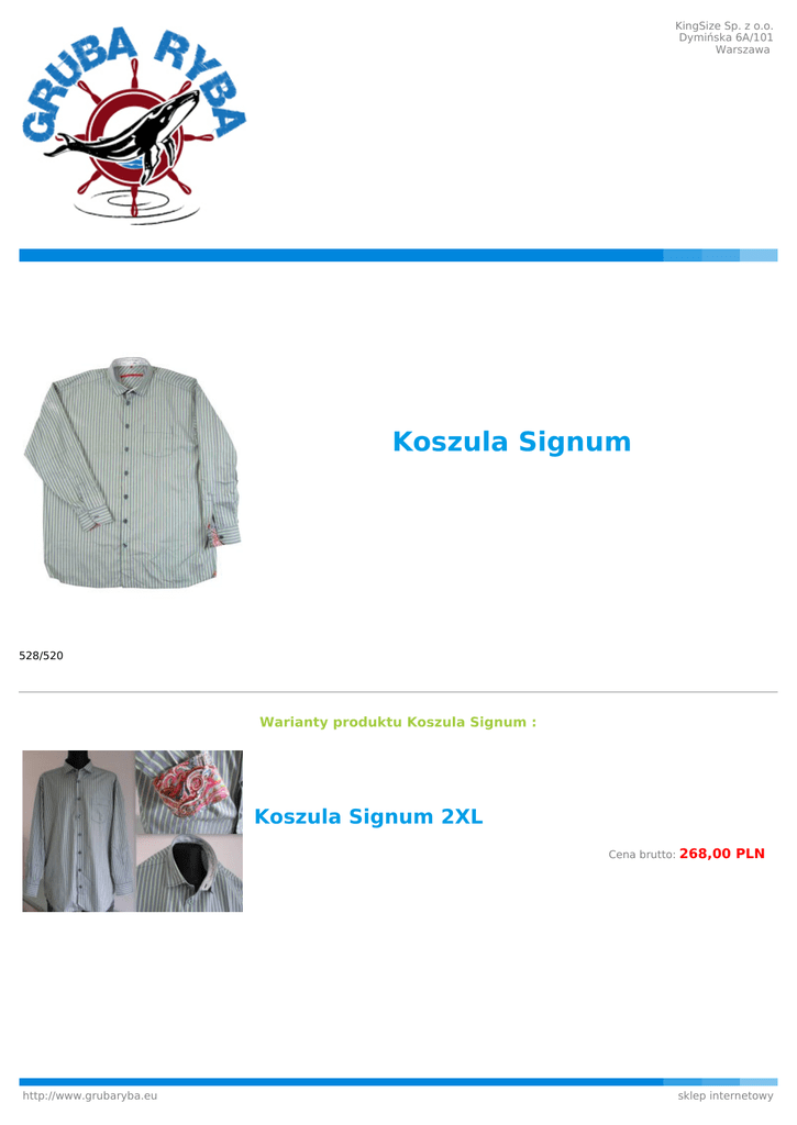 KingSize Sp. z o.o. Dymińska 6A/101 Warszawa Koszula Signum 528/520 Warianty produktu Koszula Signum : Koszula Signum 2XL Cena brutto: http://www.grubaryba.eu 268,00 PLN sklep internetowy