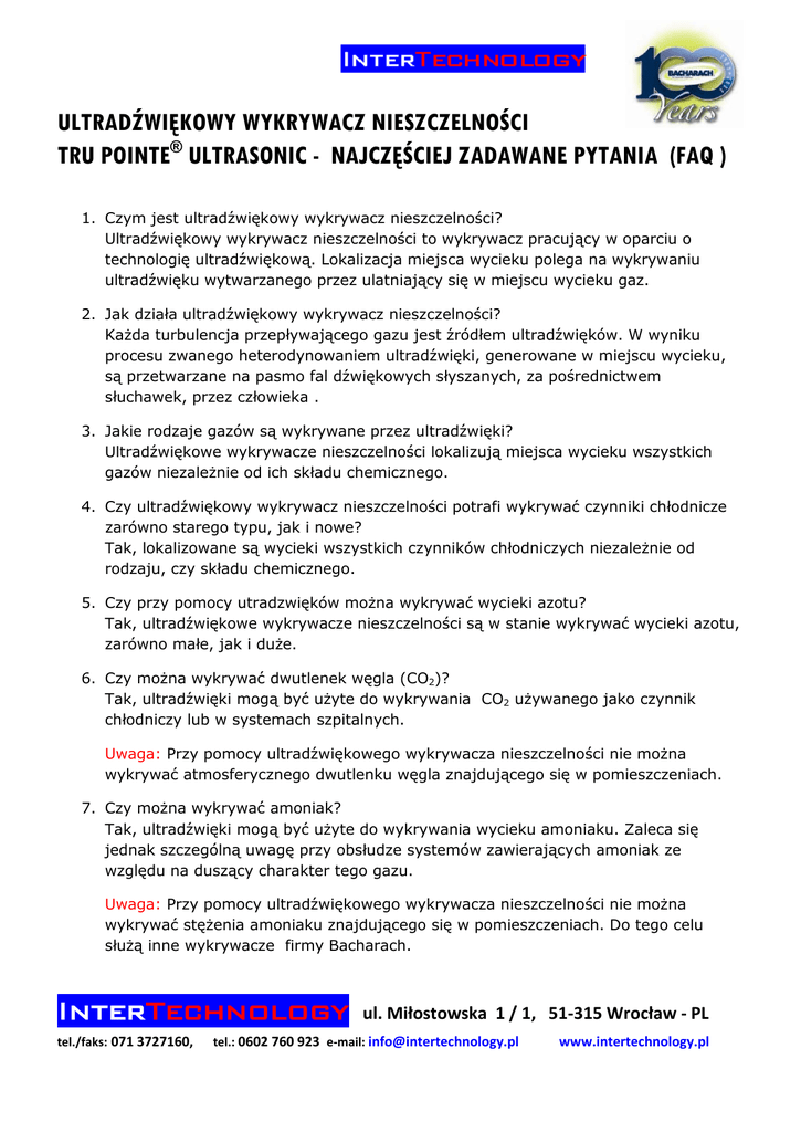ULTRADŹWIĘKOWY WYKRYWACZ NIESZCZELNOŚCI TRU POINTE® ULTRASONIC - NAJCZĘŚCIEJ ZADAWANE PYTANIA (FAQ ) 1. Czym jest ultradźwiękowy wykrywacz nieszczelności? Ultradźwiękowy wykrywacz nieszczelności to wykrywacz pracujący w oparciu o technologię ultradźwiękową. Lokalizacja miejsca wycieku polega na wykrywaniu ultradźwięku wytwarzanego przez ulatniający się w miejscu wycieku gaz. 2. Jak działa ultradźwiękowy wykrywacz nieszczelności? Każda turbulencja przepływającego gazu jest źródłem ultradźwięków. W wyniku procesu zwanego heterodynowaniem ultradźwięki, generowane w miejscu wycieku, są przetwarzane na pasmo fal dźwiękowych słyszanych, za pośrednictwem słuchawek, przez człowieka . 3. Jakie rodzaje gazów są wykrywane przez ultradźwięki? Ultradźwiękowe wykrywacze nieszczelności lokalizują miejsca wycieku wszystkich gazów niezależnie od ich składu chemicznego. 4. Czy ultradźwiękowy wykrywacz nieszczelności potrafi wykrywać czynniki chłodnicze zarówno starego typu, jak i nowe? Tak, lokalizowane są wycieki wszystkich czynników chłodniczych niezależnie od rodzaju, czy składu chemicznego. 5. Czy przy pomocy utradzwięków można wykrywać wycieki azotu? Tak, ultradźwiękowe wykrywacze nieszczelności są w stanie wykrywać wycieki azotu, zarówno małe, jak i duże. 6. Czy można wykrywać dwutlenek węgla (CO2)? Tak, ultradźwięki mogą być użyte do wykrywania CO2 używanego jako czynnik chłodniczy lub w systemach szpitalnych. Uwaga: Przy pomocy ultradźwiękowego wykrywacza nieszczelności nie można wykrywać atmosferycznego dwutlenku węgla znajdującego się w pomieszczeniach. 7. Czy można wykrywać amoniak? Tak, ultradźwięki mogą być użyte do wykrywania wycieku amoniaku. Zaleca się jednak szczególną uwagę przy obsłudze systemów zawierających amoniak ze względu na duszący charakter tego gazu. Uwaga: Przy pomocy ultradźwiękowego wykrywacza nieszczelności nie można wykrywać stężenia amoniaku znajdującego się w pomieszczeniach. Do tego celu służą inne wykrywacze firmy Bacharach. InterTechnology tel./faks: 071 3727160, ul. Miłostowska 1 / 1, 51-315 Wrocław - PL tel.: 0602 760 923 e-mail: [email protected] www.intertechnology.pl 8. Czy przy pomocy wykrywacza ultradźwiękowego można określić poziom stężenia czynnika chłodniczego występującego w parowniku lub chłodnicy? Nie. Wykrywacz służy do wykrywania dźwięku towarzyszącego wyciekowi gazu, a nie do pomiaru własności chemicznych. Nie ma znaczenia, jak długo gaz znajduje się w danym miejscu, istotne jest tylko to, czy gaz przepływa. 9. Czy na wynik pomiaru ma wpływ wiatr wiejący np. nad dachem budynku? Nie, ponieważ prędkość rozchodzenia się ultradźwięków jest taka sama w zimnym powietrzu, jak i w miejscu, w którym występują znaczne jego ruchy. 10. Czy przy pomocy utradzwięków można lokalizować nieszczelności w systemach próżniowych? Tak, powietrze wsysane do systemu także generuje ultradźwięki analogicznie, jak ma to miejsce w systemach ciśnieniowych. Technologia ultradźwiękowa jest jedyną technologią umożliwiającą lokalizację nieszczelności w systemach próżniowych. 11. Z jakiej odległości można wykrywać nieszczelności? Zależnie od wielkości wycieku oraz ciśnienia panującego wewnątrz badanego systemu wynosi ona od 3 do 12,2 m. 12. Czy łatwo jest zlokalizować miejsce wycieku badając z pewnej odległości? Tak, lokalizacja jest bardzo prosta ze względu na dużą kierunkowość ultradźwięków. Kierując się w kierunku źródła wycieku, badzo łatwo jest zlokalizować z dużą dokładnością miejsce nieszczelności. 13. Jak długo trwa lokalizacja miejsca wycieku? Wycieki mogą być zlokalizowane bardzo szybko – z prędkością dźwięku! Nie ma potrzeby powolnego przesuwania sondy w pobliżu źródła wycieku. 14. Czy na wynik pomiaru mają wpływ dźwięki występujące w miejscu pomiaru? Na wynik pomiaru nie mają wpływu dźwięki słyszalne przez ucho ludzkie. Dodatkowo, opatentowana technologia heterodynowa bardzo dobrze rozróżnia dźwięki wywołane wyciekiem od innych dźwięków mechanicznych. 15. Jak można zlokalizować wewnętrzne miejsca wycieku? Lokalizacja jest zależna od rodzaju przewodów z badanym gazem oraz od rodzaju wycieku. Dotykając zawór optentowanym przez firmę Bacharach Inc. rezonatorem (sondą) Touch Probe dochodzi do konwersji wewnętrznych dźwięków spowodowanych wyciekiem na dźwięki rozchodzące się w powietrzu, wykrywane przez Tru Pointe® Ultra. 16. Czy przy pomocy Tru Pointe® Ultra można sprawdzić stan rozprężnych zaworów termicznych (TXV)? Tak, sprawdzenie stanu zaworów TXV zajmuje ok. 10 minut w porównaniu z ok. 1 godziną, co ma miejsce w przypadku zazwyczaj stosowanej techniki przegrzania. InterTechnology tel./faks: 071 3727160, ul. Miłostowska 1 / 1, 51-315 Wrocław - PL tel.: 0602 760 923 e-mail: [email protected] www.intertechnology.pl 17. Czy przy pomocy technologii ultradźwiękowej można sprawdzić stan innego typu zaworów? Tak, dowolny rodzaj zaworów. 18. Odwadniacze pary są rodzajem zaworów. Jak można dokonać sprawdzenia ich stanu? Przy pomocy opatentowanej sondy Touch Probe (dowolny model). Dotyka się zaworu i wtedy słychać, czy para wewnątrz cyrkuluje i czy zawór się otwiera. 19. Czy należy dokonać sprawdzenia wszystkich odwadniaczy pary w systemie? Tak, każdy z przeciekających zaworów pary generuje duże straty finansowe. Szacuje się, że w instalacjach wykorzystujących parę 20-30% zaworów może nie być sprawnych. 20. Czy przy pomocy Tru Pointe® Ultra można wykryć kondensat w rurociągach? Firma Bacharach Inc. jako jedyna na rynku oferuje ultradźwiękowy lokalizator wycieków wykrywający fale dźwiękowe w paśmie słyszalnym (Tru Pointe® 2100). Przyrząd ten pozwala wykrywać dźwięki wywoływane przepływem kondensatu w rurociągach. 21. Czym jest SoundBlaster®? SoundBlaster® to ge
