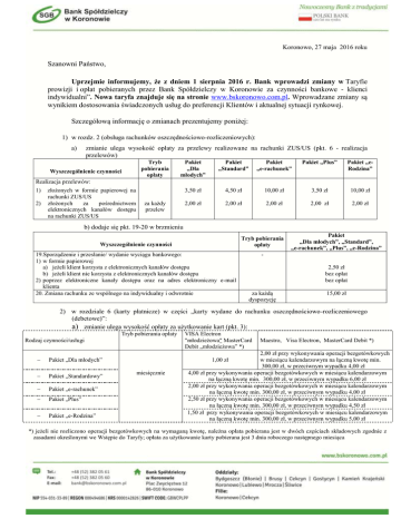 Zmiany w taryfie - Bank Spółdzielczy w Koronowie