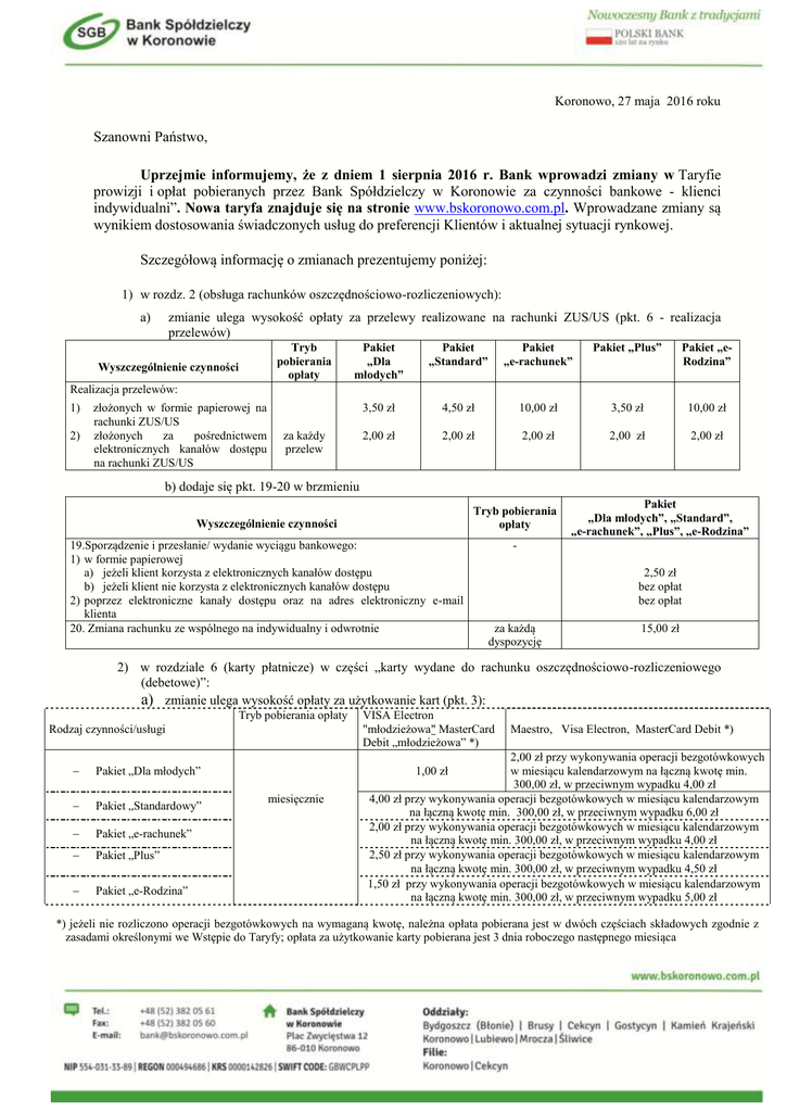 Koronowo, 27 maja 2016 roku Szanowni Państwo, Uprzejmie informujemy, że z dniem 1 sierpnia 2016 r. Bank wprowadzi zmiany w Taryfie prowizji i opłat pobieranych przez Bank Spółdzielczy w Koronowie za czynności bankowe - klienci indywidualni”. Nowa taryfa znajduje się na stronie www.bskoronowo.com.pl. Wprowadzane zmiany są wynikiem dostosowania świadczonych usług do preferencji Klientów i aktualnej sytuacji rynkowej. Szczegółową informację o zmianach prezentujemy poniżej: 1) w rozdz. 2 (obsługa rachunków oszczędnościowo-rozliczeniowych): zmianie ulega wysokość opłaty za przelewy realizowane na rachunki ZUS/US (pkt. 6 - realizacja przelewów) a) Wyszczególnienie czynności Tryb pobierania opłaty Pakiet „Dla młodych” Pakiet „Standard” Pakiet „e-rachunek” Pakiet „Plus” Pakiet „eRodzina” 3,50 zł 4,50 zł 10,00 zł 3,50 zł 10,00 zł 2,00 zł 2,00 zł 2,00 zł 2,00 zł 2,00 zł Realizacja przelewów: 1) 2) złożonych w formie papierowej na rachunki ZUS/US złożonych za pośrednictwem elektronicznych kanałów dostępu na rachunki ZUS/US za każdy przelew b) dodaje się pkt. 19-20 w brzmieniu Tryb pobierania opłaty Wyszczególnienie czynności 19.Sporządzenie i przesłanie/ wydanie wyciągu bankowego: 1) w formie papierowej a) jeżeli klient korzysta z elektronicznych kanałów dostępu b) jeżeli klient nie korzysta z elektronicznych kanałów dostępu 2) poprzez elektroniczne kanały dostępu oraz na adres elektroniczny e-mail klienta 20. Zmiana rachunku ze wspólnego na indywidualny i odwrotnie Pakiet „Dla młodych”, „Standard”, „e-rachunek”, „Plus”, „e-Rodzina” 2,50 zł bez opłat bez opłat za każdą dyspozycję 15,00 zł 2) w rozdziale 6 (karty płatnicze) w części „karty wydane do rachunku oszczędnościowo-rozliczeniowego (debetowe)”: a) zmianie ulega wysokość opłaty za użytkowanie kart (pkt. 3): Tryb pobierania opłaty Rodzaj czynności/usługi Pakiet „Dla młodych” Pakiet „Standardowy” Pakiet „e-rachunek” Pakiet „Plus” Pakiet „e-Rodzina” VISA Electron "młodzieżowa" MasterCard Debit „młodzieżowa” *) Maestro, Visa Electron, MasterCard Debit *) 2,00 zł przy wykonywania operacji bezgotówkowych w miesiącu kalendarzowym na łączną kwotę min. 300,00 zł, w przeciwnym wypadku 4,00 zł 4,00 zł przy wykonywania operacji bezgotówkowych w miesiącu kalendarzowym na łączną kwotę min. 300,00 zł, w przeciwnym wypadku 6,00 zł 2,00 zł przy wykonywania operacji bezgotówkowych w miesiącu kalendarzowym na łączną kwotę min. 300,00 zł, w przeciwnym wypadku 4,00 zł 2,50 zł przy wykonywania operacji bezgotówkowych w miesiącu kalendarzowym na łączną kwotę min. 300,00 zł, w przeciwnym wypadku 4,50 zł 1,50 zł przy wykonywania operacji bezgotówkowych w miesiącu kalendarzowym na łączną kwotę min. 300,00 zł, w przeciwnym wypadku 5,00 zł 1,00 zł miesięcznie *) jeżeli nie rozliczono operacji bezgotówkowych na wymaganą kwotę, należna opłata pobierana jest w dwóch częściach składowych zgodnie z zasadami określonymi we Wstępie do Taryfy; opłata za użytkowanie karty pobierana jest 3 dnia roboczego następnego miesiąca b) w pkt. 6 zmianie ulega ppkt. 2, 3, 6: VISA Electron "młodzieżowa" MasterCard Debit „młodzieżowa” Maestro, Visa Electron, MasterCard Debit MasterCard NFC Rodzaj czynności/usługi Opłata za wypłatę gotówki: 2.) w kasach banków SGB (pod warunkiem, że placówka udostępnia wypłaty w POS) 3.) 2,50 zł 2,50 zł w bankomatach innych, niż wskazane w pkt 1 6.) w ramach usługi cashback 1,70 zł c) pkt. 9 - 10 otrzymują nowe brzmienie: Rodzaj czynności/usługi VISA Electron "młodzieżowa" MasterCard Debit „młodzieżowa” 9. Zmiana PIN w bankomatach: 1) banków SGB 2) innych niż wskazane w pkt. 1 10. Sprawdzenie salda rachunku w bankomatach: 1) banków SGB 2) innych niż wskazane w pkt. 1) Maestro, Visa Electron, MasterCard Debit MasterCard NFC 6,00 zł 8,50 zł nie dotyczy nie dotyczy 0,50 zł 0,50 zł (po udostępnieniu usługi przez SGB-Bank S.A.) 1,50 zł 1,50 zł d) dodaje się pkt. 15 Rodzaj czynności/usługi 15. Ekspresowe przesłanie karty lub numeru PIN (dostarczenie w ciągu 3 dni roboczych) Tryb pobierania opłaty za każdą przesyłkę VISA Electron "młodzieżowa" MasterCard Debit „młodzieżowa” *) stawka Maestro, Visa Electron, MasterCard NFC **) MasterCard Debit *) 45,00 zł nie dotyczy Jeżeli przed datą wejścia w życie proponowanych zmian nie zostanie przez Państwa złożony sprzeciw wobec tych zmian, zmiany obowiązują od dnia 1 sierpnia 2016 roku. Przed datą wejścia w życie zmian mogą Państwo wypowiedzieć umowę ze skutkiem natychmiastowym bez ponoszenia opłat. W przypadku złożenia przez Państwa sprzeciwu i niewypowiedzenia umowy, umowa wygasa z dniem poprzedzającym dzień wejścia w życie zmian, bez ponoszenia opłat. W razie rozwiązania w wyżej wskazany sposób umowy dotyczącej rachunku lokaty, do końca okresu umownego strony związane będą postanowieniami w brzmieniu przed wprowadzeniem zmian. Wszelkie informacje dotyczące oferty Banku znajdą Państwo na naszej stronie internetowej oraz w placówkach naszego Banku. Adresy oraz dane kontaktowe placówek Banku Spółdzielczego w Koronowie zamieszczone są na naszej stronie internetowej. W przypadku pytań i wątpliwości z Państwa strony nasi Doradcy są do Państwa dyspozycji. Z poważaniem Zarząd Banku Spółdzielczego w Koronowie