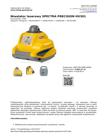 I-NET.PL Sp.J. o. GeoSklep Olsztyn, ul. Cementowa 3/301 Zapraszamy do sklepu www.sklep.geoezja.pl tel. +48 609 571 271, 89 670 11 00, 58 7 421 571 faks 89 670 11 11, 58 7421 871 e-mail [email protected] bezpłatna infolinia 800 70 30 31 Niwelator laserowy SPECTRA PRECISION HV301 kod produktu: 3268 kategoria: Kategorie > INSTRUMENTY > NIWELATORY > LASEROWE > ROTACYJNE Producent: SPECTRA PRECISION Cena brutto: 5 681,37 zł Cena netto: 4 619,00 zł Kod QR: Profesjonalny, ogólnobudowlany laser do zastosowań wewnątrz i na zewnątrz. Oferuje użytkownikowi dużą dokładność, różnorodność funkcji i prostą obsługę. Ustawianie jest w pełni automatyczne zarówno w poziomie jak i w pionie. 4 prędkości rotacji i 4 zakresy skaningu w zależności od potrzeby. Dobrze widoczna wiązka laserowa eliminuje konieczność używania odbiornika wewnątrz pomieszczeń. Pełna kontrola za pomocą pilota, 360° w stosunku do lasera. Duża szczelność chroni laser przed kurzem i wodą. Wysoce wydajne akumulatory w standardzie. Wszechstronne, wytrzymałe i dokładne narzędzie pracy dla ogólnych zastosowań budowlanych. Charakterystyka: Elektroniczny system poziomowania w poziomie i pionie strona: 1/3 wydrukowano: 04-03-2017 http://www.sklep.geodezja.pl/niwelator-laserowy-spectra-precision-hv301.html Jednoosobowa obsługa Wyznaczanie płaszczyzny poziomej lub pionowej, kąta prostego i pionu Funkcja skanowania (linia „rysowana”): 8°, 45°, 90°, 180° Różne prędkości rotacji Zdalne sterowanie z pilota Wyznaczanie płaszczyzny pochylonej wzdłuż osi X lub Y Manualne wyznaczanie spadków na osi X i Y Sensor temperatury – dokładne pomiary w każdych warunkach Możliwość wpasowania płaszczyzny pionowej w dwa punkty HI Alarm – ostrzeżenie o zmianie wysokości wiązki lasera Sleep mode – uśpienie lasera Specyfikacja techniczna: Zasięg 500m (średnica) Dokładność 0,7mm/10m Zakres samopoziomowania 5° Prędkość rotacji 0, 10, 80, 200, 600 obr/min Śruba statywu 5/8” x 11 (w poziomie i pionie) Zasilanie 4 x R20 Czas pracy 90h Wodoszczelność/pyłosz IP54 czelność Zestaw zawiera: Niwelator laserowy HV301, Pilot RC601, Uchwyt ścienny M300, Okulary laserowe, Płytka celownicza, strona: 2/3 wydrukowano: 04-03-2017 http://www.sklep.geodezja.pl/niwelator-laserowy-spectra-precision-hv301.html Ładowarka 220V, pakiet akumulatorów, Kufer transportowy strona: 3/3 wydrukowano: 04-03-2017 http://www.sklep.geodezja.pl/niwelator-laserowy-spectra-precision-hv301.html