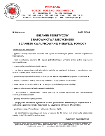 FUNDACJA TOBIE POLSKO RATOWNICY Ul. LEGNICKA 65, 54-206 WROCŁAW TEL. 730 997 999 / 730 997 333 FAX. (71) 359 75 01 E-MAIL: [email protected] www.fundacjatpr.pl _________________________________________________________ Nr testu ………. BAZA PYTAŃ EGZAMIN TEORETYCZNY Z RATOWNICTWA MEDYCZNEGO Z ZAKRESU KWALIFIKOWANEJ PIERWSZEJ POMOCY Informacje dla zdających: - pytania zostały wybrane spośród 198 pytań opracowanych przez Centrum Egzaminów Medycznych, - test teoretyczny zawiera 30 pytań jednokrotnego wyboru (tylko jedna odpowiedź jest prawidłowa), - czas rozwiązywania testu to 40 minut, - na karcie egzaminacyjnej odpowiedzi należy się podpisać imiennie , nazwiskiem oraz wpisać numer pesel i numer testu, - prawidłową odpowiedź należy zaznaczyć na karcie odpowiedzi poprzez zakreślenie X, - mylną odpowiedź należy zaznaczyć kółkiem i złożyć podpis obok tabelki, - dwie zaznaczone odpowiedzi X , w jednym pytaniu będą oznaczały błąd, - proszę nie zaznaczać odpowiedzi na teście, - korzystanie z jakiejkolwiek formy pomocy w czasie egzaminu jest niedozwolone i skutkuje niezaliczeniem, - proszę dokładnie czytać pytania, - pozytywne zaliczenie egzaminu to 90% prawidłowo zakreślonych odpowiedzi X , na karcie egzaminacyjnej odpowiedzi tj. uzyskanie minimum 27 punktów, - punktacja : odp. Prawidłowa: 1 pkt., odp. Błędna: 0 pkt., - po zakończeniu rozwiązywania testu w czasie do 40 minut, test oraz kartę odpowiedzi należy złożyć Komisji Egzaminacyjnej. ŻYCZYMY POWODZENIA ______________________________________________________________ Fundacja Tobie Polsko Ratownicy - podmiot uprawniony do wykonywania ratownictwa wodnego na podstawie decyzji Ministra Spraw Wewnętrznych nr 15/2014 DRIOL-NRGW-0272-38/2013 oraz do realizacji kursu KPP – zezwolenie BZ.PRRM.6312.215.2015.KT. FUNDACJA TOBIE POLSKO RATOWNICY Ul. LEGNICKA 65, 54-206 WROCŁAW TEL. 730 997 999 / 730 997 333 FAX. (71) 359 75 01 E-MAIL: [email protected] www.fundacjatpr.pl _________________________________________________________ Nr 1. Przyczyna wstrząsu hipowolemicznego to: A. nagły spadek poziomu cukru we krwi. B. nagłe podniesienie poziomu cukru we krwi. C. chwilowa utrata przytomności. D. spadek objętości krwi krążącej. E. wszystkie odpowiedzi są fałszywe. Nr 5. Niepokój, szybki oddech, słabo wyczuwalne tętno, bladość, zimny pot na twarzy, to objawy: A. udaru cieplnego. B. śmierci klinicznej. C. przegrzania. D. wstrząsu. E. żadne z wymienionych Nr 6. Spowolnienie narastania objawów wstrząsu możesz uzyskać: A. tamując krwawienie. B. utrzymując drożność dróg oddechowych. C. chroniąc przed wychłodzeniem. D. stosując ułożenie p/wstrząsowe. E. wszystkie odpowiedzi są prawdziwe. ______________________________________________________________ Fundacja Tobie Polsko Ratownicy - podmiot uprawniony do wykonywania ratownictwa wodnego na podstawie decyzji Ministra Spraw Wewnętrznych nr 15/2014 DRIOL-NRGW-0272-38/2013 oraz do realizacji kursu KPP – zezwolenie BZ.PRRM.6312.215.2015.KT. FUNDACJA TOBIE POLSKO RATOWNICY Ul. LEGNICKA 65, 54-206 WROCŁAW TEL. 730 997 999 / 730 997 333 FAX. (71) 359 75 01 E-MAIL: [email protected] www.fundacjatpr.pl _________________________________________________________ Nr 18. U osoby, która uskarżała się na ból w kl. piersiowej doszło w Twojej obecności do utraty przytomności i osunięcia na podłogę: A. układasz osobę w pozycji bocznej ustalonej z utrzymaniem drożności dróg oddechowych i wzywasz pomoc. B. układasz osobę na wznak z nogami uniesionymi około 30cm do góry i wzywasz pomoc. C. sprawdzasz czy w kieszeni poszkodowany nie ma leków na serce by je podać. D. udrażniasz drogi oddechowe i sprawdzasz obecność oddechu, E. po stwierdzeniu braku oddechu prowadzisz oddech zastępczy. Nr 26. W stosunku do osoby, która w wyniku zatrucia straciła przytomność podejmiesz następujące czynności: A. podasz węgiel aktywowany jako odtrutkę i wezwiesz pomoc. B. sprawdzisz podstawowe czynności życiowe i udasz się po pomoc. C. zabezpieczysz substancję która została zażyta i udasz się po pomoc. D. przy zachowanym oddechu, ułożysz w pozycji bezpiecznej i wezwiesz pomoc. E. wezwiesz pomoc by nie tracić czasu na zbędne działania. Nr 28. Wskaż zdanie nieprawdziwe dotyczące informacji o tlenku węgla: A. łączy się z hemoglobiną około 300 razy silniej niż tlen. B. ma charakterystyczny zapach i barwę. C. jest lżejszy od powietrza. D. popularnie nazywają tlenek węgla czadem. E. powstaje podczas spalania. ______________________________________________________________ Fundacja Tobie Polsko Ratownicy - podmiot uprawniony do wykonywania ratownictwa wodnego na podstawie decyzji Ministra Spraw Wewnętrznych nr 15/2014 DRIOL-NRGW-0272-38/2013 oraz do realizacji kursu KPP – zezwolenie BZ.PRRM.6312.215.2015.KT. FUNDACJA TOBIE POLSKO RATOWNICY Ul. LEGNICKA 65, 54-206 WROCŁAW TEL. 730 997 999 / 730 997 333 FAX. (71) 359 75 01 E-MAIL: [email protected] www.fundacjatpr.pl _________________________________________________________ Nr 33. Niska temperatura wody, w której przebywał poszkodowany powoduje, że: A. działania reanimacyjne powinny trwać dłużej. B. działa ochronnie na centralny system nerwowy zmniejszając skutki niedotlenienia. C. zwiększa uraz poszkodowanego. D. prawdziwe są odpowiedzi A i B. E. prawdziwe są wszystkie odpowiedzi. Nr 34. Wskaż zdanie prawdziwe: A. woda słona uszkadza drogi oddechowe i należy ją najpierw wylać z poszkodowanego. B. woda słodka się nie wchłania i należy ja wylać z poszkodowanego. C. przy utonięciu w wodzie morskiej rokowanie jest lepsze. D. przy utonięciu w wodzie słodkiej rokowanie jest lepsze. E. postępowanie z osobą podtopioną jest takie samo, niezależnie od rodzaju wody. Nr 35. Ratując osobę podtopioną należy pamiętać że – wskaż zdanie prawdziwe: A. śmierć mózgu następuje szybciej w zimnej wodzie. B. uciskanie kl. piersiowej i prow