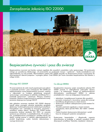 Zarządzanie Jakością ISO 22000 Bezpieczeństwo żywności i pasz dla zwierząt Bezpieczeństwo żywności jest bardzo ważnym aspektem dla wszystkich uczestników rynku spożywczego. Od producenta rolnego po sprzedawcę detalicznego, od przewoźnika po producenta maszyn i opakowań – każdy przedsiębiorca jest odpowiedzialny za swój produkt. Wprowadzenie systemu ISO 22000 pozwala na dostosowanie procesu wytwarzania do obowiązujących obecnie przepisów i wymogów jakości. Znak DEKRA jest Twoim dowodem bezpieczeństwa dla klientów z całego świata. Dlaczego ISO 22000? Co oferuje DEKRA W przeciwieństwie do wielu innych popularnych norm jakości w przemyśle żywności i pasz zwierzęcych, ISO 22000 jest międzynarodową normą bezpieczeństwa żywności, ustaloną w odpowiedzi na trwającą globalizację przemysłu spożywczego i pozwalającą na jednolitą certyfikację firm w przemyśle spożywczym i paszowym. Wszyscy uczestnicy przemysłu i dostawcy mogą stosować te wszechstronne normy, ponieważ obejmują one wymogi HACCP. Konsekwentnie stosowany system zarządzania jakością ISO 22000 pomoże Ci zidentyfikować potencjalne obszary ryzyka i je nadzorować. Polegaj na międzynarodowym doświadczeniu certyfikacyjnym DEKRA w sektorze przedsiębiorstw i ciesz się następującymi korzyściami: Jako globalnie uznawany standard, ISO 22000 obejmuje szeroki zakres wymogów odnośnie standardów sprzedaży detalicznej. To eliminuje konieczność wielokrotnych certyfikacji. Oszczędzasz czas i pieniądze na stworzeniu, utrzymaniu i certyfikacji systemu jakości. Struktura ISO 22000 bardzo przypomina strukturę standardu ISO 9001, co znacznie upraszcza jej wdrażanie w przedsiębiorstwie. W związku z tym, przedsiębiorstwom posiadającym certyfikat łatwiej jest spełnić wymogi prawne w zakresie odpowiedzialności za produkt (organizacja, wybór, kontrola, dokumentacja i wymogi staranności). >> Jednolitymi i kompleksowymi kryteriami dla wszystkich procesów związanych z żywnością i paszą dla zwierząt >> Certyfikacją akceptowaną na całym świecie >> Skutecznymi środkami zabezpieczenia przed stratami finansowymi >> Wysokim poziomem zgodności z innymi normami zarządzania, takimi jak ISO 9001, ISO 14001 i OHSAS 18001 >> Niskimi kosztami dostosowania dokumentacji i certyfikacji do istniejących systemów zarządzania Dostarczamy bezpośrednie i długotrwałe wsparcie ukierunkowane na praktykę, w zakresie wszystkich kwestii dotyczących certyfikacji. Neutralne, niezależne i skuteczne. Kroki ku pomyślnej certyfikacji 1 Spotkanie informacyjne >> Odpowiedź na pytania >> Wspólne określenie kolejnych kroków >> Spotkanie projektowe lub audyt wstępny 2 Przegląd dokumentów i audyt na miejscu >> Przegląd dokumentacji >> Opis systemu zarządzania >> Określenie potencjału do doskonalenia >> Wdrożenie udokumentowanych deklaracji do codziennych działań biznesowych 3 4 Raport z auditu >> Wyniki oceny >> W przypadku niezgodności informacje na temat optymalizacji procesu Usługi DEKRA dla Państwa biznesu Usługi certyfkacyjne DEKRA można wykorzystywać dla innych obszarów i systemów, np. ISO 9001, ISO 14001, OHSAS 18001, IFS, FSSC, GMP+, REDcert/KZR INiG/ISCC, HACCP, NON GMO PI. Nasze portfolio zawiera ponad 40 akredytacji i certyfikatów! Dodatkowo Grupa DEKRA oferuje szeroki wachlarz innych usług związanych z bezpieczeństwem żywności: >> Ocenę i dostosowanie do Twoich regulacji, np. do wymagań dostawcy >> Branżowe szkolenia dla koordynatorów zarządzania jakością >> Usługi z zakresu certyfikacji personelu >> Kontrole i certyfikacje produktów, np. GS dla urządzeń elektrycznych i elektronicznych Certyfikat i znak DEKRA >> Wystawienie certyfikatu po udanej certyfikacji >> Przyznanie znaku DEKRA Roczny nadzór aby upewnić się, że Twój system zarządzania jest utrzymany w dobrym stanie i jest doskonalony DEKRA Certification Znak DEKRA Aktywność. Staranność. Wizjonerstwo. Niezależnie od tego, czy Państwa sukces na międzynarodowym rynku opiera się na sprawnych procesach biznesowych, niezawodności produktów i usług czy wykwalifikowanych ekspertach, ponad 1,000 ekspertów DEKRA na całym świecie, oferuje Państwu kompleksowe usługi związane z jakością, bezpieczeństwem i higieną pracy oraz trwałością i odpowiedzialnością. Zaoferuj swoim klientom bezpieczeństwo i jakość z naszym znakiem DEKRA! Około 30 tysięcy firm w ponad 50 krajach już dzisiaj korzysta z naszych certyfikacji oraz badań i kontroli, aby szybko i bez komplikacji osiągać indywidualne cele biznesowe. A co możemy zrobić dla Państwa? DEKRA Certification Sp. z o.o. WROCŁAW Plac Solny 20 tel. +48.71.780-47-77 do 78 WARSZAWA ul. Rzymowskiego 28 tel. +48.22.654-43-10 do 11 [email protected] www.dekra.pl Znak DEKRA oznacza najwyższą niezawodność - w różnych branżach i w skali międzynarodowej. Będzie ona tworzyć zaufanie i da klientom pewność bezpieczeństwa. Nasz znak będzie Państwa mocną stroną. Może służyć jako nośnik wizerunku i narzędzie marketingowe.