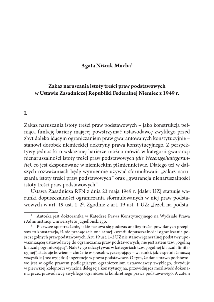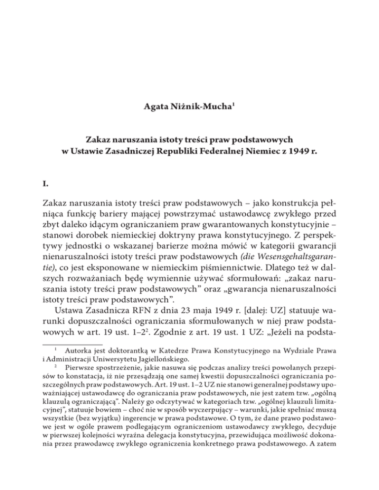 Agata Niżnik-Mucha1 Zakaz naruszania istoty treści praw podstawowych w Ustawie Zasadniczej Republiki Federalnej Niemiec z 1949 r. I. Zakaz naruszania istoty treści praw podstawowych – jako konstrukcja pełniąca funkcję bariery mającej powstrzymać ustawodawcę zwykłego przed zbyt daleko idącym ograniczaniem praw gwarantowanych konstytucyjnie – stanowi dorobek niemieckiej doktryny prawa konstytucyjnego. Z perspektywy jednostki o wskazanej barierze można mówić w kategorii gwarancji nienaruszalności istoty treści praw podstawowych (die Wesensgehaltsgarantie), co jest eksponowane w niemieckim piśmiennictwie. Dlatego też w dalszych rozważaniach będę wymiennie używać sformułowań: „zakaz naruszania istoty treści praw podstawowych” oraz „gwarancja nienaruszalności istoty treści praw podstawowych”. Ustawa Zasadnicza RFN z dnia 23 maja 1949 r. [dalej: UZ] statuuje warunki dopuszczalności ograniczania sformułowanych w niej praw podstawowych w art. 19 ust. 1–22. Zgodnie z art. 19 ust. 1 UZ: „Jeżeli na podsta1 Autorka jest doktorantką w Katedrze Prawa Konstytucyjnego na Wydziale Prawa i Administracji Uniwersytetu Jagiellońskiego. 2 Pierwsze spostrzeżenie, jakie nasuwa się podczas analizy treści powołanych przepisów to konstatacja, iż nie przesądzają one samej kwestii dopuszczalności ograniczania poszczególnych praw podstawowych. Art. 19 ust. 1–2 UZ nie stanowi generalnej podstawy upoważniającej ustawodawcę do ograniczania praw podstawowych, nie jest zatem tzw. „ogólną klauzulą ograniczającą”. Należy go odczytywać w kategoriach tzw. „ogólnej klauzuli limitacyjnej”, statuuje bowiem – choć nie w sposób wyczerpujący – warunki, jakie spełniać muszą wszystkie (bez wyjątku) ingerencje w prawa podstawowe. O tym, że dane prawo podstawowe jest w ogóle prawem podlegającym ograniczeniom ustawodawcy zwykłego, decyduje w pierwszej kolejności wyraźna delegacja konstytucyjna, przewidująca możliwość dokonania przez prawodawcę zwykłego ograniczenia konkretnego prawa podstawowego. A zatem 154 PRZEGLĄD PRAWA KONSTYTUCYJNEGO 2011/4 wie niniejszej Ustawy Zasadniczej prawo podstawowe może zostać w drodze ustawy lub na podstawie ustawy ograniczone, ustawa ta musi mieć powszechną moc obowiązującą, a nie tylko w odniesieniu do pojedynczego przypadku. Poza tym ustawa ta musi określać prawo podstawowe z podaniem artykułu”. Z kolei art. 19 ust. 2 UZ stanowi: „W żadnym przypadku nie może zostać naruszona istota treści prawa podstawowego3”. Zakaz naruszania praw podstawowych w istocie ich treści jest na gruncie art. 19 UZ jedynym warunkiem ograniczania praw podstawowych o charakterze materialnym. Nie jest to jednak jedyny konstytucyjny warunek dopuszczalności ograniczania wskazanych praw o tym charakterze. Federalny Trybunał ograniczenie danego prawa podstawowego jest dopuszczalne wówczas, gdy konstytucyjna konstrukcja tego prawa wyraźnie przewiduje taką możliwość, tj. gdy względem konkretnego prawa podstawowego sformułowane jest tzw. „zastrzeżenie ustawowe”. Wskazana konstrukcja zastosowana została między innymi w odniesieniu do prawa do życia, nietykalności cielesnej, wolności osobistej (art. 2 ust. 2 zd. 2 UZ) czy też wolności zgromadzeń odbywających się pod gołym niebem (art. 8 ust. 2 UZ). Z kolei prawa podstawowe, w odniesieniu do których nie zostały sformułowane klauzule przewidujące możliwość ich ograniczania, w zamyśle ustrojodawcy miały być prawami niepodlegającymi jakimkolwiek ograniczeniom. R. Alexy określa te prawa mianem „praw podstawowych gwarantowanych bez zastrzeżeń”. Do wskazanej kategorii praw podstawowych należą między innymi: wolność sztuki, wolność nauki, wolność badań naukowych (art. 5 ust. 3 UZ), wolność wyznania (art. 4 ust. 1 UZ), prawo do odmowy odbycia służby wojskowej z bronią w ręku (art.4 ust. 3 UZ). Ów pierwotny zamysł uległ jednak swoistej weryfikacji, którą – można powiedzieć – wymogła praktyczna potrzeba dopuszczenia do ingerencji prawodawcy również w te prawa. Federalny Trybunał Konstytucyjny w orzeczeniu z 1970 r. dotyczącym odmowy odbycia służby wojskowej [BVerfGE 28, 243, 261] ukształtował formułę, którą uczynił podstawą dla ograniczania wskazanych praw podstawowych. Stwierdził mianowicie, iż: „Tylko kolidujące prawa podstawowe osób trzecich i inne wartości prawne o randze konstytucyjnej, uwzględniając jedność konstytucji i chroniony przez nią cały porządek wartości, wyjątkowo są w stanie w pojedynczych przypadkach ograniczyć nieograniczalne prawa podstawowe”. W związku z powyższym od przeszło trzydziestu lat również prawa podstawowe, względem których ustrojodawca nie sformułował wyraźnych klauzul przewidujących możliwość ich ograniczania, mogą jednak – wyjątkowo – być przedmiotem ingerencji ustawodawcy, jeżeli zachodzą przesłanki wskazane przez Federalny Trybunał Konstytucyjny. 3 Art. 19 abs. 2: „In keinem Falle darf ein Grundrecht in seinem Wesengehalt angetastet werden”. Formułę określającą przedmiot nienaruszalności, tj. Wesengehalt des Grundrechts, można przetłumaczyć jako „istotna treść praw podstawowych” bądź „istota treści praw podstawowych”. Opierając się na tłumaczeniu B. Banaszaka i A. Malickiej, posługuję się drugim z przywołanych terminów. Konstytucja Niemiec, tłum. B. Banaszak, A. Malicka, wstęp B. Banaszak, Warszawa 2008, s. 137. Agata Niżnik-Mucha • Zakaz naruszania istoty treści praw podstawowych... 155 Konstytucyjny wyprowadza bowiem z zasady państwa prawa4 – jako jej konieczną konsekwencję – materialną przesłankę legalności ograniczania praw podstawowych w postaci zasady proporcjonalności (der Grundsatz der Verhältnismässigkeit, das Verhältnismässigkeitsprinzip). Zasada ta, określana także w niemieckiej doktrynie prawa konstytucyjnego mianem zakazu nadmiernej ingerencji