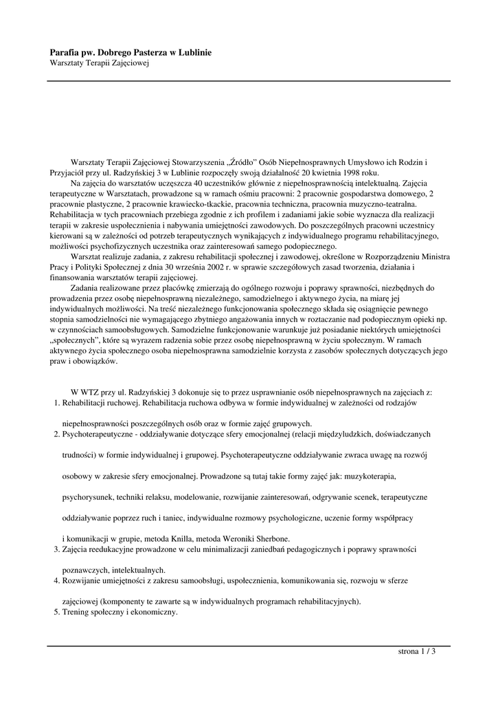 Parafia pw. Dobrego Pasterza w Lublinie Warsztaty Terapii Zajęciowej Warsztaty Terapii Zajęciowej Stowarzyszenia „Źródło” Osób Niepełnosprawnych Umysłowo ich Rodzin i Przyjaciół przy ul. Radzyńskiej 3 w Lublinie rozpoczęły swoją działalność 20 kwietnia 1998 roku. Na zajęcia do warsztatów uczęszcza 40 uczestników głównie z niepełnosprawnością intelektualną. Zajęcia terapeutyczne w Warsztatach, prowadzone są w ramach ośmiu pracowni: 2 pracownie gospodarstwa domowego, 2 pracownie plastyczne, 2 pracownie krawiecko-tkackie, pracownia techniczna, pracownia muzyczno-teatralna. Rehabilitacja w tych pracowniach przebiega zgodnie z ich profilem i zadaniami jakie sobie wyznacza dla realizacji terapii w zakresie uspołecznienia i nabywania umiejętności zawodowych. Do poszczególnych pracowni uczestnicy kierowani są w zależności od potrzeb terapeutycznych wynikających z indywidualnego programu rehabilitacyjnego, możliwości psychofizycznych uczestnika oraz zainteresowań samego podopiecznego. Warsztat realizuje zadania, z zakresu rehabilitacji społecznej i zawodowej, określone w Rozporządzeniu Ministra Pracy i Polityki Społecznej z dnia 30 września 2002 r. w sprawie szczegółowych zasad tworzenia, działania i finansowania warsztatów terapii zajęciowej. Zadania realizowane przez placówkę zmierzają do ogólnego rozwoju i poprawy sprawności, niezbędnych do prowadzenia przez osobę niepełnosprawną niezależnego, samodzielnego i aktywnego życia, na miarę jej indywidualnych możliwości. Na treść niezależnego funkcjonowania społecznego składa się osiągnięcie pewnego stopnia samodzielności nie wymagającego zbytniego angażowania innych w roztaczanie nad podopiecznym opieki np. w czynnościach samoobsługowych. Samodzielne funkcjonowanie warunkuje już posiadanie niektórych umiejętności „społecznych”, które są wyrazem radzenia sobie przez osobę niepełnosprawną w życiu społecznym. W ramach aktywnego życia społecznego osoba niepełnosprawna samodzielnie korzysta z zasobów społecznych dotyczących jego praw i obowiązków. W WTZ przy ul. Radzyńskiej 3 dokonuje się to przez usprawnianie osób niepełnosprawnych na zajęciach z: 1. Rehabilitacji ruchowej. Rehabilitacja ruchowa odbywa w formie indywidualnej w zależności od rodzajów niepełnosprawności poszczególnych osób oraz w formie zajęć grupowych. 2. Psychoterapeutyczne - oddziaływanie dotyczące sfery emocjonalnej (relacji międzyludzkich, doświadczanych trudności) w formie indywidualnej i grupowej. Psychoterapeutyczne oddziaływanie zwraca uwagę na rozwój osobowy w zakresie sfery emocjonalnej. Prowadzone są tutaj takie formy zajęć jak: muzykoterapia, psychorysunek, techniki relaksu, modelowanie, rozwijanie zainteresowań, odgrywanie scenek, terapeutyczne oddziaływanie poprzez ruch i taniec, indywidualne rozmowy psychologiczne, uczenie formy współpracy i komunikacji w grupie, metoda Knilla, metoda Weroniki Sherbone. 3. Zajęcia reedukacyjne prowadzone w celu minimalizacji zaniedbań pedagogicznych i poprawy sprawności poznawczych, intelektualnych. 4. Rozwijanie umiejętności z zakresu samoobsługi, uspołecznienia, komunikowania się, rozwoju w sferze zajęciowej (komponenty te zawarte są w indywidualnych programach rehabilitacyjnych). 5. Trening społeczny i ekonomiczny. strona 1 / 3 Parafia pw. Dobrego Pasterza w Lublinie Warsztaty Terapii Zajęciowej Rozwój umiejętności społecznych pozwalających na właściwe funkcjonowanie w życiu społecznym dokonuje się w formie nauki w zakresie obsługiwania siebie w aspekcie zachowania przy stole, higieny osobistej, zaradności w poruszaniu się, ubieraniu, porozumiewaniu, tworzeniu nawyków prozdrowotnych (np. modelowanie, wizyty u lekarza, zasady zachowania w sytuacji choroby itp.). W zakresie uspołecznienia zwraca się uwagą na następujące czynności: robienie zakupów posługiwanie się formami grzecznościowymi, nauka czynności domowych, trening ekonomiczny. W terapii tej podkreśla się również rozwój takich cech osobowych uczestników, które ułatwiają przystosowanie do życia w otwartej społeczności. Nabywanie wymienionych umiejętności przez podopiecznych dokonuje się w oparciu o indywidualne programy rehabilitacyjne. Dobór metod i technik pracy z podopiecznymi w poszczególnych pracowniach uzależniony jest od indywidualnych możliwości i potrzeb uczestników, a zarazem od charakteru i profilu danej pracowni. Dla przykładu w pracowniach gospodarstwa domowego rehabilitacja społeczna i zawodowa odbywa się poprzez realizację wielu zadań z zakresu samodzielnego funkcjonowania społecznego. Zwraca się uwagę na następujące komponenty terapii w ramach tych pracowni: I. W sferze zajęciowej kładzie się nacisk na realizację zadań 1. Przygotowanie uczestników do samodzielnego przygotowania potraw: • nauka wykonania i doskonalenie czynności składowych (np. obieranie, mycie i krojenie warzyw, rozdrabianie jaj, wędlin itd.) • obróbka składników potraw przy użyciu urządzeń i narzędzi gospodarstwa domowego (np. pieczenie, gotowanie, mielenie, miksowanie, opiekanie itp.), • ćwiczenie umiejętności przygotowania całego posiłku z półproduktów (np. z mrożonych warzyw, pierogów, pizzy itp.) • nauka przygotowywania łatwych posiłków, przekąsek (np. kanapka, sałatka, herbata, „gorący kubek”) • rozwijanie nowych możliwości kulinarnych (np. odpowiedniego przyprawienia posiłków, samodzielne wykonanie deseru) 2.Wdrażanie do czynności towarzyszących pracy w pracowni gospodarstwa domowego: • organizacja i przygotowanie stanowiska pracy (np. wybór odpowiednich narzędzi, miejsca wykonywania czynności) oraz zachowanie ładu i porządku (bieżące zmywanie i sprzątanie, wycieranie naczyń, mycie podłogi) • nauka i doskonalenie prania i prasowania fartuchów i ścierek • zwracanie uwagi na potrzebę wykonywania takich czynności jak: odmra