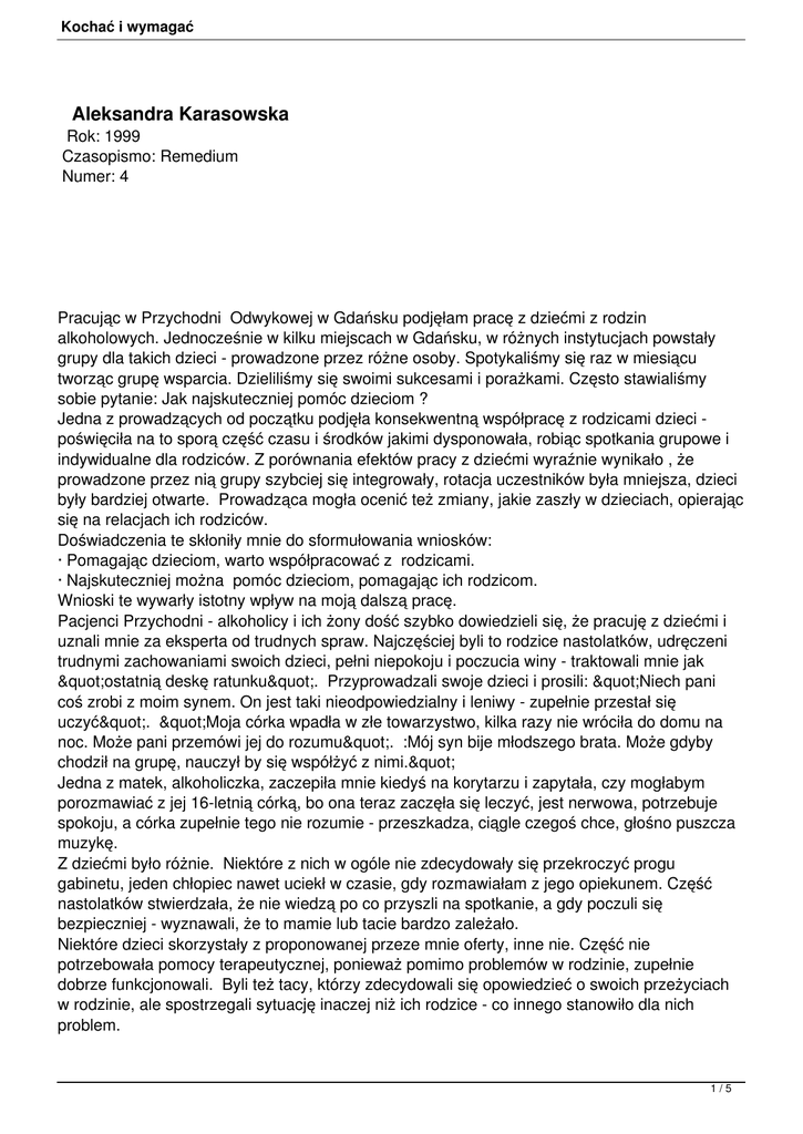 Kochać i wymagać Aleksandra Karasowska Rok: 1999 Czasopismo: Remedium Numer: 4 Pracując w Przychodni Odwykowej w Gdańsku podjęłam pracę z dziećmi z rodzin alkoholowych. Jednocześnie w kilku miejscach w Gdańsku, w różnych instytucjach powstały grupy dla takich dzieci - prowadzone przez różne osoby. Spotykaliśmy się raz w miesiącu tworząc grupę wsparcia. Dzieliliśmy się swoimi sukcesami i porażkami. Często stawialiśmy sobie pytanie: Jak najskuteczniej pomóc dzieciom ? Jedna z prowadzących od początku podjęła konsekwentną współpracę z rodzicami dzieci poświęciła na to sporą część czasu i środków jakimi dysponowała, robiąc spotkania grupowe i indywidualne dla rodziców. Z porównania efektów pracy z dziećmi wyraźnie wynikało , że prowadzone przez nią grupy szybciej się integrowały, rotacja uczestników była mniejsza, dzieci były bardziej otwarte. Prowadząca mogła ocenić też zmiany, jakie zaszły w dzieciach, opierając się na relacjach ich rodziców. Doświadczenia te skłoniły mnie do sformułowania wniosków: · Pomagając dzieciom, warto współpracować z rodzicami. · Najskuteczniej można pomóc dzieciom, pomagając ich rodzicom. Wnioski te wywarły istotny wpływ na moją dalszą pracę. Pacjenci Przychodni - alkoholicy i ich żony dość szybko dowiedzieli się, że pracuję z dziećmi i uznali mnie za eksperta od trudnych spraw. Najczęściej byli to rodzice nastolatków, udręczeni trudnymi zachowaniami swoich dzieci, pełni niepokoju i poczucia winy - traktowali mnie jak "ostatnią deskę ratunku". Przyprowadzali swoje dzieci i prosili: "Niech pani coś zrobi z moim synem. On jest taki nieodpowiedzialny i leniwy - zupełnie przestał się uczyć". "Moja córka wpadła w złe towarzystwo, kilka razy nie wróciła do domu na noc. Może pani przemówi jej do rozumu". :Mój syn bije młodszego brata. Może gdyby chodził na grupę, nauczył by się współżyć z nimi." Jedna z matek, alkoholiczka, zaczepiła mnie kiedyś na korytarzu i zapytała, czy mogłabym porozmawiać z jej 16-letnią córką, bo ona teraz zaczęła się leczyć, jest nerwowa, potrzebuje spokoju, a córka zupełnie tego nie rozumie - przeszkadza, ciągle czegoś chce, głośno puszcza muzykę. Z dziećmi było różnie. Niektóre z nich w ogóle nie zdecydowały się przekroczyć progu gabinetu, jeden chłopiec nawet uciekł w czasie, gdy rozmawiałam z jego opiekunem. Część nastolatków stwierdzała, że nie wiedzą po co przyszli na spotkanie, a gdy poczuli się bezpieczniej - wyznawali, że to mamie lub tacie bardzo zależało. Niektóre dzieci skorzystały z proponowanej przeze mnie oferty, inne nie. Część nie potrzebowała pomocy terapeutycznej, ponieważ pomimo problemów w rodzinie, zupełnie dobrze funkcjonowali. Byli też tacy, którzy zdecydowali się opowiedzieć o swoich przeżyciach w rodzinie, ale spostrzegali sytuację inaczej niż ich rodzice - co innego stanowiło dla nich problem. 1/5 Kochać i wymagać Jako ekspert od dzieci znalazłam się w trudnej sytuacji - nie byłam w stanie spełnić oczekiwań rodziców. W większości przypadków to właśnie rodzice mieli problem z zachowaniem swoich dzieci, ale nie mogli sobie z nim poradzić. Zdesperowani, próbowali oddać część swoich kompetencji rodzicielskich ekspertowi, mając nadzieję, że będzie on w stanie wywrzeć na nie oczekiwany wpływ. Dla mnie to był bardzo ważny moment. Postanowiłam oddać rodzicom odpowiedzialność za wychowanie ich własnych dzieci i oferując pomoc, zachęcić ich do pracy nad rozwiązaniem problemów. Okazja nadarzyła się podczas obozu terapeutycznego dla alkoholików i rodzin. Przemówiłam do zgromadzonych tam osób, zapewniając ich, że jako rodzice - są najważniejszymi osobami w życiu swoich dzieci, a ja nie jestem w stanie ich zastąpić, bo to oni właśnie mają na nie największy wpływ. Rodzice słuchali uważnie - a potem zaczęli wyrażać swoją bezradność: "Próbowałem już tylu sposobów, ale na niego nic nie działa" "Mój ojciec mnie bił, a ja nie chcę bić dzieci i dlatego mi wchodzą na głowę. Nie wiem jak z nimi postępować, żeby ich nie krzywdzić". "Gdy piłem - straciłem szacunek u dzieci . Teraz mnie nie słuchają" "Moja córka mnie lekceważy , dla niej liczą się tylko koleżanki". Przyznałam rodzicom rację - wychowanie dzieci to bardzo trudne zadanie. powiedziałam, że należy im się wsparcie i dlatego zamierzam otworzyć "Szkołę dla rodziców", w której będą mogli rozwijać swoje umiejętności wychowawcze. Rodzice rozliczyli mnie z tego zobowiązania - tym razem to oni zaczepiali mnie na korytarzu przychodni i pytali kiedy będzie ta "Szkoła". Nie miałam wyjścia - kilka miesięcy po tym obozie rozpoczęłam pierwszy cykl zajęć. Pracując z dziećmi i ich rodzicami, często spotykałam się z przypadkami wycofywania się przez rodziców z roli rodzicielskiej wobec własnych dzieci. Myślę tu nie tylko o skrajnych przypadkach odrzucania czy zaniedbywania dziecka. Moje obserwacje dotyczyły też przeciętnych rodziców, którzy angażowali się w wychowanie najlepiej jak umieli. Jednak często nie dostrzegali problemów, które przeżywało ich dziecko, a w sytuacjach konfliktowych mieli tendencje do wycofywania się. Wielokrotnie stawiałam sobie pytanie, dlaczego tak się dzieje, dlaczego rodzice wycofują się, chociaż dzieci ich potrzebują. W swojej praktyce nie spotkałam rodzica, któremu byłby obojętny los i szczęście własnego dziecka. Nawet ci, którzy nie okazywali dziecku uczuć - w głębi serca na swój sposób kochali je. Przyczyn takiego zjawiska może być wiele, jednak niektóre z nich zasługują na szczególną uwagę. Osobiste problemy rodziców Jednymi z najbardziej oczywistych przyczyn były osobiste problemy rodziców: alkoholizm, współuzależnienie, inne przewlekłe choroby, nierozwiązane problemy emocjonalne z dzieciństwa, problemy małżeńskie, 