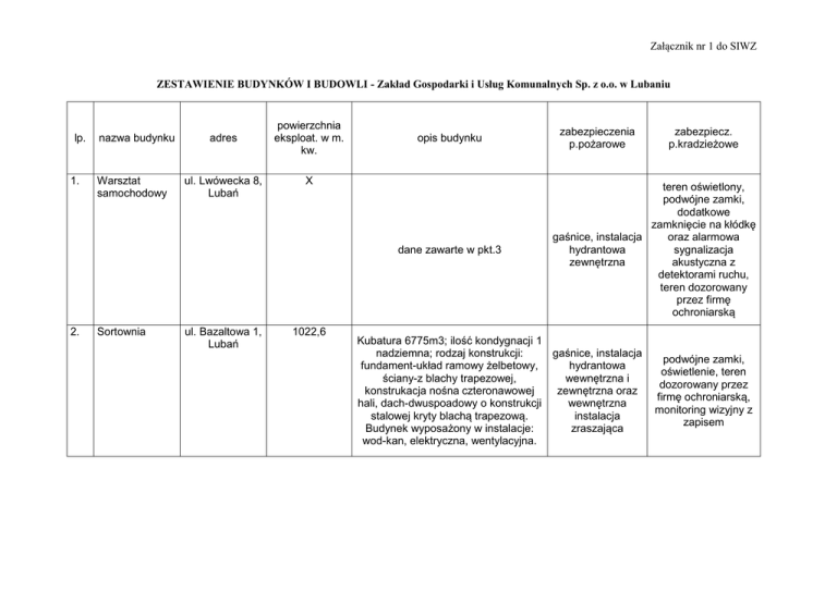 Załącznik nr 1 do SIWZ ZESTAWIENIE BUDYNKÓW I BUDOWLI - Zakład Gospodarki i Usług Komunalnych Sp. z o.o. w Lubaniu lp. 1. nazwa budynku Warsztat samochodowy adres ul. Lwówecka 8, Lubań powierzchnia eksploat. w m. kw. opis budynku X dane zawarte w pkt.3 2. Sortownia ul. Bazaltowa 1, Lubań 1022,6 zabezpieczenia p.pożarowe zabezpiecz. p.kradzieżowe teren oświetlony, podwójne zamki, dodatkowe zamknięcie na kłódkę gaśnice, instalacja oraz alarmowa hydrantowa sygnalizacja zewnętrzna akustyczna z detektorami ruchu, teren dozorowany przez firmę ochroniarską Kubatura 6775m3; ilość kondygnacji 1 nadziemna; rodzaj konstrukcji: gaśnice, instalacja fundament-układ ramowy żelbetowy, hydrantowa ściany-z blachy trapezowej, wewnętrzna i konstrukacja nośna czteronawowej zewnętrzna oraz hali, dach-dwuspoadowy o konstrukcji wewnętrzna stalowej kryty blachą trapezową. instalacja Budynek wyposażony w instalacje: zraszająca wod-kan, elektryczna, wentylacyjna. podwójne zamki, oświetlenie, teren dozorowany przez firmę ochroniarską, monitoring wizyjny z zapisem 3. Budynek warsztatowomagazynowy ul. Bazaltowa 1, Lubań 298,6 4. Garaż I ul. Lwówecka 8, Lubań 295,65 5. Garaż II 6. Garaż III 7. Budynek /skład/ Kubatura 1581m3; ilość kondygnacji 1 teren oświetlony, nadziemna; rodzaj konstrukcji: ścianypodwójne zamki, pustak ceramiczny, dachgaśnice, instalacja dodatkowe dwuspoadowy o konstrukcji stalowej hydrantowa zamknięcie na kłódkę kryty blachą trapezową. Budynek zewnętrzna teren dozorowany wyposażony w instalacje: wod-kan, przez firmę elektryczna, wentylacyjna. ochroniarską Kubatura 1501m3; ilość kondygnacji 1 teren oświetlony, nadziemna (brak piwnicy); rodzaj podwójne zamki, konstrukcji: fundamenty-kamień gaśnice, instalacja dodatkowe łamany, ściany-cegła ceramiczna hydrantowa zamknięcie na kłódkę pełna, dach-stropodach kryty papą. zewnętrzna , teren dozorowany Budynek wyposażony w instalacje: przez firmę c.o., elektryczna. ochroniarską Obiekt wchodzący w obrys poz.3 8. 9. 10. Budynek biurowy ul. Lwówecka 8, Lubań Budynek socjalnobiurowy Budynek ul. Bazaltowa 1, administracyjnoLubań socjalny 58,33 Kubatura 292m3; ilość kondygnacji 1 nadziemna, 1 podziemna; rodzaj konstrukcji: fundamenty-cegła, ścianygaśnice, instalacja cegła, stropy-drewniane, dachhydrantowa drewniany kryty papą, schodyzewnętrzna betonowe,ceglane. Budynek wyposażony w instalacje: wod-kan, c.o., elektryczna. 112,9 Kubatura 702m3; ilość kondygnacji 1 nadziemna (brak piwnicy); rodzaj konstrukcji: fundamenty-kamień łamany, ściany-z cegły, stropydrewniane, dach-drewniany kryty papą. Budynek wyposażony w instalacje: wod-kan, c.o., elektryczna. 244,2 gaśnice, instalacja hydrantowa zewnętrzna Kubatura 1043m3; ściany-pustak ceramiczny, dach-stropodach żelbetowy i belkowo pustakowy, pokrycie dachu-płyty korytkowe. Budynek wyposażony w instalacje: gaśnice, instalacja wod-kan, elektryczna, gazowa propan. hydrantowa Z budynkeim konstrukcyjnie związana zewnętrzna jest wiata osłaniająca wagę samochodową - wiata o konstrukacji stalowej, pokrycie blacha trapezowa (powierzchnia zadaszona 275m2). teren oświetlony podwójne zamki, teren dozorowany przez firmę ochroniarską teren oświetlony,podwójne zamki, dodatkowe zamknięcie oraz alarmowa sygnalizacja akustyczna z detektorami ruchu, teren dozorowany przez firmę ochroniarską podwójne zamki, oświetlenie, teren ogrodzony i dozorowany przez firmę ochroniarską 11. 12. 13. 14. Kwatera odpadów Instalacja do odprowadzania gazu Budynek biurowy (na cmentarzu komunalnym) ul. Wrocławska 21, Lubań Wiata ul. Lwówecka 8, Lubań 135,2 Kwatera składowania zmieszanych odpadów komunalnych o pojemności 460 000 m3 instalacja hydrantowa zewnętrzna teren oświetlony i dozorowany przez firmę ochroniarską, monitoring wizyjny z zapisem 5 studni odgazowujących kwaterę połączonych oddzielnymi rurociagami ze stacją kontenerową wyposażoną w urządzenia pomiarowe oraz ssawodmuchawę i wysokotemperaturową pochodnię. detektory gazu, sygnalizacja świetlna i akustyczna, gaśnice, instalacja nawiewnowywiewna,zawory odcinające dopływ gazu teren ogrodzony, oświetlony i dozorowany przez firmę ochroniarską, kontener zamkniety. Kubatura 1089m3; ilość kondygnacji 2 nadziemne, 1 podziemna; rodzaj konstrukcji: fundamenty-z cegły ściany-z cegły, stropy-drewniane, dach-drewniany kryty dachówką, schody-drewnaine i kamienne. Budynek wyposażony w instalacje: wod-kan, c.o., elektryczna, gazowa. gaśnice, teren ogrodzony, zamykany na noc obiekt niepalny teren ogrodzony, oświetlony, dozorowany przez firmę ochroniarską. konstrukcja stalowa, pokrycie blachą trapezowa ocynk, pow. użytkowa 125 m2, konstrukacja stalowa malowana farbą olejną 15. 16. 17. Kaplica cmentarna ul. Wrocławska 21, Lubań Kubatura 1241,54.; ilość kondygnacji 2 nadziemne, 1.podziemna; rodzaj konstrukcji: , dach-drewniany kryty papą oraz dachówką cementową, schody zewnętrzne-kamienne. Budynek wyposażony w instalacje: wod-kan, elektryczna, odgromowa. Prosektorium Budynek administracyjny Ul. Bankowa 8, Lubań opis wspólny z pkt.16 ilość kondygnacji 2 nadziemne, 1.podziemna; rodzaj konstrukcji: , dach-drewniany kryty dachówką ceramiczną i papą , schody zewnętrzne-kamienne. Budynek wyposażony w instalacje: wod-kan, elektryczna, odgromowa, co i cw, tel., gaśnice teren ogrodzony, zamykany na noc gaśnice teren ogrodzony, zamykany na noc gaśnice teren ogrodzony, oświetlony i dozorowany przez firmę ochroniarską,