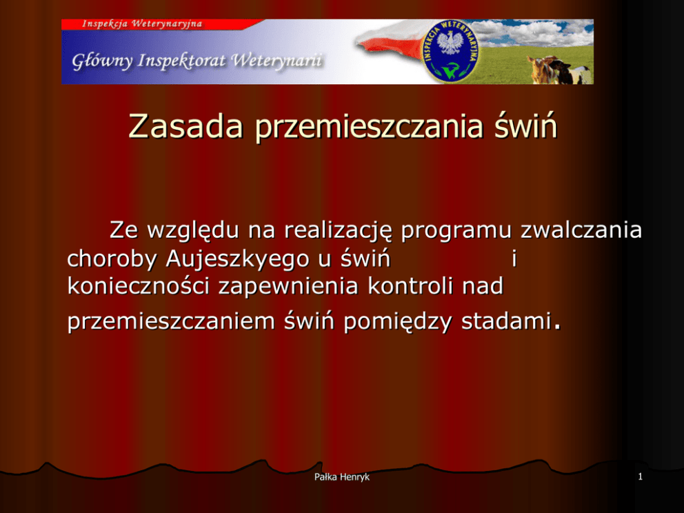 Zasada przemieszczania świń Ze względu na realizację programu zwalczania choroby Aujeszkyego u świń i konieczności zapewnienia kontroli nad przemieszczaniem świń pomiędzy stadami. Pałka Henryk 1 Nie wymaga się świadectw zdrowia świń Na transport świń ze stad w których nie stwierdzono choroby Aujeszkyego i kierowane są bezpośrednio lub poprzez punkt skupu do uboju w rzeźni. Pałka Henryk 2 Świadectwo zdrowia dla świń jest wymagane Przy przesyłce świń hodowlanych i użytkowych do innych stad. Przy przesyłce nasienia do stad położonych na terenie Polski. Przy przesyłce świń do uboju w rzeźni ze stad: zakażonych wirusem choroby Aujeszkyego, ze stad podejrzanych o zakażenie tym wirusem, ze stad zawieszonych, ze stad szczepionych przeciw chorobie Aujeszkyego. Pałka Henryk 3 Stada świń do których wprowadzono zwierzęta lub nasienie bez towarzyszących świadectw zdrowia będą uznane za podejrzane o zakażenie i będą objęte powtórnym badaniem krwi od świń na koszt właściciela. Pałka Henryk 4 Dlatego kupując świnie lub nasienie świń należy żądać od ich właściciela świadectwo zdrowia świń. Pałka Henryk 5 Kto wystawia świadectwa zdrowia ? Świadectwo zdrowia dla świń wystawia urzędowy lekarz świadczący usługi na terenie gospodarstwa po uprzednim: - sprawdzeniu statusu zdrowotnego stada, - pochodzenia świń, - statusu stada, - przeznaczenia świń. Pałka Henryk 6 W związku z tym hodowcy trzody chlewnej planujący wysyłkę świń do innego gospodarstwa, powinni odebrać decyzję Powiatowego Lekarza Weterynarii o statusie zdrowotnym gospodarstwa. Decyzję można odebrać w Powiatowym Inspektoracie Weterynarii od poniedziałku do piątku w godz. 8.00 – 15.00 Pałka Henryk 7 Warunkiem wydania świadectwa zdrowia świń jest przemieszczenie Stada nie przebadane mogą przemieszczać świnie wyłącznie do stad nie przebadanych Stada potencjalnie wolne do potencjalnie wolnych. Stada potencjalnie wolne do innych stad potencjalnie wolnych lub do stad do tej pory nie przebadanych. Stada seronegatywnych do stad seronegatywnych, potencjalnie wolnych oraz nie przebadanych. Stada urzędowo wolne mogą wysyłać świnie do wszystkich stad Pałka Henryk 8